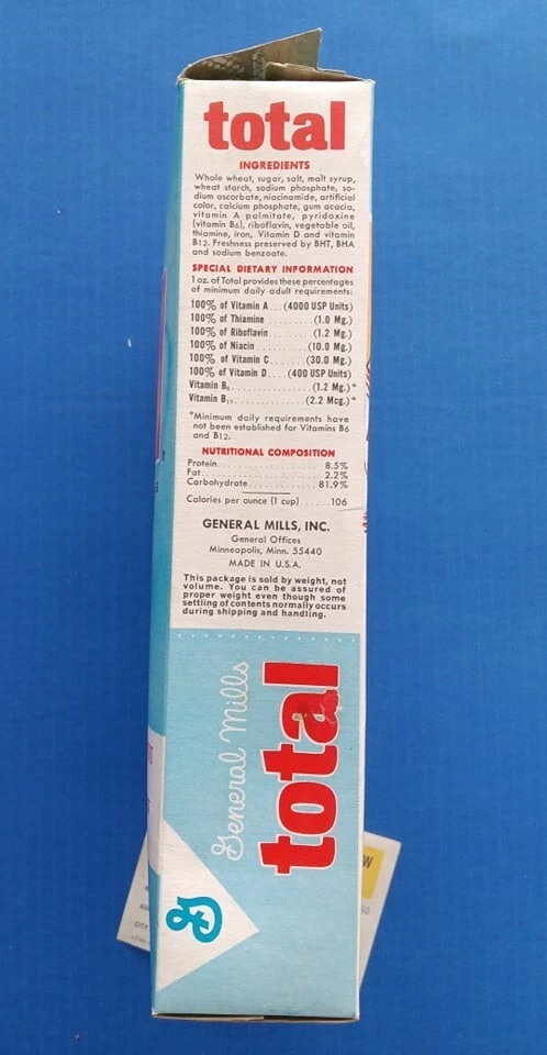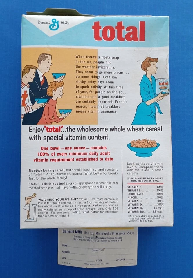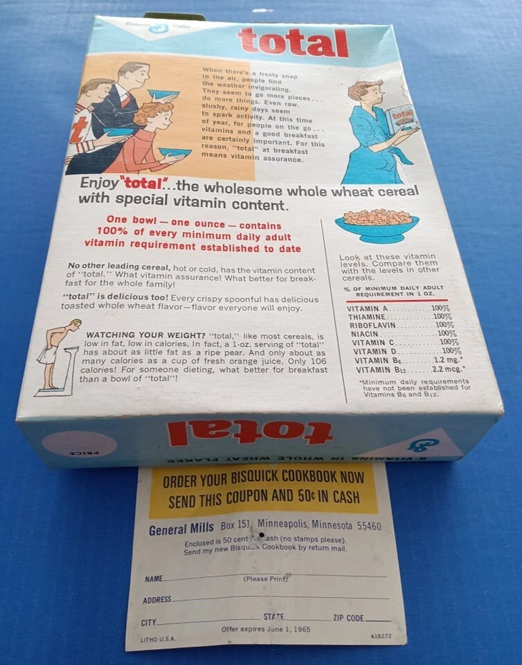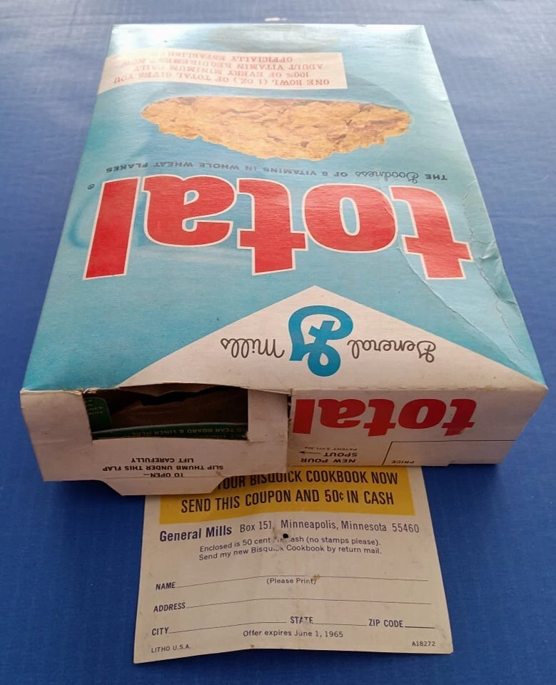 Mid 1960s (1964?) General Mills Total cereal box with Betty Crocker Bisquick cookbook coupon included! Tough to find box! Box is in average used condition, with a sealed bottom and a clipped Betty Crocker seal. See photos. US auction only. I can combine similar auction items to save on shipping! See my other auctions for more cool stuff!!!