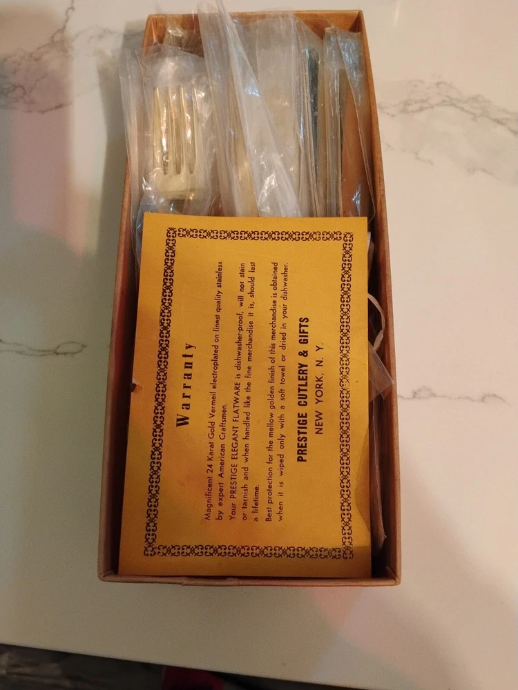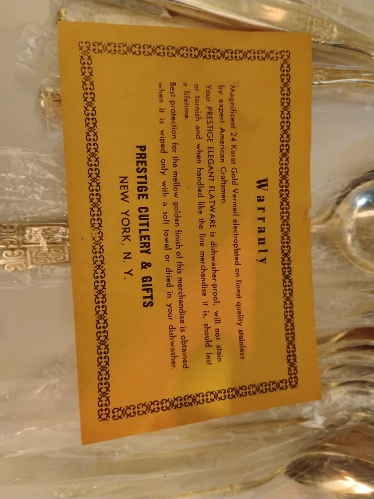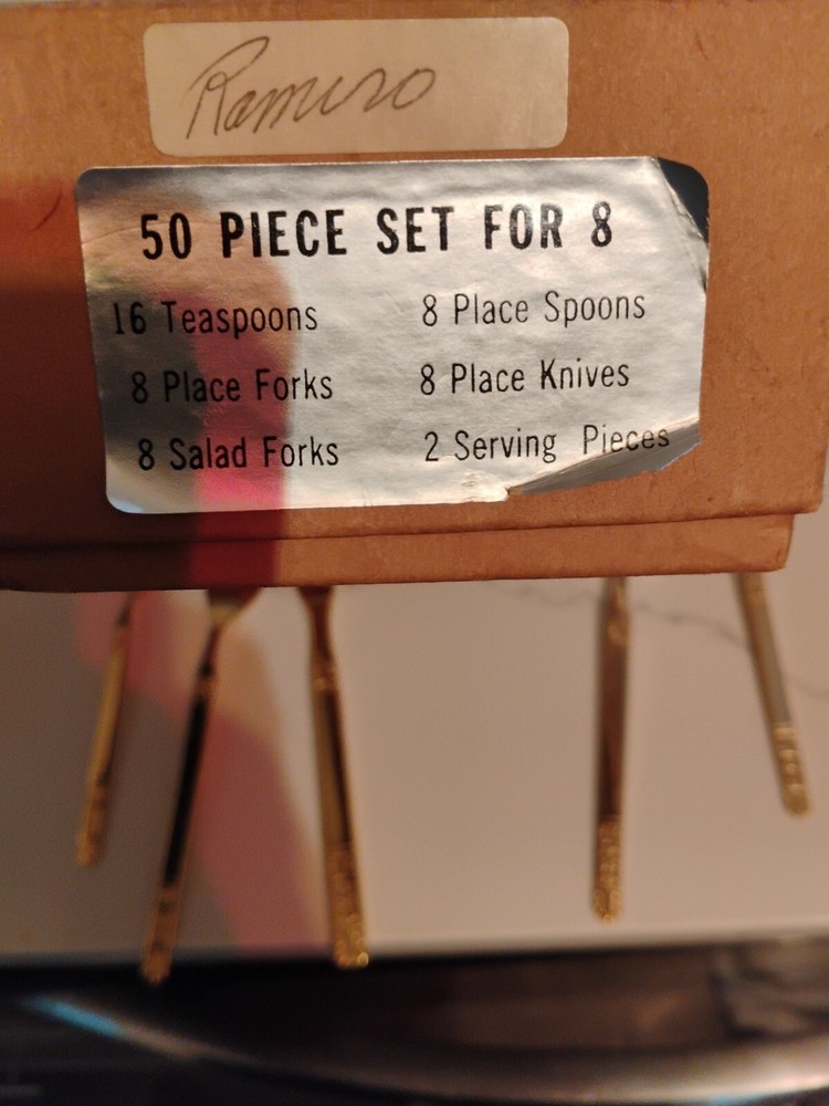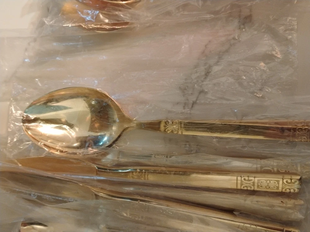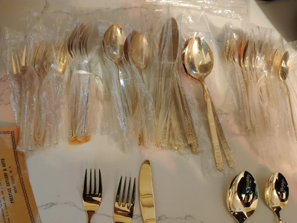 Here is an absolutely stunning 50 piece set. It's mid century Japanese 24k gold plated. Says " Continental" engraved on each piece. Along with Japan. The pattern is an extremely rare one, and be hard pressed to find the very same exact one. Never been used. I misplaced 2 of the ties when counting and showing them. Perfect time to show off this must have set for the holidays. Show off your good taste , as well as your knowledge quality. Please feel free to look at my current and future listings. More to come. Thank you. God Bless. No Reserve. Best offer