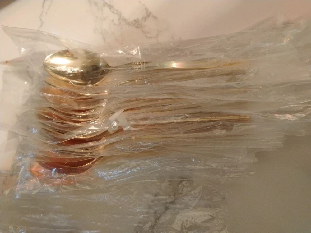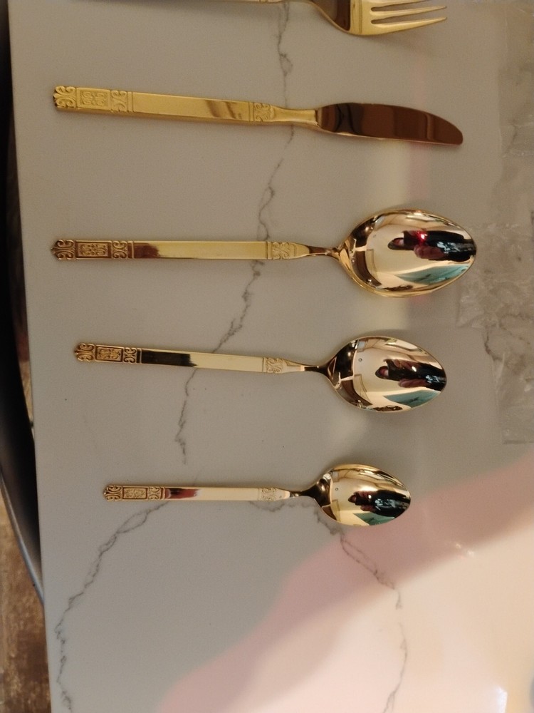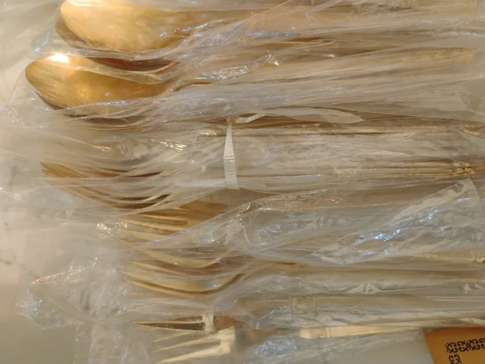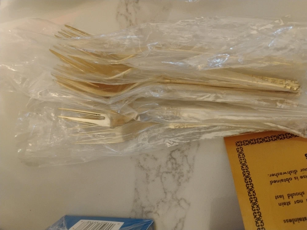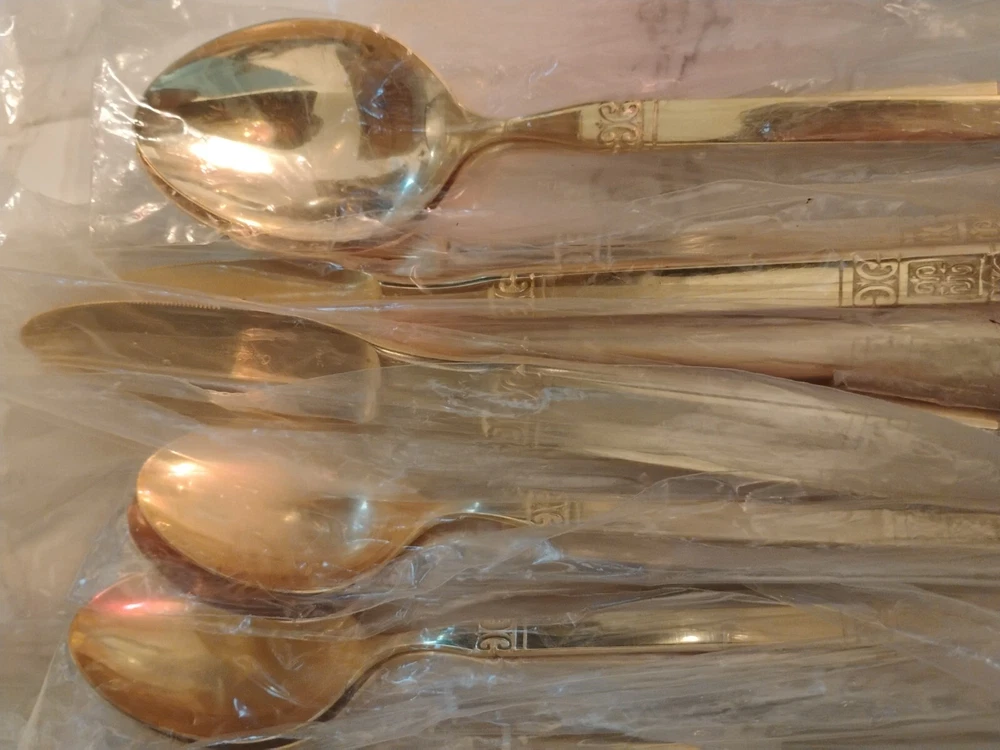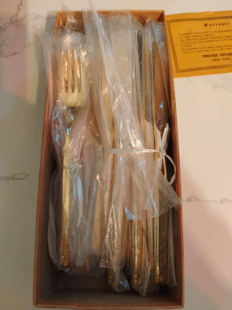 Here is an absolutely stunning 50 piece set. It's mid century Japanese 24k gold plated. Says " Continental" engraved on each piece. Along with Japan. The pattern is an extremely rare one, and be hard pressed to find the very same exact one. Never been used. I misplaced 2 of the ties when counting and showing them. Perfect time to show off this must have set for the holidays. Show off your good taste , as well as your knowledge quality. Please feel free to look at my current and future listings. More to come. Thank you. God Bless. No Reserve. Best offer