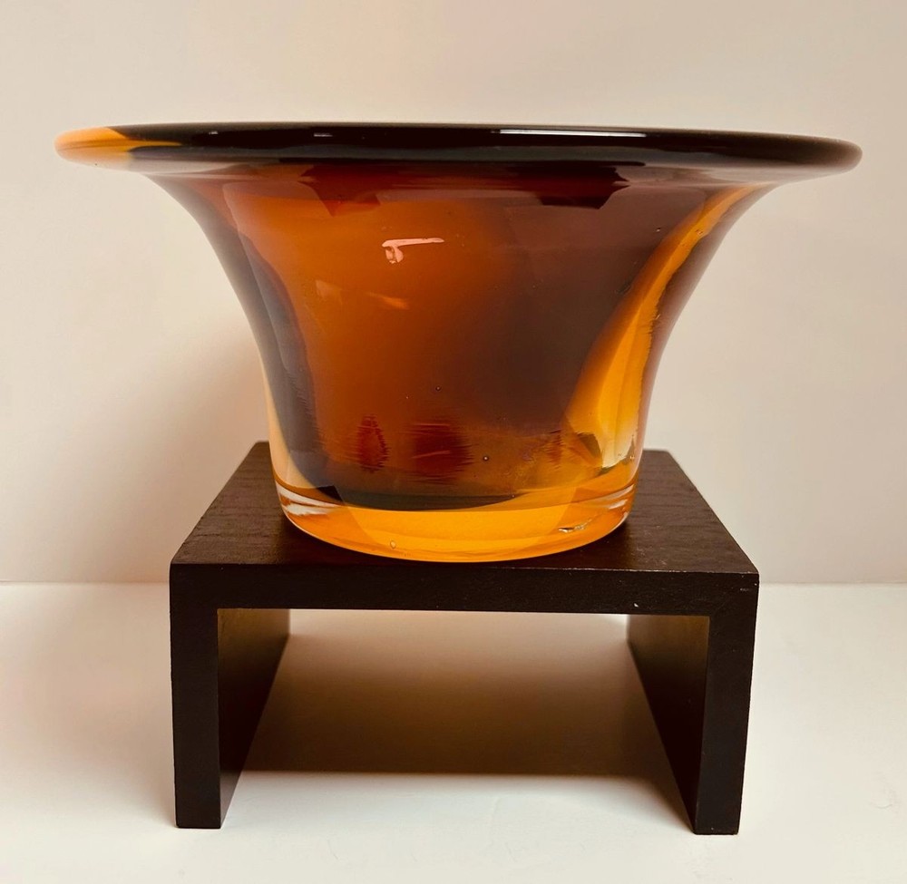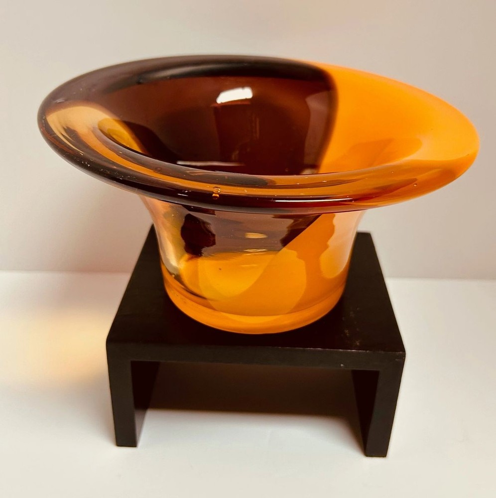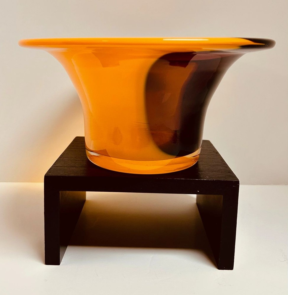 Elevate your home decor with this stunning Mid Century Cased Art Glass Fluted Bowl/Vase in vibrant orange, purple, and brown hues. Perfect for adding a pop of color. The vase is 4" tall and is 8 1/4" wide at the rim. Shipping $19.99.