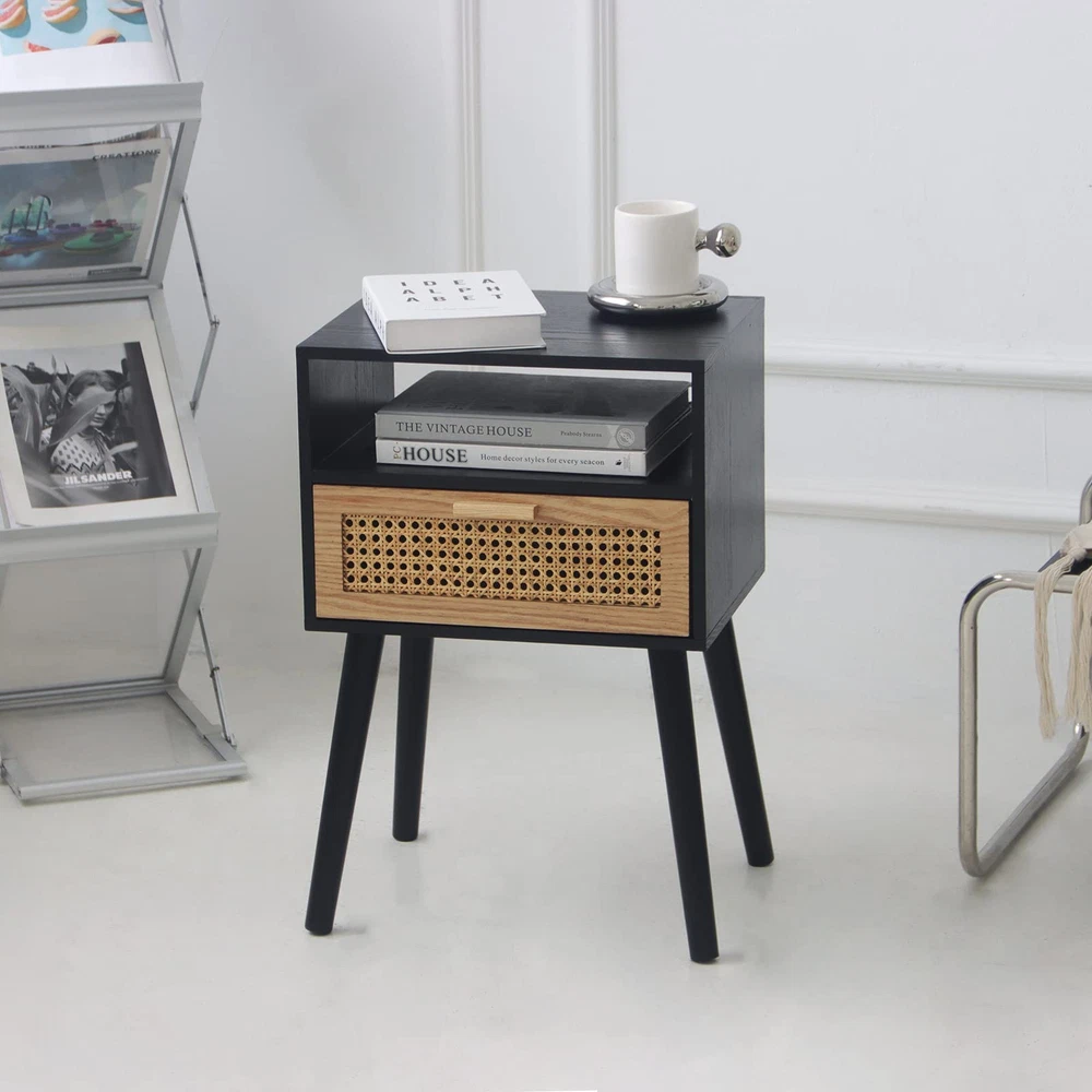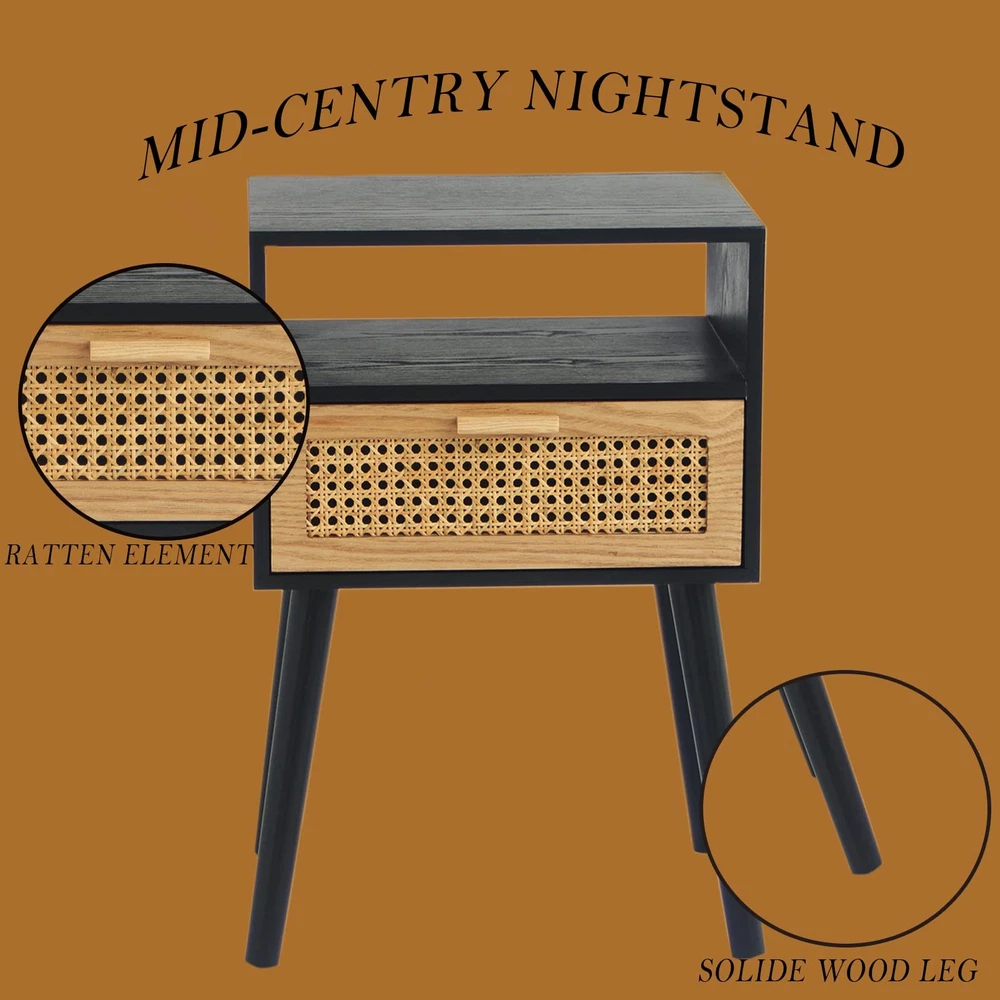 Side Table Modern Side Table The let's style meets functions with the bedside tabble. The nightstand characterized with durable frame and modern minimalist style to fit with any home decor and make the home looks snug and stylish. Widely Used Perfect as a side table, small nightstand for bedroom, end table at indoor and outdoor, such as living room, balcony, small space, and concern. Specification: Color: Black Material: MDF & Solid Wood Size: 11.8'' D x 15.7'' W x 23.6'' H Weight: Weight: 17.6lb/8kg FEATURES: Walnut Tabletop: Its smooth and walnut color surface, the side table is easy to clean and won’t be fade. Top shelf : The unique top shelf offers more space to hold essential items, such as books, plants. Rattan Drawer : The rattan drawer with handmade weaving technology, delivering elegant apparent effection add snugging to your home and offer large storage space. Convenient End Table: The mid century nightstand design with light-weight and compact size can be easily and conveniently moved to any place you want. And easy to assemble. Stylish and Practical Storage: The bedside table features a two-tier storage design, a unique extra top shelf and a spacious tabletop with a natural rattan drawer to fit your snug home and provide more space to put down books, snacks, drinks Easy to assemble: The nightstand's instruction is easy to read, the process of assembling is simple and easy to follow with detailed steps. When installing the screws, Do not use Electric Screwdriver, Please screw it by manually and be carefully Sturdy Side Table: The solid wood legs, elegant square tabletop, walnut colour surface and natural rattan constituted this mid century nightstand. It is ready to hold everything you need with easy reach. Ideal as a sofa table, corner table, nightstand, coffee table, bedside table, laptop desk, lamp table for your living room, bedroom, hallway, or office Premium Material: The sturdy solid wood and premium density board of this accent table ensure years of use and long-term stability; low-impact coating keeps the nightstand looking artistic for long time use and easy to clean Specifications: The overall dimensions of the modern nightstand: 11.8''D x 15.7''W x 23.6''H. The rattan drawer dimensions: 9.4''D x14''W x 4.7''H. If you have any problem, do not to hesitate to reach out to us. team offer 24-hours after-sales service, we are aimed to provide a wonderful shopping experience