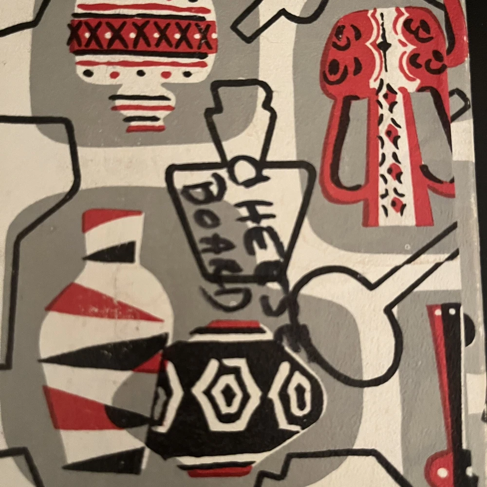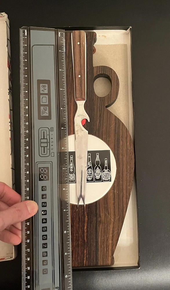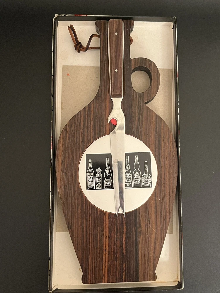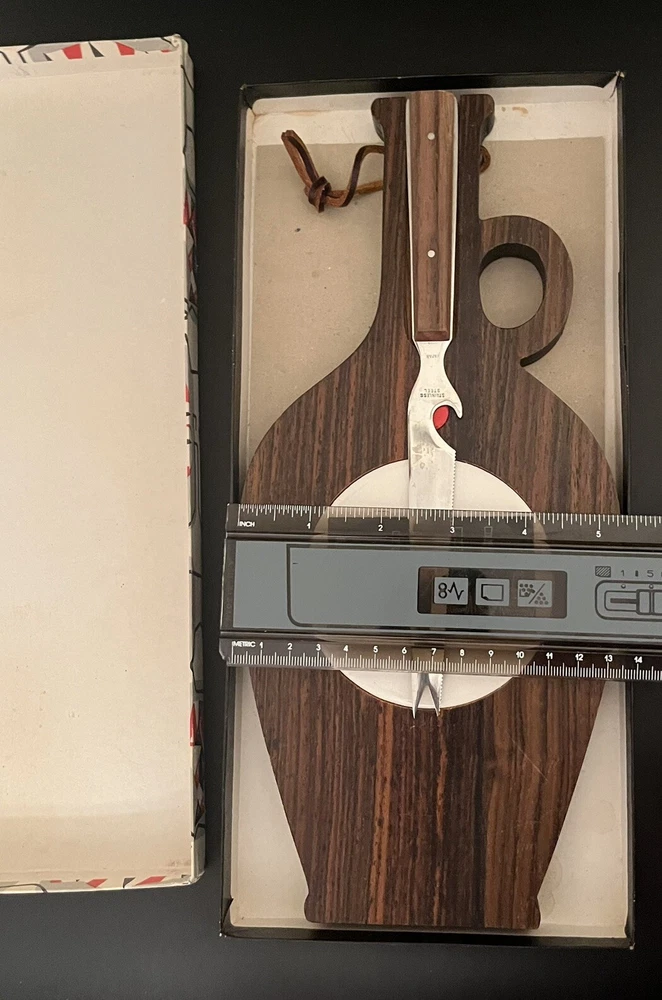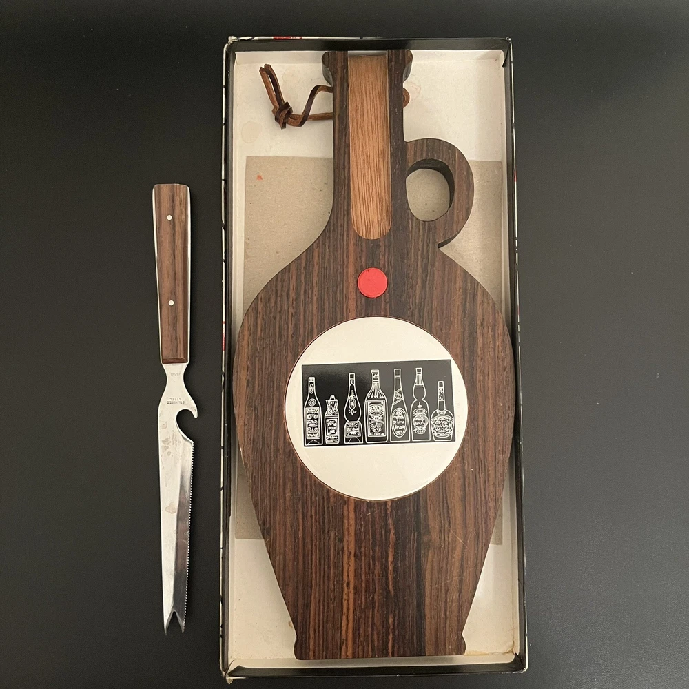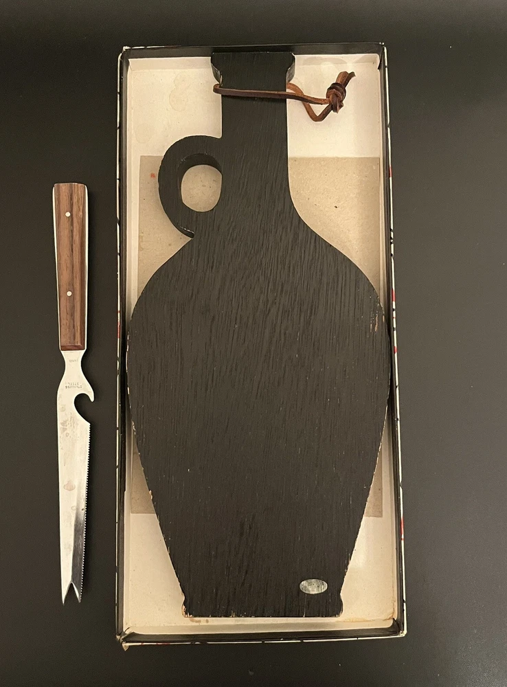 Mid Century Hardwood & Tile Cheese Board Charcuterie with Knife & Original Box. BOX HAS SOME WRITING ON IT - see photos. Knife has some staining a see photos. Made in JAPAN.