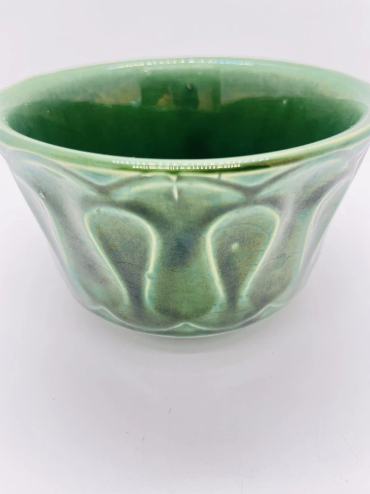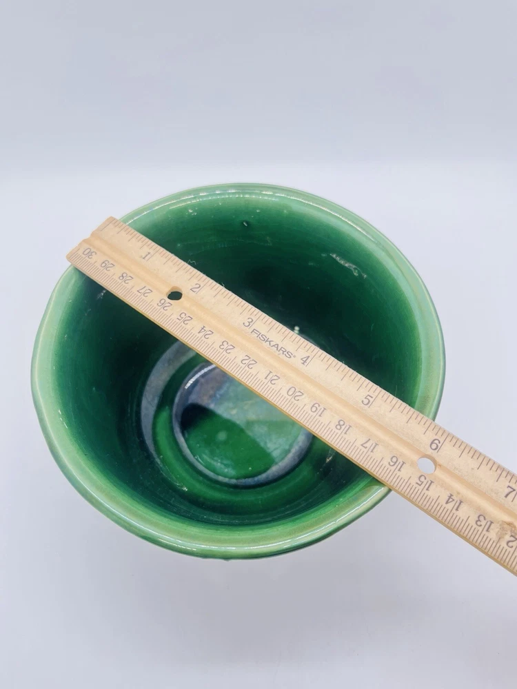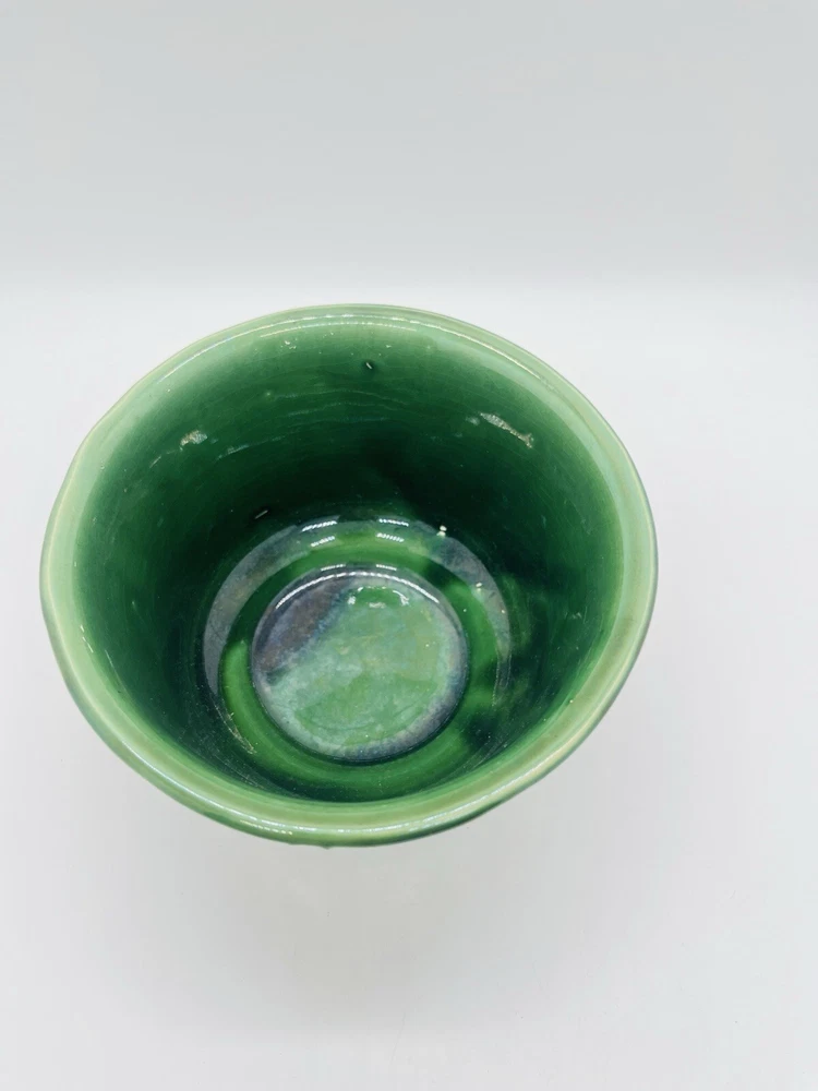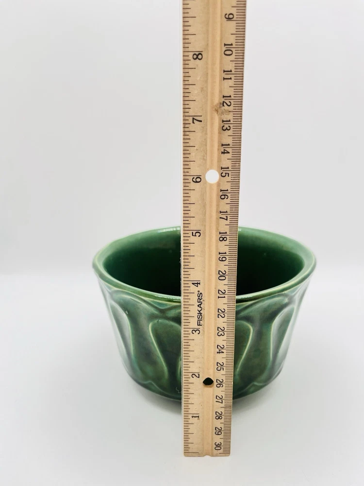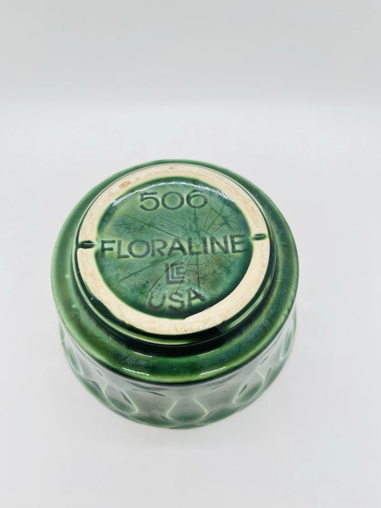 This vintage McCoy Pottery planter features a beautiful deep green glossy finish with a solid drip glaze pattern. The round shape and 3.5 inch height make it a perfect addition to any indoor or outdoor space. Handmade in California during the mid 20th century, this original piece is a great representation of the art pottery production style. The planter is incised with the brand's backstamp and is part of the 506 product line. It measures 6 inches in width and is made of ceramic material. The Loop/Wave design adds a touch of Mid Century Modern style to any decor. This piece is a great find for collectors and enthusiasts of vintage pottery.