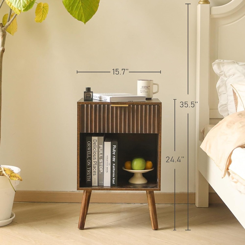 Mid Century Modern Nightstand, Wood Bedside Table with Drawer Rustic Brown Product Details Brand: Fultyle Product Dimensions: 11.8"D x 15.7"W x 24.4"H Color: Rustic Brown Shape: Rectangular Table design: Nightstand Frame MaterialTop Material Type: Engineered Wood, WoodEngineered Wood Spacious Storage Space: This nightstand is designed for the home organizer, with a drawer and a large opening storage space, providing roomy storage space for books, fruit, plants, and essential items. Also, the roomy modern nightstand tabletop is a nice choice for displaying photo frame, cup, lamp or alarm clock Superior Quality: This modern nightstand is made from high-density MDF boards and solid wood legs. The four legs of bedside table are designed to be slanted instead of vertical, which provides more area to prevent sliding and tilting, and ensures durability and stability for long-term use Chic Fluted Nightstand: The charming walnut grain, smooth surface, metal handle, and curved drawer create this mid century modern nightstand. The fluted drawer is corrugated, which makes this wood bedside table more unique and stylish, while the metal drawer handle matches natural legs, and exudes a vibe of elegance Multipurpose Nightstand: The demensions of the nightstand: 11.8''D×15.7''W×24.4''H. This bedside table with curved drawer provides a pefect size to match any variety of furniture. It is pefect as a coffee table, bedside table, end table, sofa side table living room and nightstand for bedroom Easy to Assemble: This nightstand comes with detailed instrution, clear marks and all the necessary parts, ensuring fast and effortless assembly. Quickly, you will get a stylish and practical nightstand at your home. If you have any issues, please don't hesitate to reach out to us – we're here to assist you every step of the way