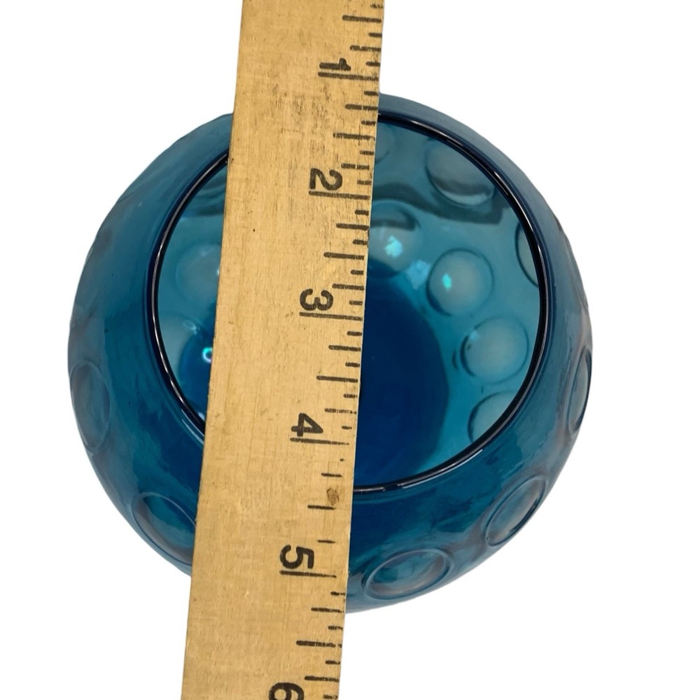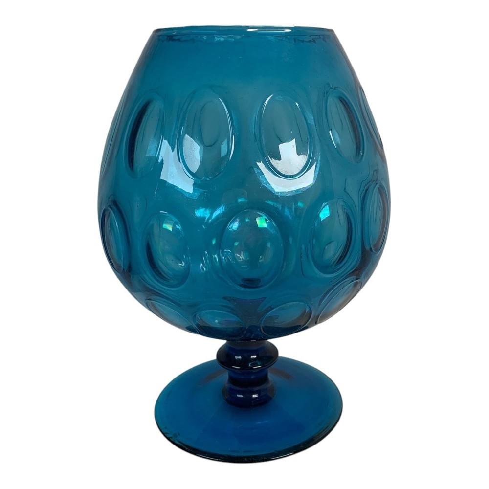 Mid-Century Blue Glass Empoli Style Thumbprint Pedestal Compote Vase 8” ⸻ Description: Make a bold, blue statement with this stunning mid-century modern pedestal compote vase! Featuring a rich teal blue hue with classic thumbprint (or coin dot) pattern, this piece brings that perfect pop of color to your vintage decor, whether you’re using it as a candy dish, planter, or centerpiece ready for its disco ball moment. • Stands approximately 8” tall • Beautiful Empoli-style design, likely Italian art glass • Rounded globe shape with flared footed base Condition: Pre-owned with light wear from display, no chips or cracks noted. A little vintage patina that says, “I’ve been fabulous for decades.” ⸻ Shipping: Calculated shipping with next business day handling.