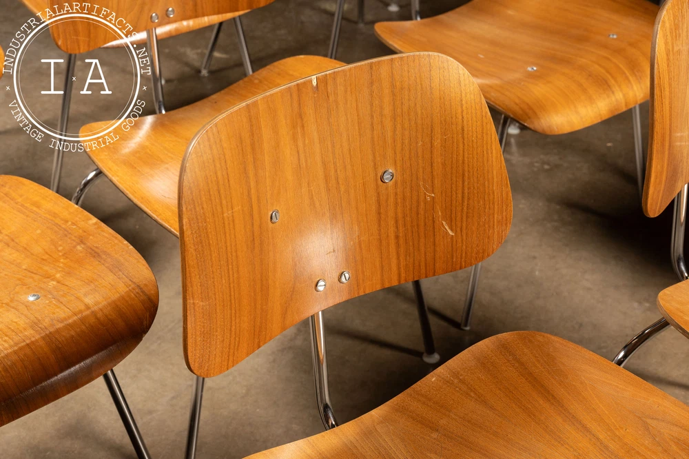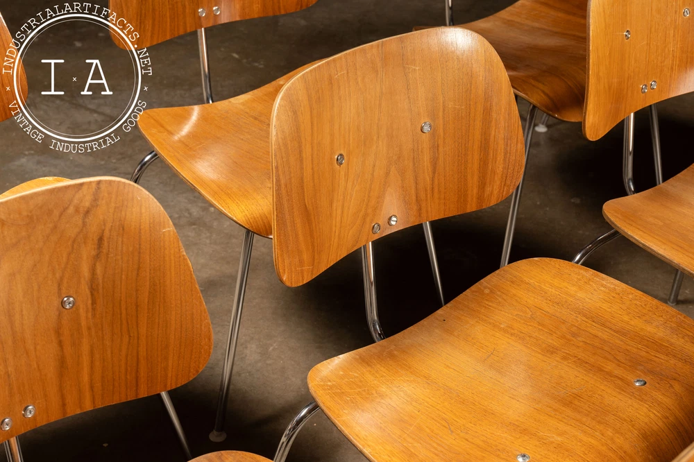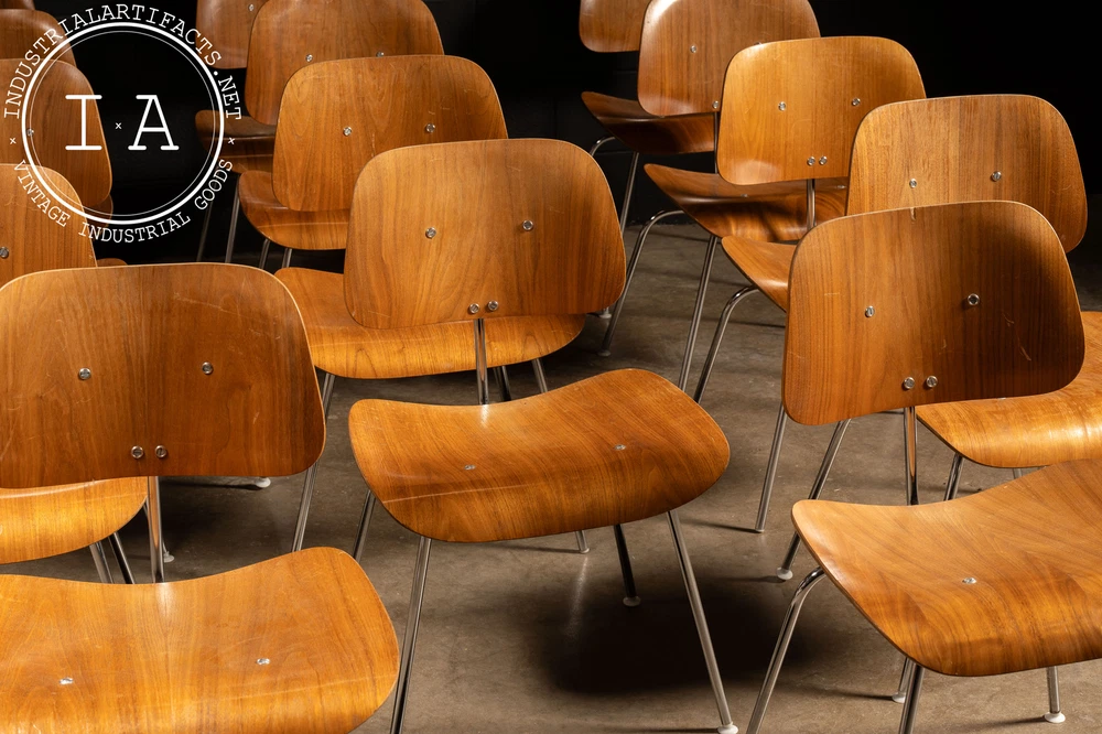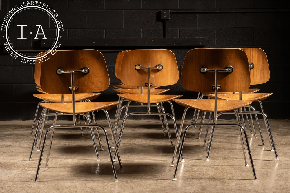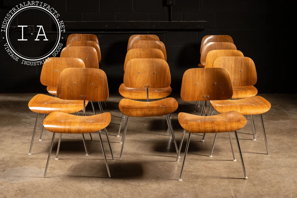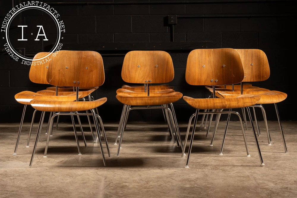 c. 1940s - 1950s; Herman Miller Inc. - Zeeland, MI Nutwood and chrome DCM (Dining Chair Metal) dining chair designed by Charles and Ray Eames in 1946 for Herman Miller. This iconic chair features the classic mid-century look people have come to associate with Eames. It features a molded walnut veneer supported by a polished chrome frame. These chairs all have some measure of damage, including holes through the seats, holes through the back rests, additional supports added, missing feet glide components, as well as other miscellaneous damage. All chairs are sold as is. Listed individually, but please contact us to buy the full set (15). 20.5" W x 20.5" D x 29.5" H Seat: 17" H Please refer to photos regarding condition. For more info regarding delivery of your order, please review our shipping Terms and Conditions. MM - 6626 - 121423 TERMS & CONDITIONS PARCEL SHIPPING We offer free shipping to the continental US on smaller items. All parcel packages are fully insured and shipped through USPS or UPS. FREIGHT SHIPPING NOTE: All shipments are considered Free on Board (FOB), meaning the buyer assumes all responsibility for the shipment the moment it leaves our loading dock. Any damages or loss that may occur after this point are the buyer's responsibility. In the event of damage or loss, we are happy to assist buyers in the claims process if we helped coordinate the shipment. However, we are not responsible for any damages, loss, or deductibles. Free freight shipping to a terminal is available for most large items (some terms apply). Free shipping is only offered to orders in the continental US. Our shop also works with a number of private drivers, and we are happy to assist buyers in finding private shipping for their order if desired. Please reach out to us for more information about your shipping options. A 2 - 4 week period is to be expected for freight delivery. Packaging your freight safely and contracting with the most valuable broker is our highest priority in order to save you money and time. Please provide a phone number for our shipping carriers to contact you regarding delivery or pickup. This is required after purchase. INTERNATIONAL CUSTOMERS Due to the high value of some of our items, many items shipped internationally cannot always be insured for their full value. In these cases, we will insure them to the full extent available, but will not be responsible for additional damages above the available insured amount. International items are shipped via USPS or UPS; please become familiar with the insurance policy associated with your country. BUYERS ARE RESPONSIBLE FOR ANY DUTIES AND TAXES THAT MAY APPLY. OTHER Our items may contain rust, dust, grease, or grit. All of our pieces are reclaimed from industrial environments where they may have been exposed to years of use and weathering. As such, each piece has character. Industrial Artifacts cannot be held responsible for matters of taste regarding the character of a piece. Bulbs for light fixtures are not included unless specified. Returns: Returns are not accepted. Refunds: A 10% restocking fee will be applied to refunded purchases wherein the buyer no longer wishes to complete the transaction. Please refer to photos regarding condition. For more info regarding delivery of your order, please review our shipping Terms and Conditions. MM - 6626 - 121423 TERMS & CONDITIONS PARCEL SHIPPING We offer free shipping to the continental US on smaller items. All parcel packages are fully insured and shipped through USPS or UPS. FREIGHT SHIPPING NOTE: All shipments are considered Free on Board (FOB), meaning the buyer assumes all responsibility for the shipment the moment it leaves our loading dock. Any damages or loss that may occur after this point are the buyer's responsibility. In the event of damage or loss, we are happy to assist buyers in the claims process if we helped coordinate the shipment. However, we are not responsible for any damages, loss, or deductibles. Free freight shipping to a terminal is available for most large items (some terms apply). Free shipping is only offered to orders in the continental US. Our shop also works with a number of private drivers, and we are happy to assist buyers in finding private shipping for their order if desired. Please reach out to us for more information about your shipping options. A 2 - 4 week period is to be expected for freight delivery. Packaging your freight safely and contracting with the most valuable broker is our highest priority in order to save you money and time. Please provide a phone number for our shipping carriers to contact you regarding delivery or pickup. This is required after purchase. INTERNATIONAL CUSTOMERS Due to the high value of some of our items, many items shipped internationally cannot always be insured for their full value. In these cases, we will insure them to the full extent available, but will not be responsible for additional damages above the available insured amount. International items are shipped via USPS or UPS; please become familiar with the insurance policy associated with your country. BUYERS ARE RESPONSIBLE FOR ANY DUTIES AND TAXES THAT MAY APPLY. OTHER Our items may contain rust, dust, grease, or grit. All of our pieces are reclaimed from industrial environments where they may have been exposed to years of use and weathering. As such, each piece has character. Industrial Artifacts cannot be held responsible for matters of taste regarding the character of a piece. Bulbs for light fixtures are not included unless specified. Returns: Returns are not accepted. Refunds: A 10% restocking fee will be applied to refunded purchases wherein the buyer no longer wishes to complete the transaction.