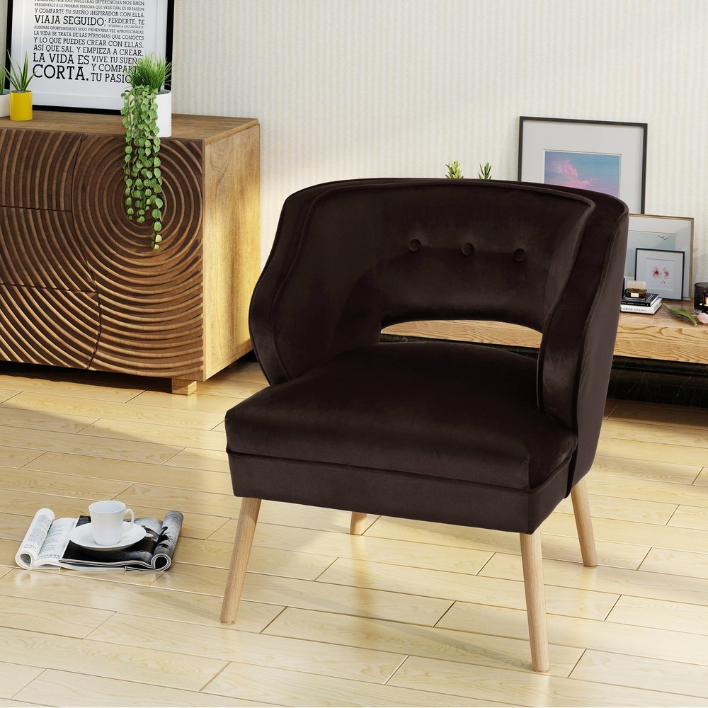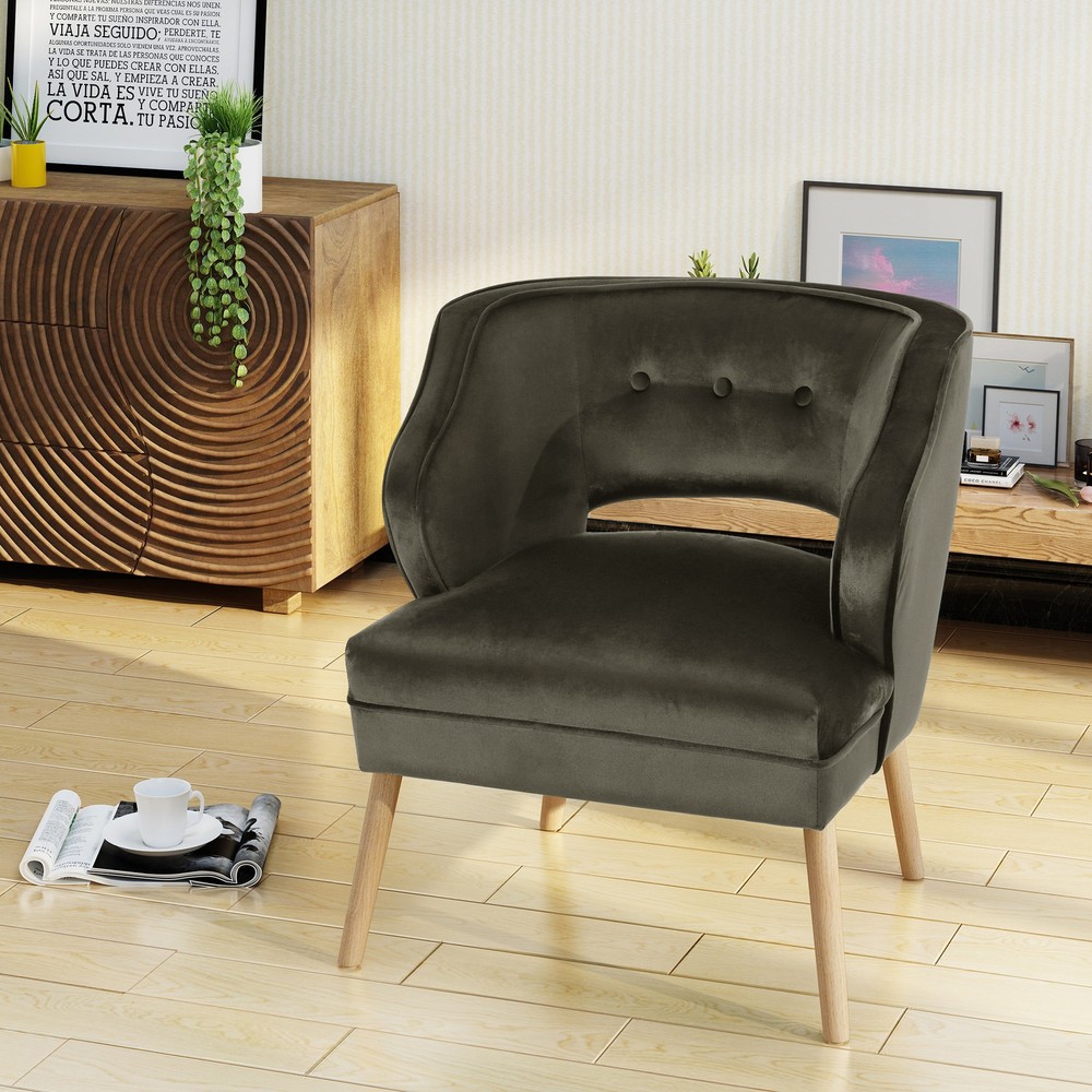 This mid century velvet accent chair is a wonderful addition to any room in your home. Featuring soft to touch velvet with rubberwood legs, this chair is exceedingly comfortable. With a complimentary button and ribbed design to the chair, it is very stylish and sure to match any decor. Place this chair in your living room as extra seating, in the entry way for a quick seat to put your shoes on before leave, or any room you in your home. You are sure to love this chair for years to come.Includes: One (1) Accent ChairMaterial: Polyester Velvet, RubberwoodColor: Teal, Black, Chocolate, Emerald, Grey, or Lavender Leg Finish: NaturalLight Assembly RequiredHand Crafted DetailsDimensions: 30 inches high x 27.25 inches wide x 27 inches deep Assembly Required Free Shipping Over $49.99* Details Mariposa Mid-century Velvet Accent Chair by Christopher Knight Home Product Description: This mid century velvet accent chair is a wonderful addition to any room in your home. Featuring soft to touch velvet with rubberwood legs, this chair is exceedingly comfortable. With a complimentary button and ribbed design to the chair, it is very stylish and sure to match any decor. Place this chair in your living room as extra seating, in the entry way for a quick seat to put your shoes on before leave, or any room you in your home. You are sure to love this chair for years to come. IncludesOne (1) Accent Chair MaterialPolyester Velvet, Rubberwood ColorTeal, Black, Chocolate, Emerald, Grey, or Lavender Leg FinishNatural Light Assembly Required Hand Crafted Details Dimensions30 inches high x 27.25 inches wide x 27 inches deep Assembly Required
