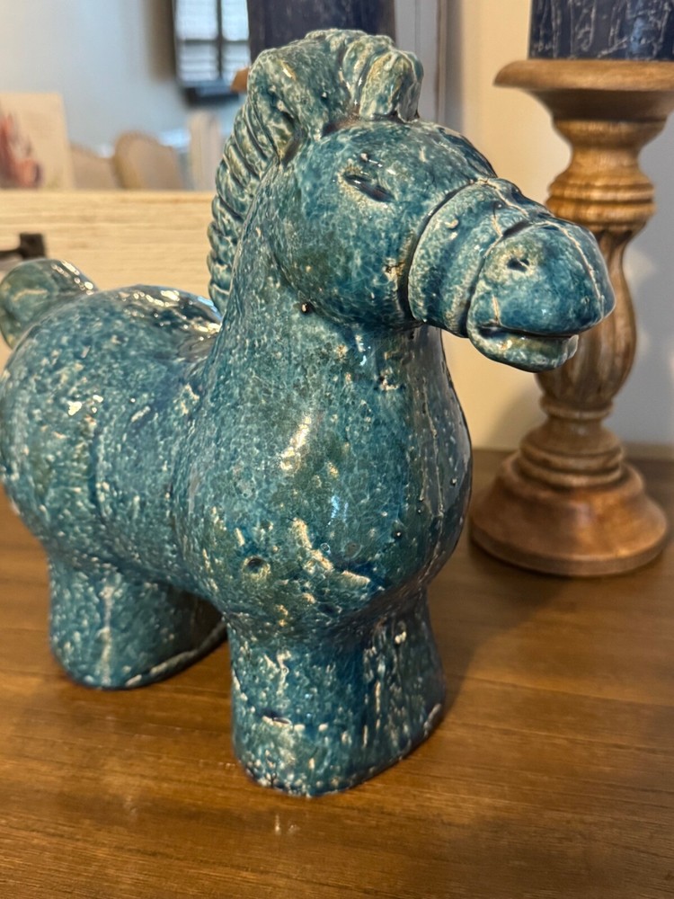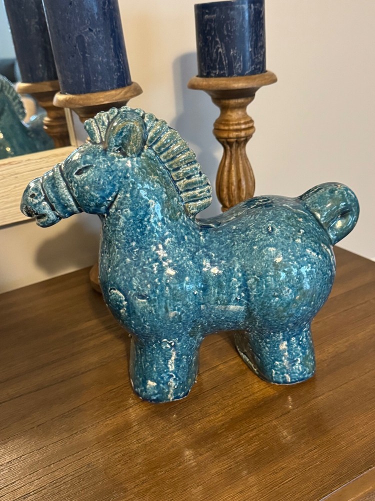 1. This stunning mid-century ceramic horse is a true statement piece! The rich turquoise color and hand-crafted details give it incredible character. Its substantial weight and Danish design make it feel like a high-quality vintage treasure. Perfect for adding a pop of retro charm to any shelf or side table. The size is just right—bold enough to stand out but not overwhelming. Love how it brings personality to my space!