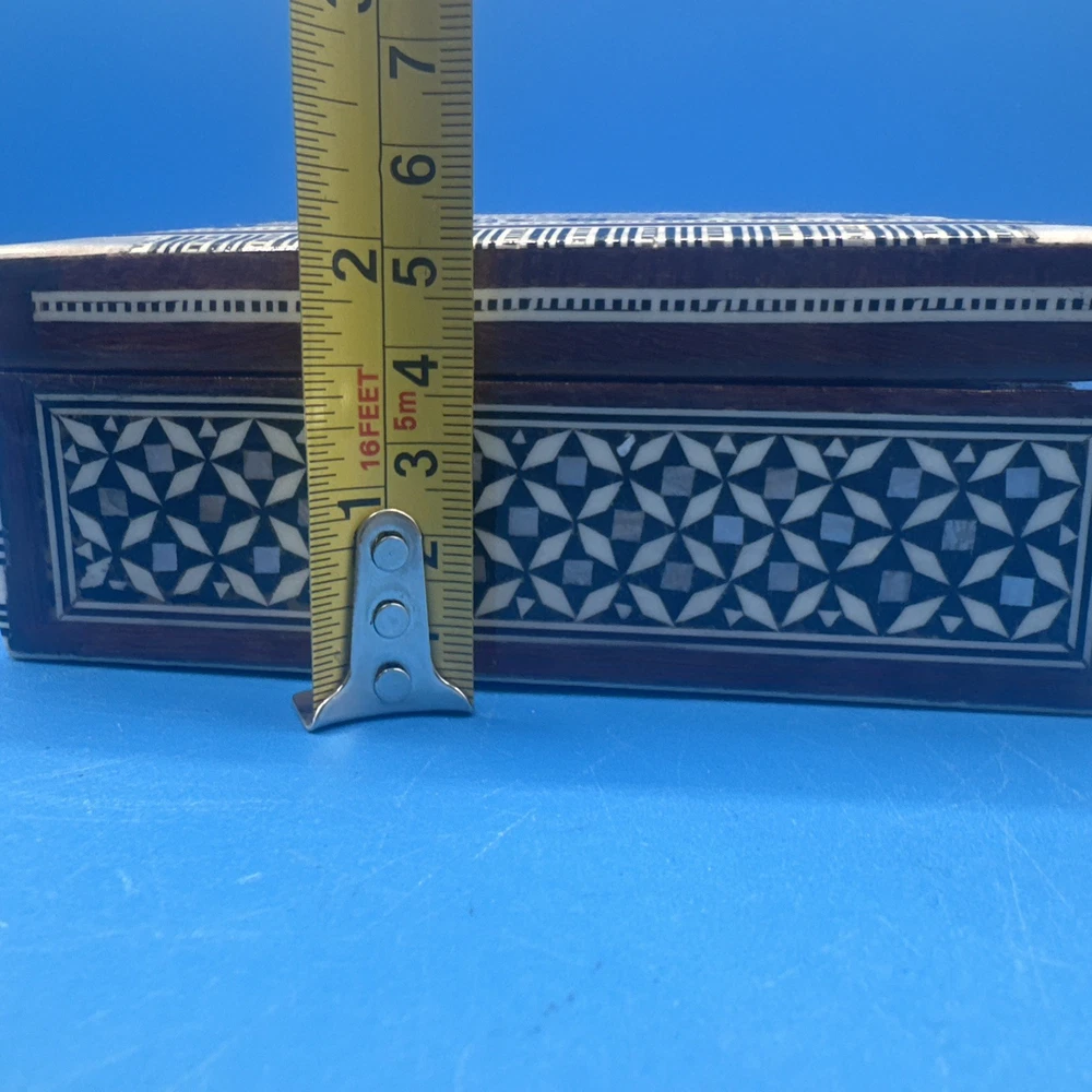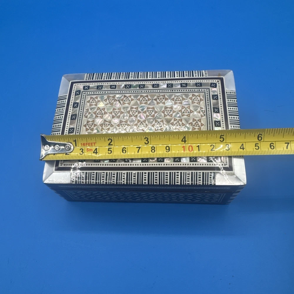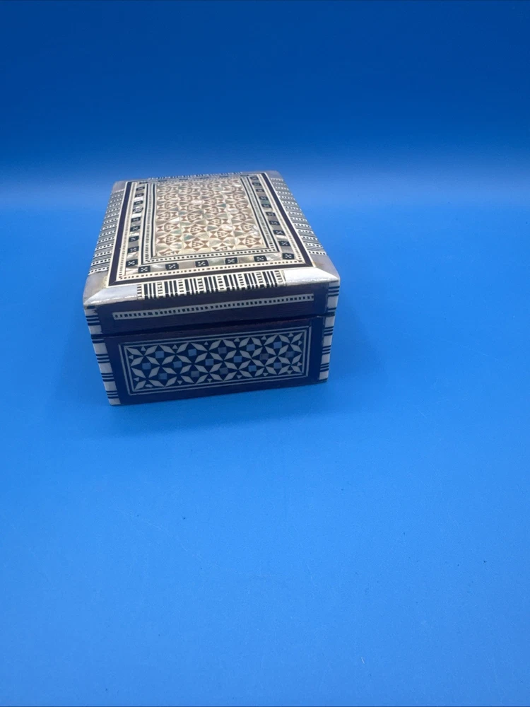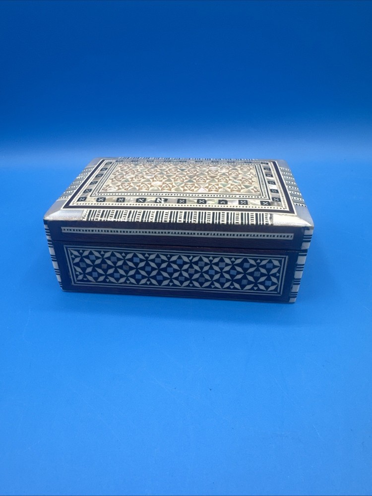This Middle Eastern Mother of Pearl Marquetry Inlaid Jewelry Box is a beautiful and luxurious collectible item. The intricate mother of pearl marquetry design on the exterior combined with the velvet interior creates a visually stunning piece that would make a perfect addition to any home decor. The brand, Pearl, ensures quality and authenticity, while the boxed packaging adds a touch of elegance to the overall design. Whether used for storing jewelry or as a decorative piece, this jewelry box is sure to add a touch of sophistication to any space. Pre-owned excellent condition. No damages. No original box. Please check the pictures carefully as part of the description. Feel free to ask questions if you need more information before you buy it. Thank you for your interest I-5