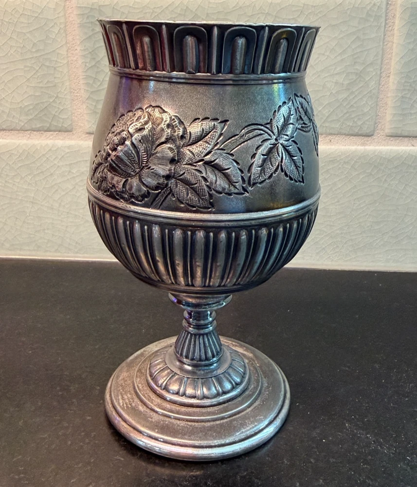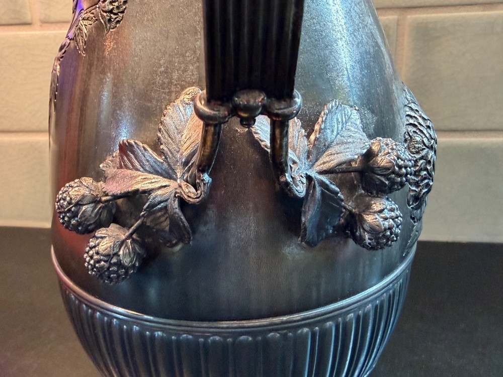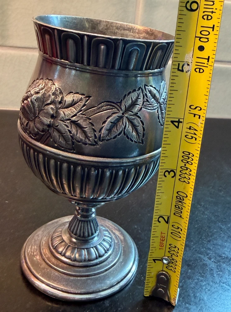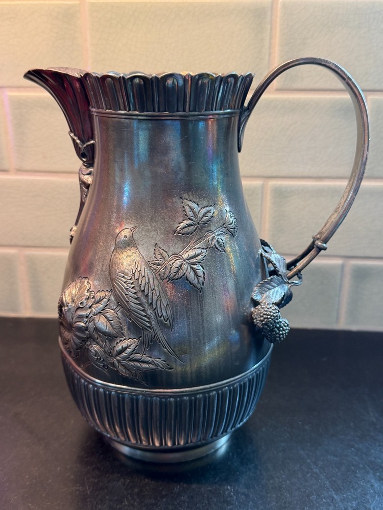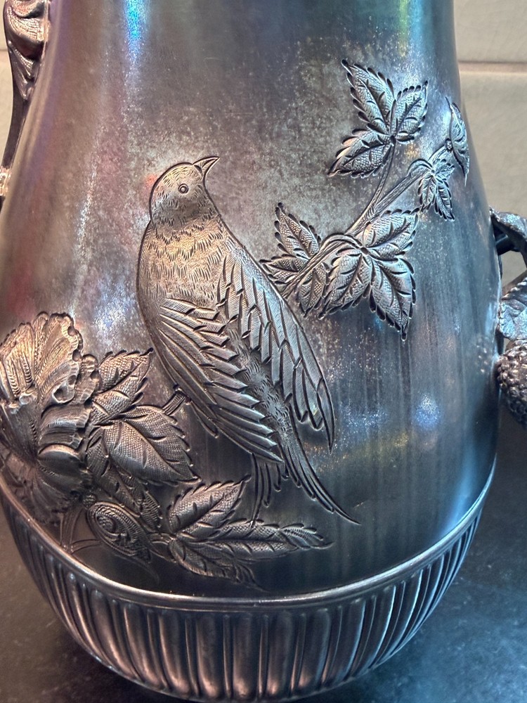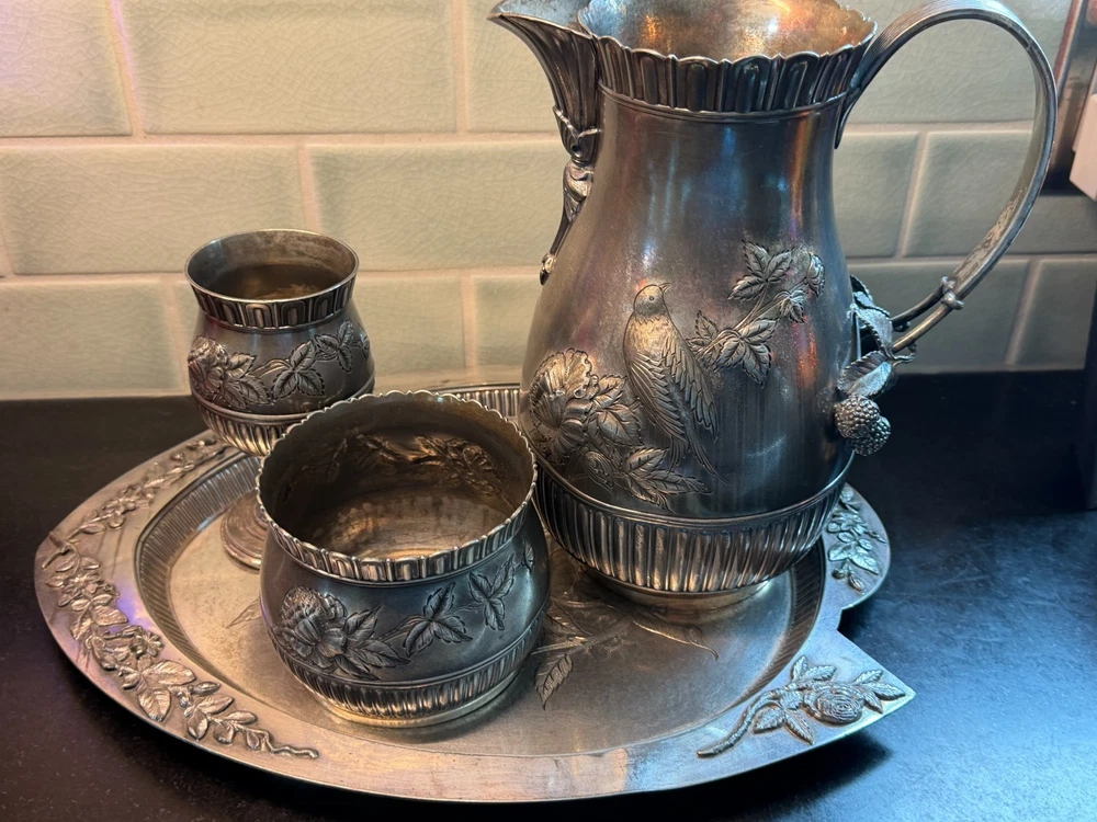 A beautifully detailed Victorian-era quadruple silverplate water set by Middletown Plate Co. , featuring a cohesive floral-and-vine motif across all four pieces and is a wonderful example of the naturalistic Aesthetic Movement style dating to the 1880s–1890s. The pitcher is the focal point, with an embossed bird nestled among blossoms and sculptural berry clusters at the handle. The waiter tray has a distinctive sculptural outline, with an oval serving field and raised floral edging that gives it an elegant, almost arrow-like silhouette. Each piece is stamped “Middletown Plate Co. Quadruple Plated” and “HARD WHITE METAL” . The goblet and slop cup are additionally marked “GILT” . Please review all photos carefully, as they are part of the description and show condition and details clearly. Measurements Waiter tray (No. 173): approx. 15" L x 11.5" W , weight 3 lb Goblet (No. 422, marked GILT): approx. 5.25" H x 2.5" D , weight 10.5 oz Slop cup/bowl (No. 224, marked GILT): approx. 3.5" H x 4" D , weight 12 oz Pitcher (No. 224): approx. 10" H , 7.25" W (spout to handle), 4" top opening diameter , weight 2 lb 8 oz Condition Overall good vintage condition with visible age-appropriate wear. General surface scratches, scuffs, and patina consistent with antique silverplate use and handling Interior wear/tarnish present (especially inside vessels) Pitcher: very minor dent noted on one of the large raised flowers on the side Tray: surface scratches and wear consistent with use; raised floral border shows typical high-point wear Gilt-marked pieces (goblet + slop cup): normal wear to gilt/finish and interior wear consistent with age 📬 Shipping: Carefully packed and shipped via USPS Ground Advantage. I’m happy to combine shipping on multiple items. 👉 Thanks for visiting ! Check out my shop for other vintage finds. 👈 Victorian silverplate water set, Middletown Plate Co., Middletown Connecticut silverplate, quadruple plated, hard white metal, gilt interior, gold wash, Aesthetic Movement silver, 19th century water service, antique water pitcher set, Victorian waiter tray, matching silverplate set, bird motif pitcher, embossed floral silverplate, berry handle detail, naturalistic Victorian design, slop bowl, waste bowl, silverplate goblet, 4 piece silver service, antique serving tray, ornate Victorian tableware, late 1800s silverplate, International Silver Co. subsidiary, decorative antique silver, estate silverplate set, vintage entertaining set, collectible American silverplate, 1880s silver service, Victorian dining decor.