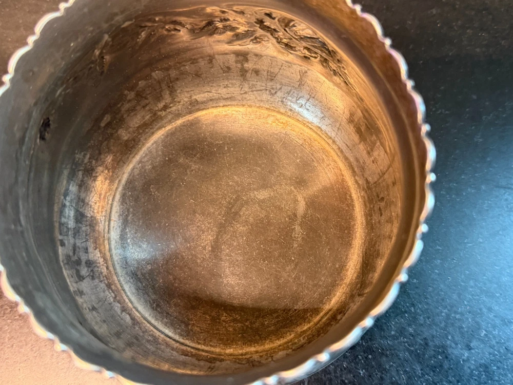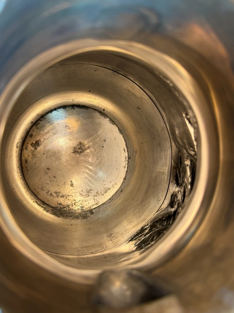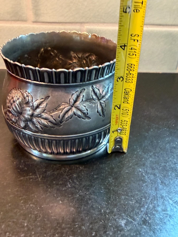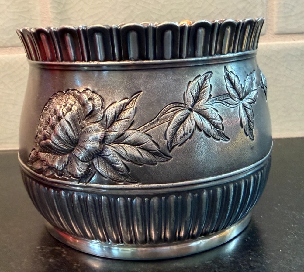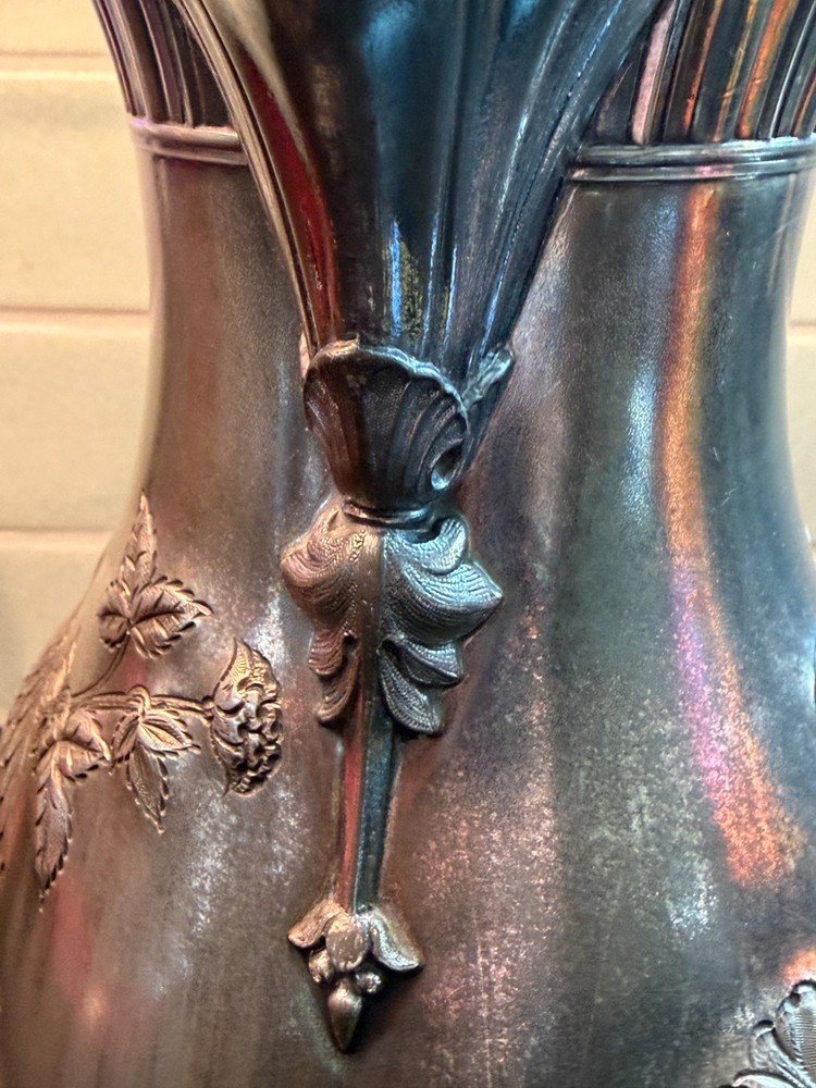 A beautifully detailed Victorian-era quadruple silverplate water set by Middletown Plate Co. , featuring a cohesive floral-and-vine motif across all four pieces and is a wonderful example of the naturalistic Aesthetic Movement style dating to the 1880s–1890s. The pitcher is the focal point, with an embossed bird nestled among blossoms and sculptural berry clusters at the handle. The waiter tray has a distinctive sculptural outline, with an oval serving field and raised floral edging that gives it an elegant, almost arrow-like silhouette. Each piece is stamped “Middletown Plate Co. Quadruple Plated” and “HARD WHITE METAL” . The goblet and slop cup are additionally marked “GILT” . Please review all photos carefully, as they are part of the description and show condition and details clearly. Measurements Waiter tray (No. 173): approx. 15" L x 11.5" W , weight 3 lb Goblet (No. 422, marked GILT): approx. 5.25" H x 2.5" D , weight 10.5 oz Slop cup/bowl (No. 224, marked GILT): approx. 3.5" H x 4" D , weight 12 oz Pitcher (No. 224): approx. 10" H , 7.25" W (spout to handle), 4" top opening diameter , weight 2 lb 8 oz Condition Overall good vintage condition with visible age-appropriate wear. General surface scratches, scuffs, and patina consistent with antique silverplate use and handling Interior wear/tarnish present (especially inside vessels) Pitcher: very minor dent noted on one of the large raised flowers on the side Tray: surface scratches and wear consistent with use; raised floral border shows typical high-point wear Gilt-marked pieces (goblet + slop cup): normal wear to gilt/finish and interior wear consistent with age 📬 Shipping: Carefully packed and shipped via USPS Ground Advantage. I’m happy to combine shipping on multiple items. 👉 Thanks for visiting ! Check out my shop for other vintage finds. 👈 Victorian silverplate water set, Middletown Plate Co., Middletown Connecticut silverplate, quadruple plated, hard white metal, gilt interior, gold wash, Aesthetic Movement silver, 19th century water service, antique water pitcher set, Victorian waiter tray, matching silverplate set, bird motif pitcher, embossed floral silverplate, berry handle detail, naturalistic Victorian design, slop bowl, waste bowl, silverplate goblet, 4 piece silver service, antique serving tray, ornate Victorian tableware, late 1800s silverplate, International Silver Co. subsidiary, decorative antique silver, estate silverplate set, vintage entertaining set, collectible American silverplate, 1880s silver service, Victorian dining decor.