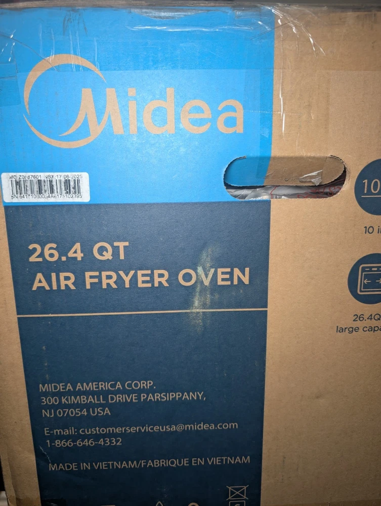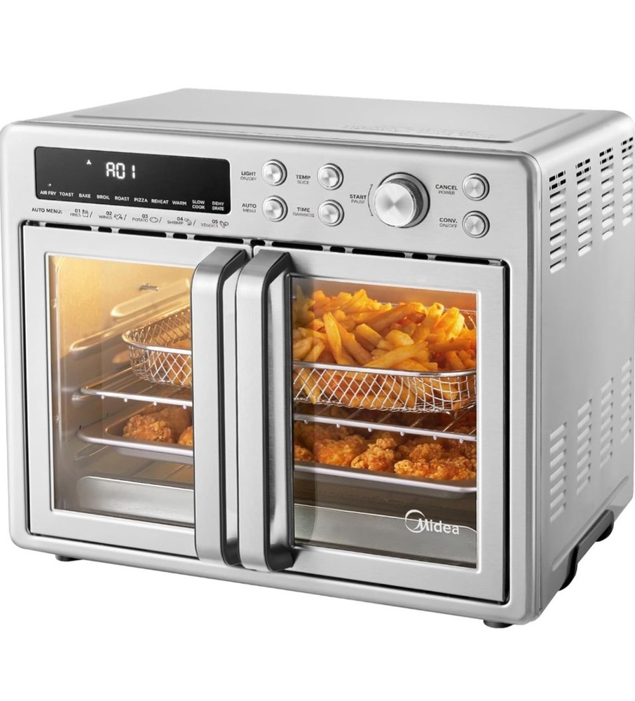 A big countertop beast for someone who wants air fryer convenience without giving up actual oven space. Midea Flexify French Door Air Fryer Oven, 26.4QT, 10-in-1, stainless steel, sold exactly as shown. Great for air frying, baking, roasting, toasting, reheating, dehydrating, and more in one extra-large countertop unit. This is the French door style model with the larger family-size capacity, making it a nice option for anyone who wants more cooking space than a standard little air fryer basket can offer. Good setup for everyday use, meal prep, family dinners, or replacing multiple small kitchen appliances with one unit. Details: - Brand: Midea - Flexify French Door Air Fryer Oven - 26.4QT capacity - 10-in-1 cooking functions - Stainless steel finish - Countertop oven / air fryer combo - Exact item shown in photos Condition: Open box never used, never taken out of box. Boxed unit sold exactly as shown. Outer packaging shows shelf, storage, and handling wear. Please review all photos carefully so you know exactly what you’re receiving. I recommend describing it as new open box only if you have verified contents and condition; otherwise list it based on the exact condition you have confirmed. I do my best to provide clear photos, accurate descriptions, careful packaging, and fast shipping so you know exactly what you’re getting. I take pride in making sure every buyer has a smooth experience from start to finish. Reasonable offers are always welcome.