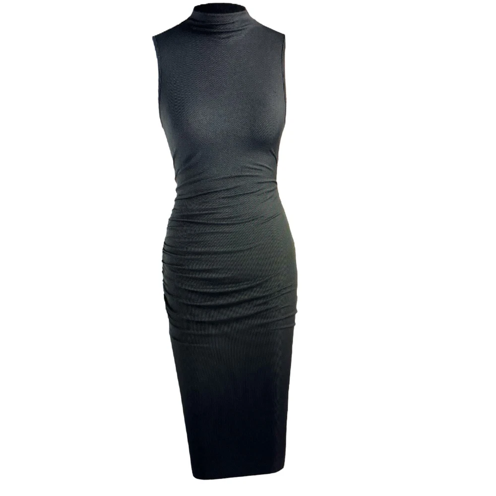 Elevate your wardrobe with this stunning gray midi dress from Cider. The high neck and side ruched accents add a touch of elegance to the bodycon fit, making it perfect for any occasion from weddings to cocktail parties. The dress is made from a stretchy 96% polyester and 4% elastane fabric, ensuring comfort and a flattering fit. This dress is perfect for the fashion-forward woman who wants to make a statement without sacrificing comfort. It's machine washable and easy to care for, making it a great addition to any wardrobe. Don't miss out on this stylish and versatile piece! Length 48.9 inches PTP 17 lying flat across approximately #RibbedKnitDress #MidiDress #HighNeck #Bodycon #GrayDress #All seasons #StretchDress #SleevelessDress