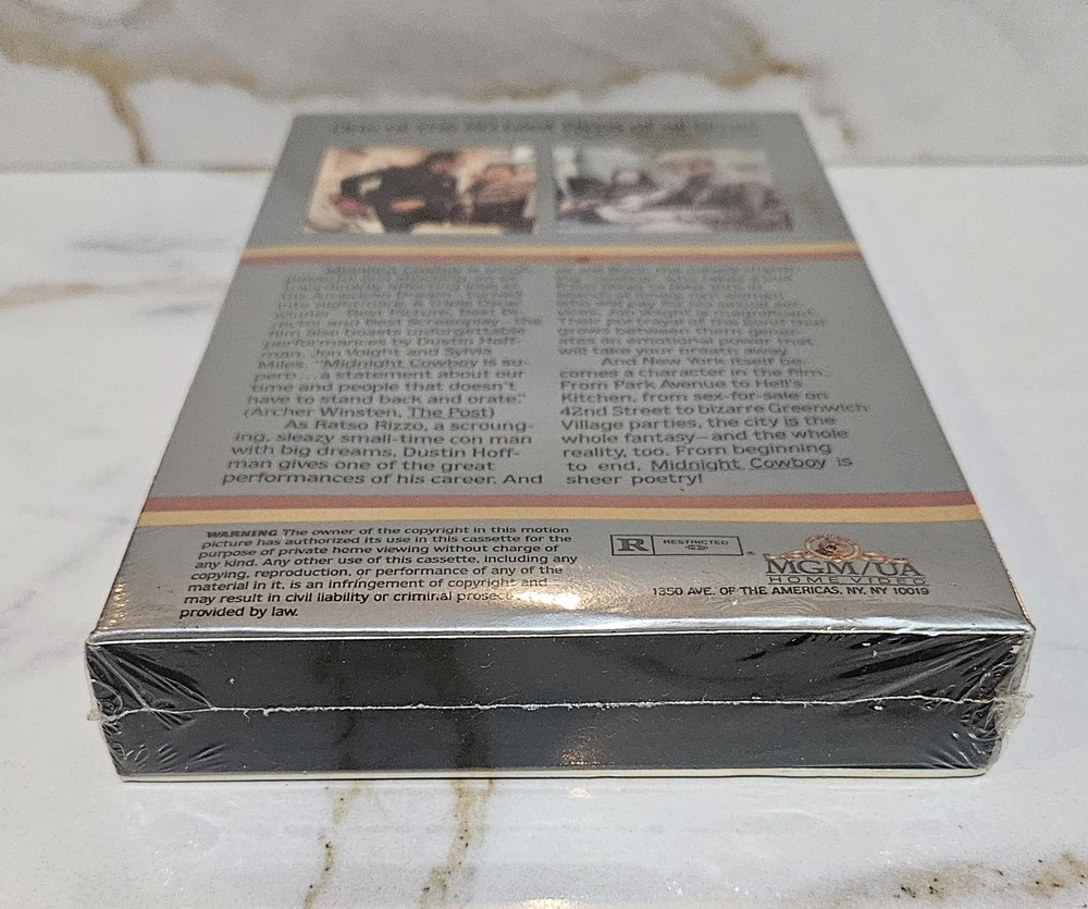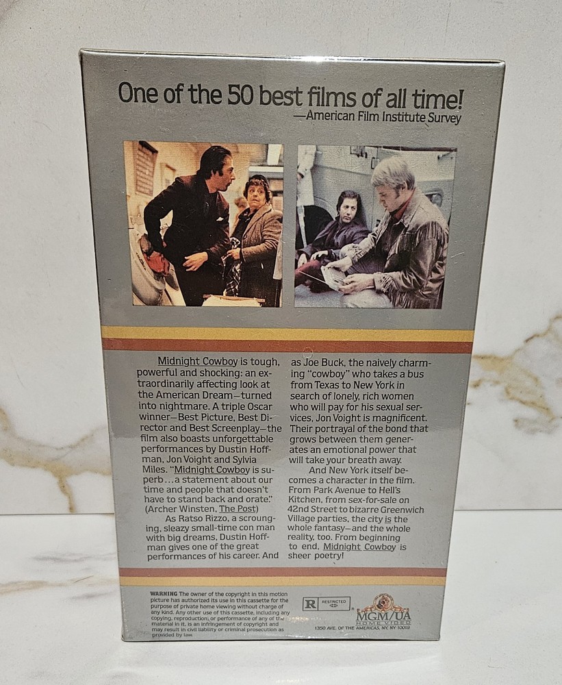 The Midnight Cowboy VHS tape is a cult classic drama directed by John Schlesinger, starring Dustin Hoffman and Jon Voight. This 1988 release is in English with NTSC signal standard and a rating of R. The studio, MGM Home Entertainment, presents a gripping story that has established itself as a must-watch for fans of both actors. This factory sealed VHS tape offers a nostalgic viewing experience for those who appreciate cinematic gems from the 80s.
