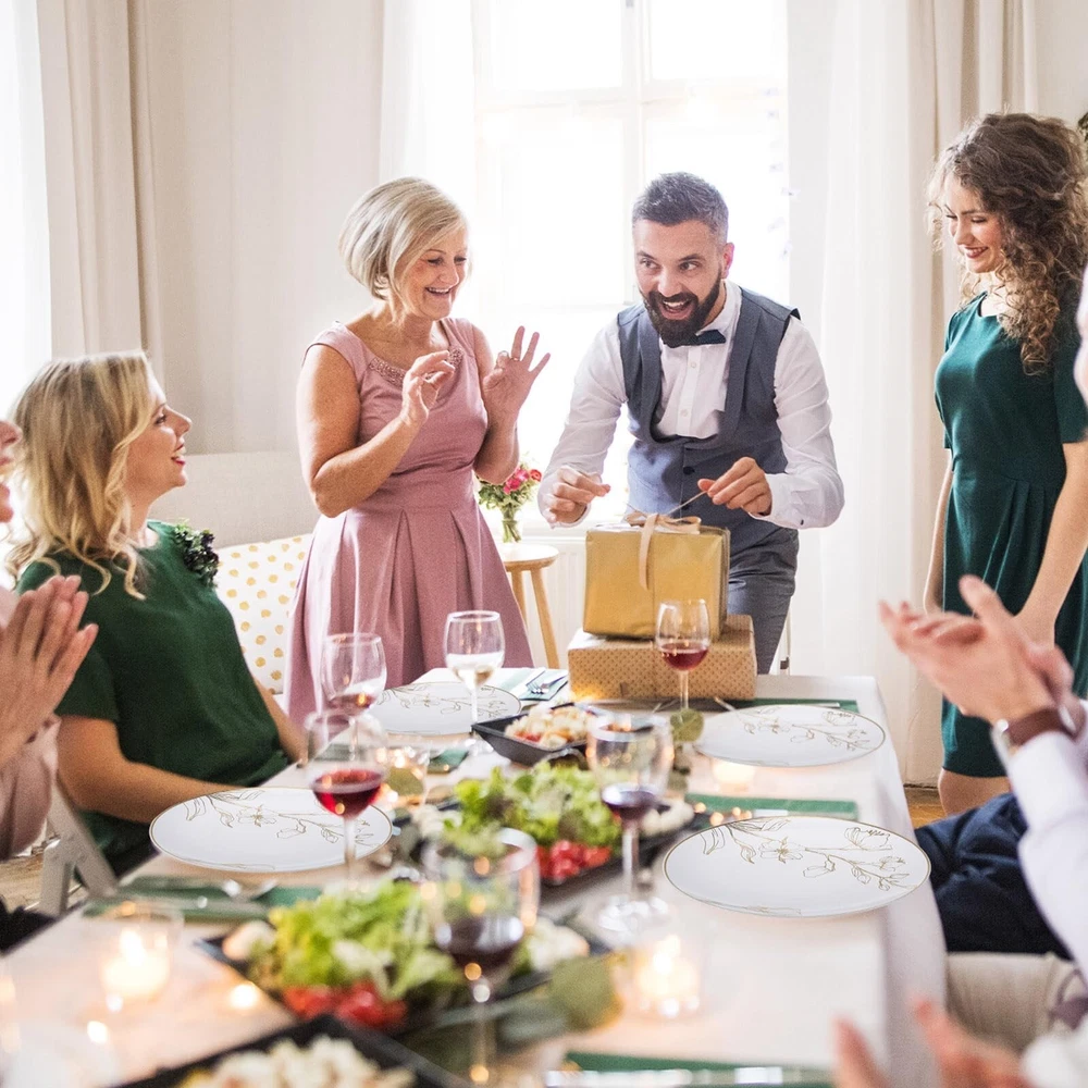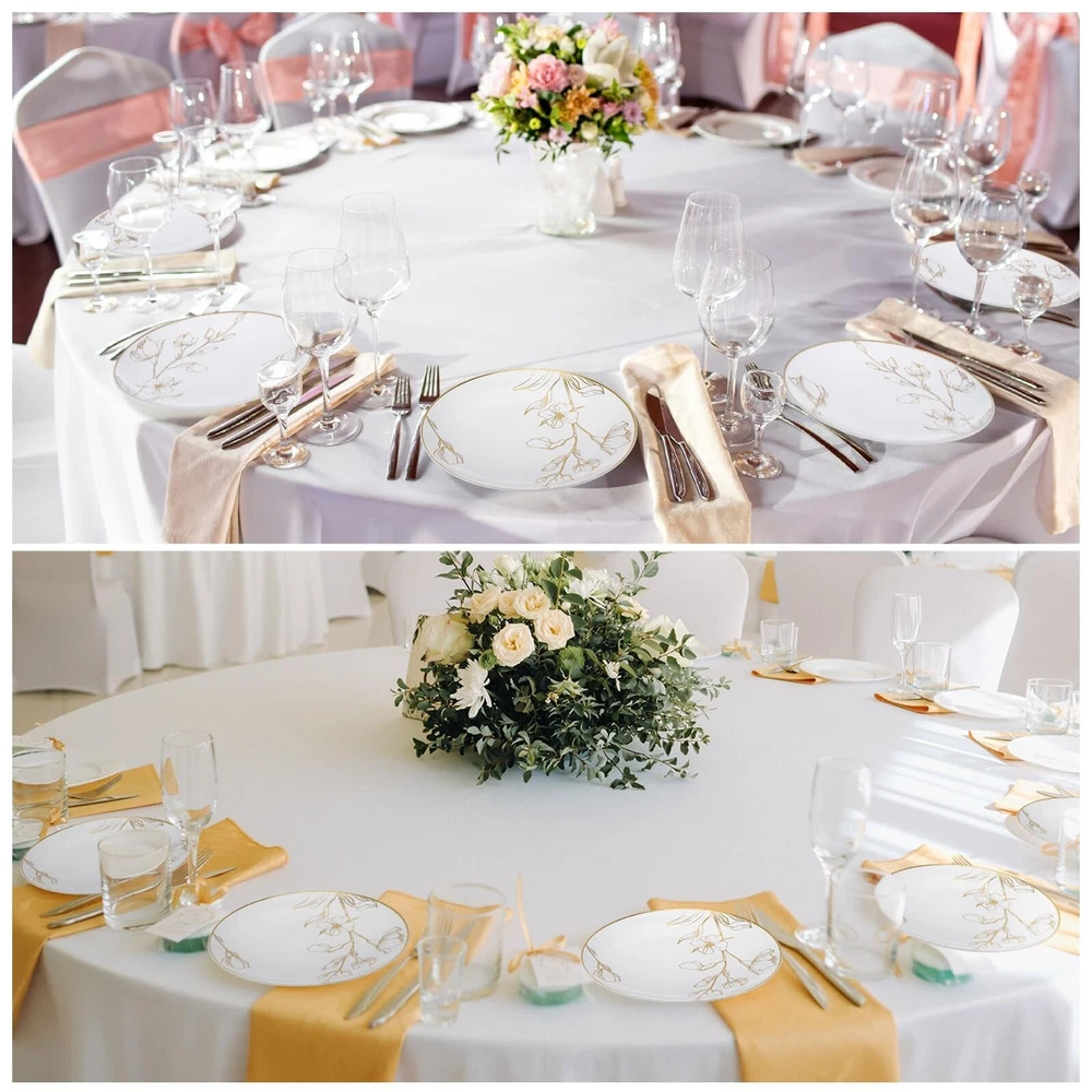 These plates are absolutely stunning—perfect for weddings, birthdays, or any elegant event! The gold floral design adds a luxurious touch, and the heavyweight plastic feels sturdy yet disposable. They’re just the right size, and the gold rim makes every dish look fancy. Guests were impressed, and cleanup was a breeze. Highly recommend for anyone wanting a touch of class without the hassle!