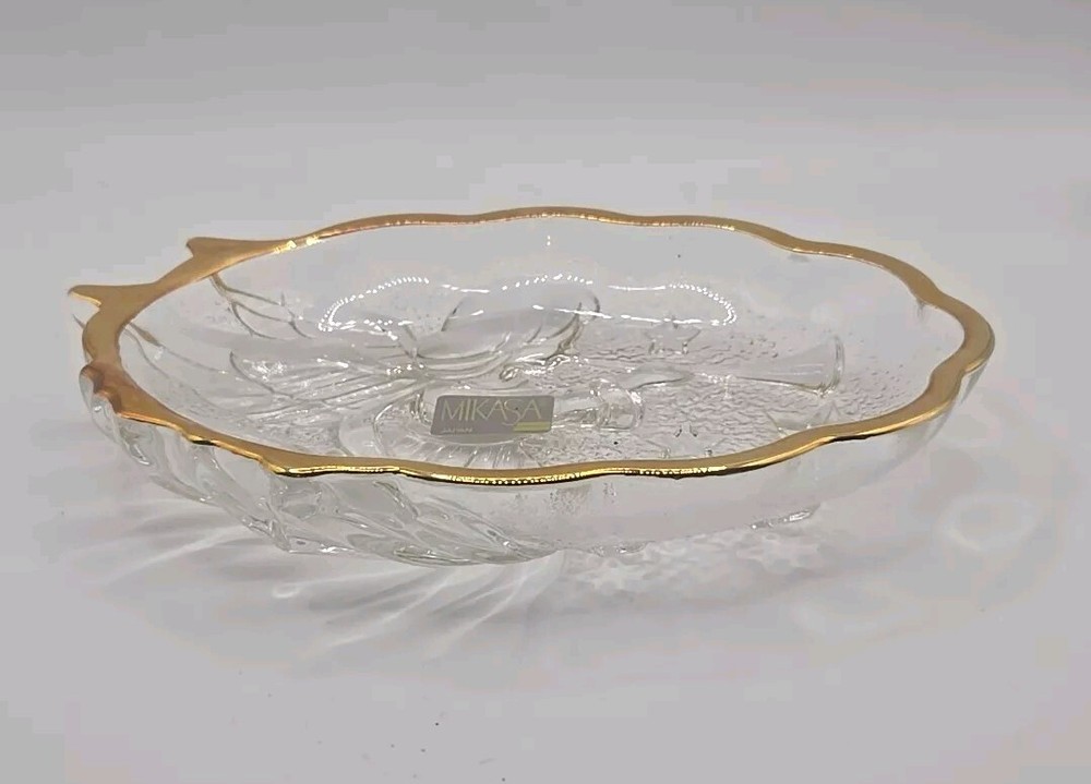 Production Style:Crystal GlassType:Candy DishType of Glass:CrystalOriginal/Licensed Reproduction:OriginalMaterial:Crystal, GlassTime Period Manufactured:2000-2009Finish:GlossyStyle:ContemporaryColor:Clear / GoldManufacturer:MikasaBrand:MikasaVintage:No