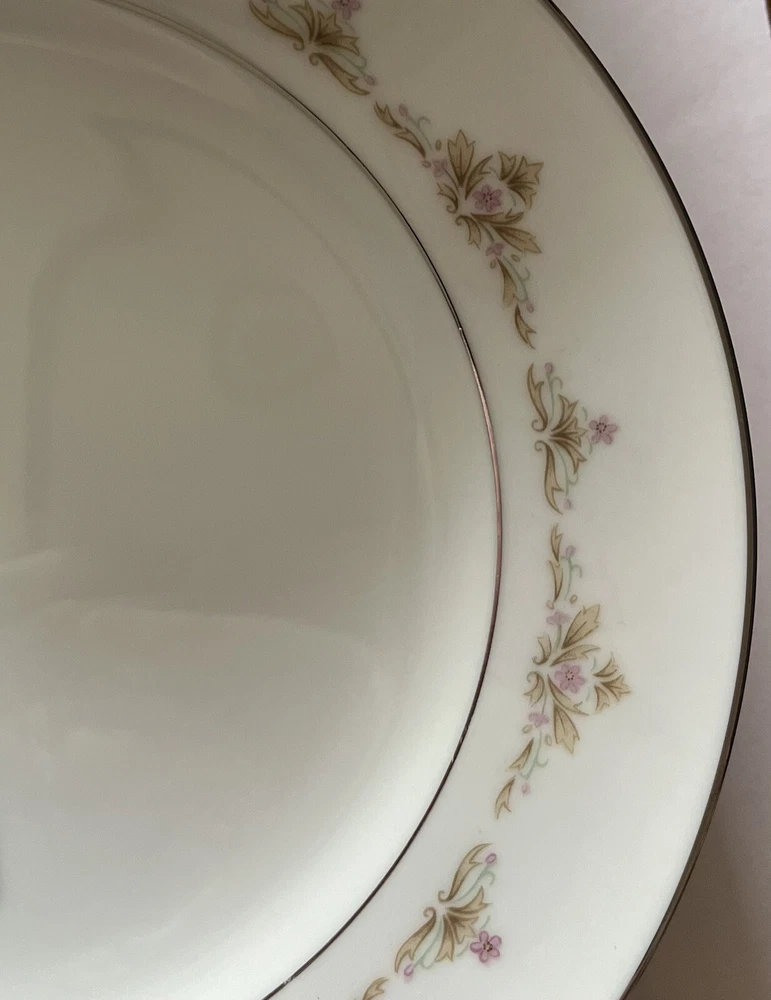 This beautiful bread set from Mikasa's Bernice product line is the perfect addition to any vintage collection. The delicate pink floral pattern and platinum edge detailing make it an elegant choice for your dining table. Listing includes: 6, 7.5 inch bread plates No chips or cracks Design in excellent condition