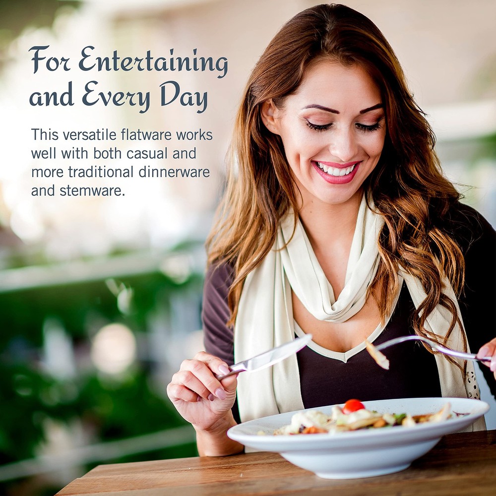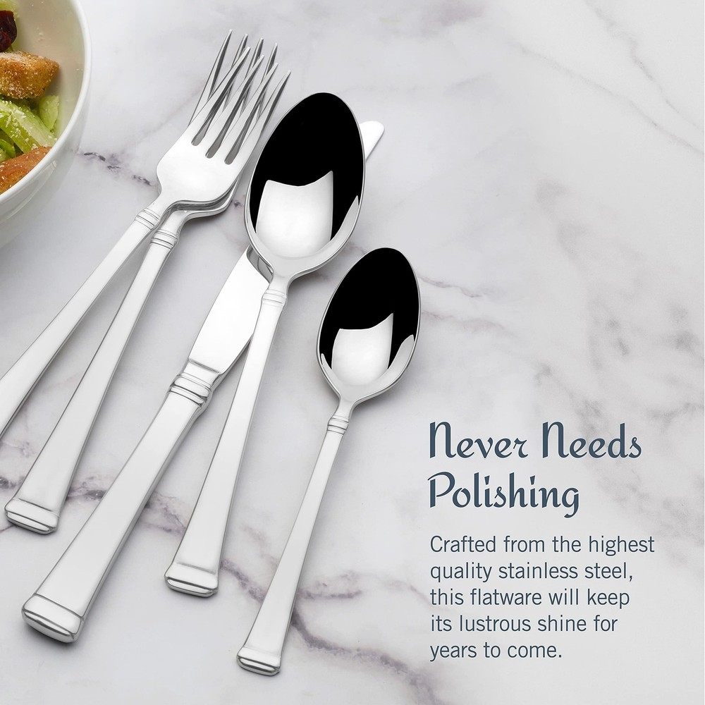 Mikasa Harmony 65-Piece 18/10 Stainless Steel Flatware 65 Piece Set, Silver Product Details TIMELESS DESIGN: Features flaring handles and subtle bands that highlight narrow necks and wide tips. This elegant mirror-polished aesthetic complements any table setting from traditional to modern minimalist decor. PREMIUM 18/10 STAINLESS STEEL: Crafted from superior 18/10 stainless steel for long-lasting luster and rust resistance. This high-quality composition ensures durability for daily use while maintaining a sophisticated, heavy-weight feel. COMPLETE SERVICE FOR 12: Includes 12 dinner forks, salad forks, dinner knives, dinner spoons, and teaspoons. The comprehensive set provides a cohesive look for large families, holiday gatherings, and formal dinner parties. 5-PIECE HOSTESS SERVING SET: Comes with 1 serving tablespoon, 1 pierced tablespoon, 1 cold meat fork, 1 butter knife, and 1 sugar spoon. Perfectly coordinated essentials for serving appetizers, entrees, and desserts with style. DISHWASHER SAFE: Designed for quick and easy cleanup, this flatware set is fully dishwasher safe. The resilient finish resists spotting and fading over time, making it ideal for both casual brunches and formal affairs. Elevate your dining experience with the Mikasa Harmony 65-Piece Flatware Set, a masterpiece of functional design and sophisticated style. This expansive collection provides a complete service for 12, making it the perfect solution for large family gatherings, holiday hosting, or upgrading your daily kitchen essentials. Each piece is meticulously forged from premium 18/10 stainless steel, a high-grade alloy containing 18% chromium and 10% nickel. This specific composition ensures the silverware provides a heavy-weight feel in the hand, exceptional resistance to rust and corrosion, and a brilliant mirror-polished luster that remains vibrant even after years of frequent use. The Harmony pattern is celebrated for its timeless, versatile silhouette. It features gently flared handles with subtle banding and rounded edges that transition smoothly from a narrow neck to a wide, comfortable tip. This balanced ergonomics ensures that every fork, knife, and spoon is easy to hold, providing a seamless experience from the first course to the last. Whether you are setting a table for a casual weekend brunch, a formal wedding rehearsal, or a standard weeknight meal, this set’s high-polish finish reflects light beautifully, complementing any dinnerware or glassware collection. Beyond standard place settings, this comprehensive 65-piece set includes a 5-piece hostess serving set. You will receive 12 dinner forks, 12 salad forks, 12 dinner knives, 12 dinner spoons, and 12 teaspoons. To ensure you are fully equipped for entertaining, the set also features 1 serving tablespoon, 1 pierced tablespoon for strained vegetables, 1 cold meat fork for appetizers, 1 butter knife, and 1 sugar spoon. Designed for the modern lifestyle, the entire collection is 100% dishwasher safe, allowing for effortless cleanup without the need for hand-polishing. Durable enough for the rigors of a busy kitchen yet elegant enough for a black-tie event, the Mikasa Harmony set is an ideal investment for your home or a thoughtful gift for newlyweds and first-time homeowners.