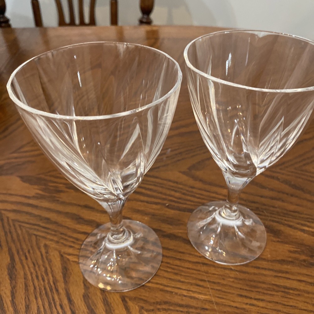 Elevate your drinking experience with this exquisite set of two Mikasa Impression Swirl Optic Crystal wine goblets. These goblets feature a stunning contemporary design with an elegant glass production style. The clear crystal material is beautifully crafted into a swirl pattern, adding a touch of sophistication to any table setting. Perfect for both men and women, these 6oz goblets are ideal for wine enthusiasts who appreciate the finer things in life. The backstamp is impressed with the Swirl product line, and the production technique is fused glass. These goblets are an original, licensed reproduction from the 1980-1989 time period. Add a touch of class to your drinkware collection with these Mikasa goblets. No cracks or chips. 6.75” wide x 3.75 wide at top. Purto