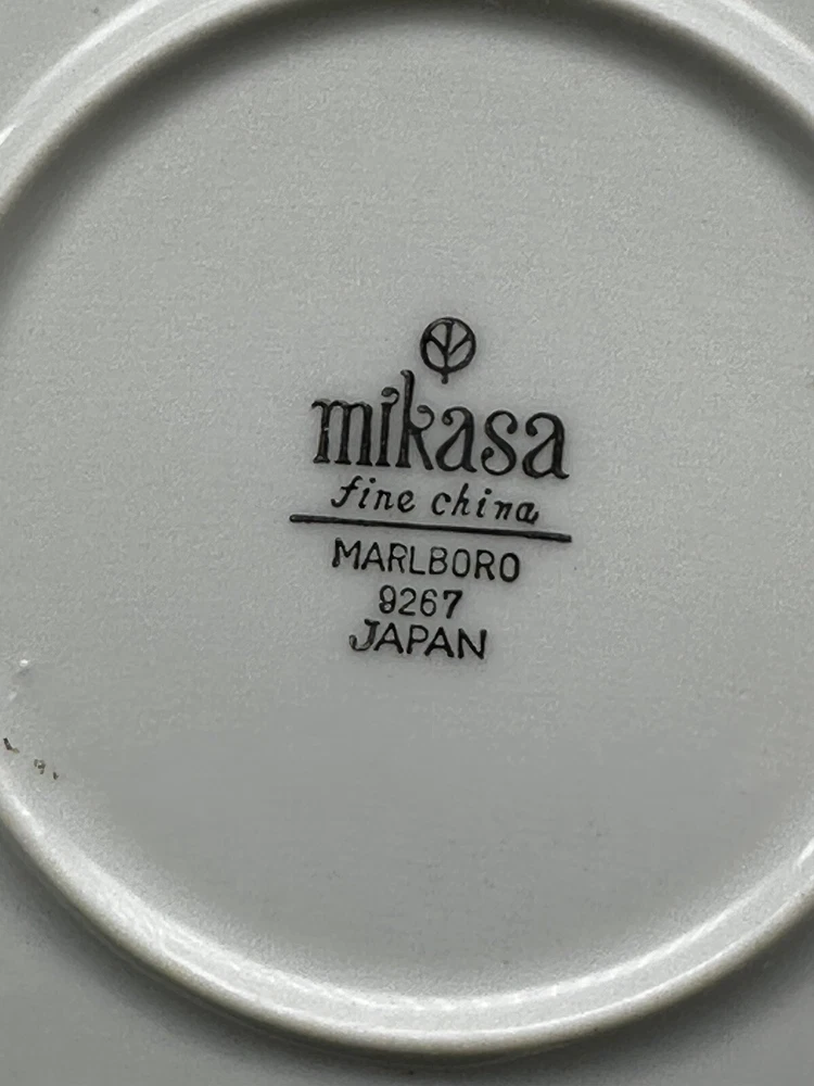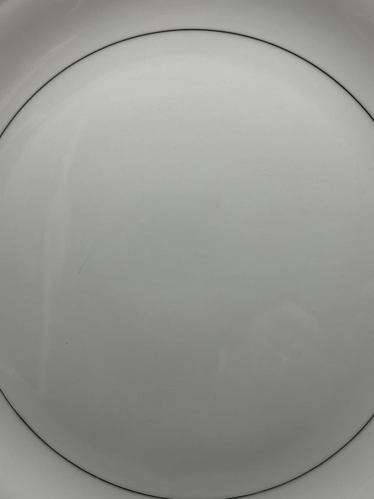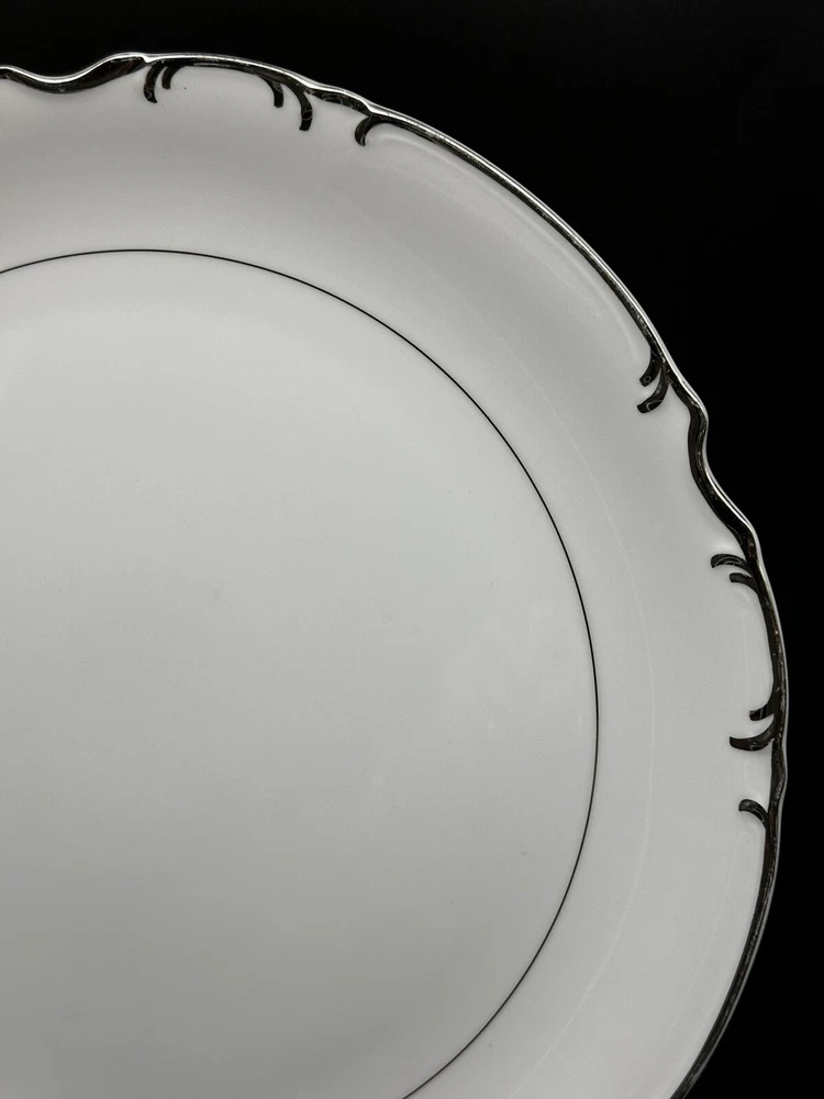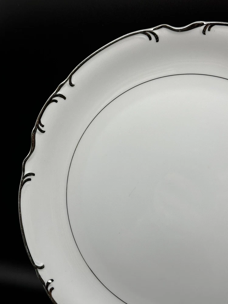 For sale pre-owned and vintage chop plate made by Mikasa in the 1970s in Japan. This bone china chop plate has a glossy white background featuring platinum trim and verge on the scalloped rim. This patter has been discontinued. Details: 12 inches diameter 1 1/8 inches high 2 pounds 5 ounces weight