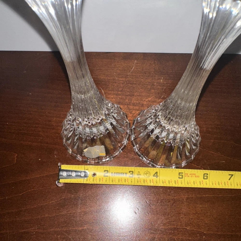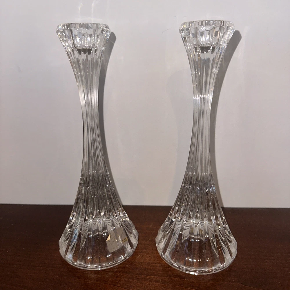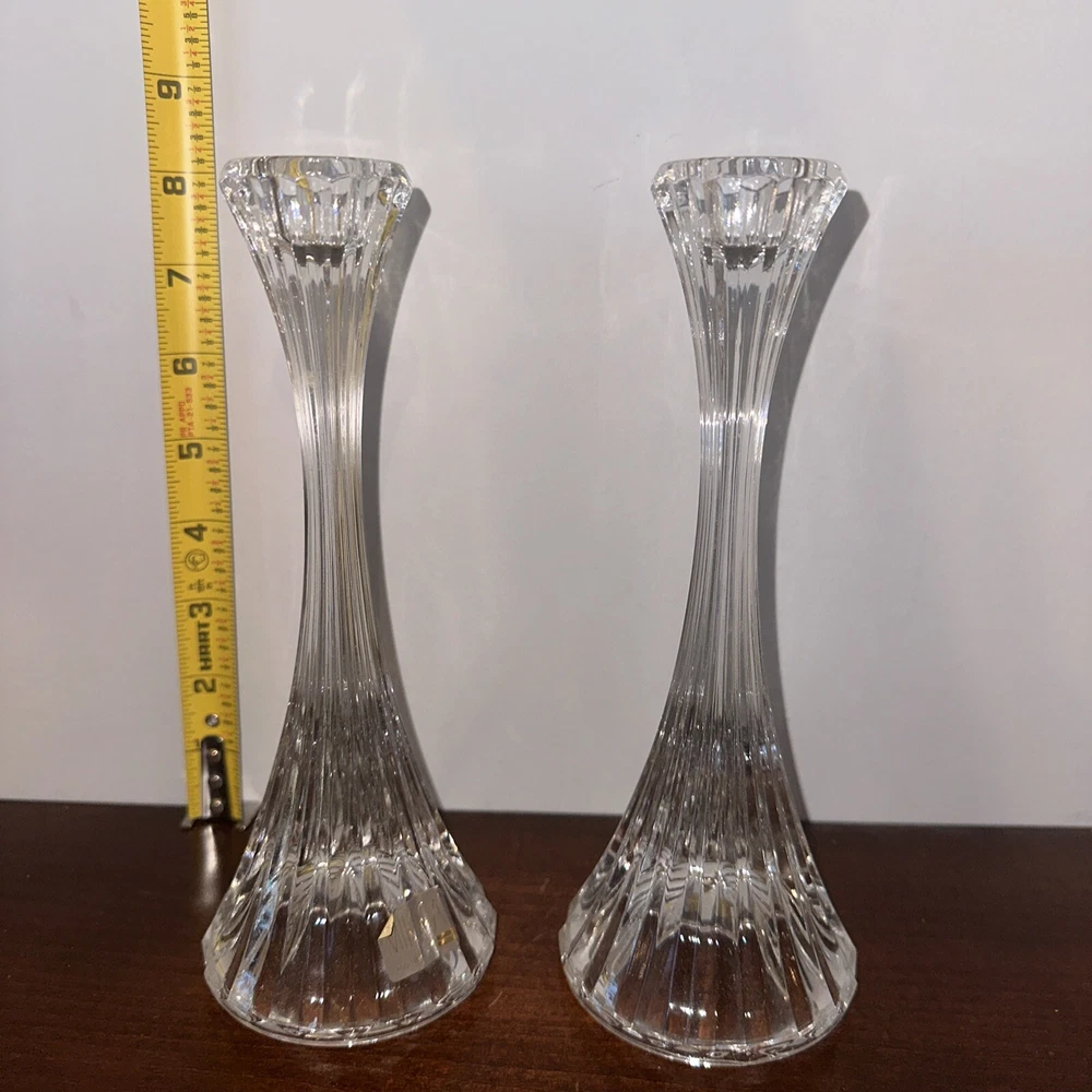 Add a touch of elegance to your home decor with this beautiful set of two Mikasa Park Lane crystal candle holders. These slender hourglass-shaped holders are perfect for all occasions and suitable for tapers or long candles. The clear crystal material adds a contemporary and mid-century modern style to your decor, while the crystals feature provides a unique and elegant touch. These candle holders are easy to clean with warm water and hand wash, making them a perfect addition to your collection. Each holder is 8 inches tall and weighs 1 lb 14.4oz for 2. The set is from 1987-2010 and made in Germany. Don't miss the chance to add these stunning candle holders to your collection!