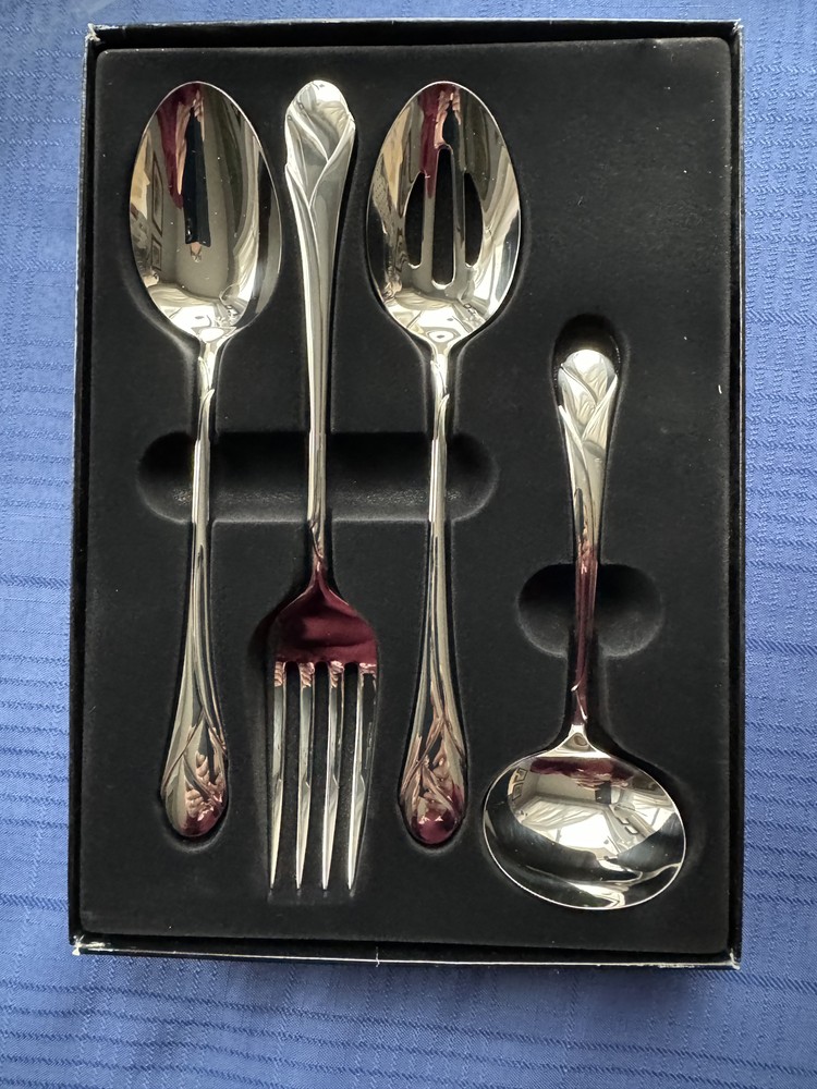 This auction is for a 4 Piece Hostess Serving Set in the Sweet Pea pattern by Mikasa Stainless. The auction includes 1 Serving Spoon, 1 Pierced Serving Spoon, 1 Serving Fork, and 1 Ladle. These pieces appear to have never been removed from the packaging. The package does show some wear from storage. Please see the pictures for additional details. Please visit my other auctions for other great deals. I will gladly combine shipping for US customers on multiple purchases. Please provide zip code for quote.