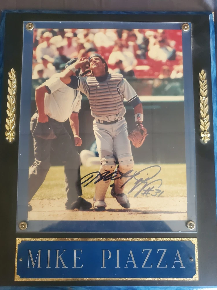 Fast and Free Shipping! 6 item lot featuring Mike Piazza 3 autos: Mike Piazza photo, Dave Roberts jersey, 3rd auto is unknown player on the blue mini helmet. This framed 8x10 photo features Mike Piazza and Dave Roberts, two iconic players in the history of the Los Angeles Dodgers. The photo is a must-have for any vintage sports memorabilia collector. With the Dodgers being one of the most storied franchises in baseball history, this photo is a rare find for any fan or collector. The photo is in excellent shape and is ready to be hung up on display. Don't miss out on the opportunity to own a piece of history from one of the greatest teams in baseball. This item is perfect for any fan of the Dodgers or vintage sports memorabilia.
