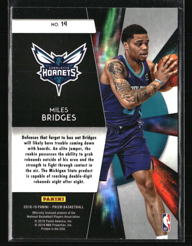 Autographed: No Team: Charlotte Hornets Set: Panini Prizm Sport: Basketball Parallel/Variety: Freshman Phenoms Manufacturer: Panini Prizm Player/Athlete: Miles Bridges Type: Sports Trading Card Graded: No Card Number: 14 Season: 2018 League: NBA Year Manufactured: 2018