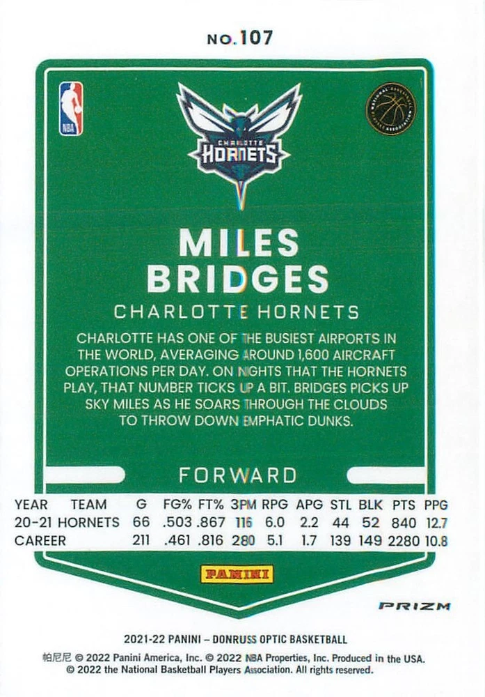 Graded: No Manufacturer: Donruss Sport: BASKETBALL Insert Set: Choice Prizm Autographed: No Player/Athlete: Miles Bridges Type: Sports Trading Card Year Manufactured: 2021 Card Number: 107 League: NBA Parallel/Variety: Choice Prizm Set: 2021-22 Donruss Optic Team: Charlotte Hornets Season: 2021