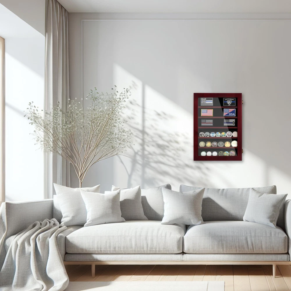 HIGH QUALITY - coin display rack is handcrafted from wooden, which is very strong and durable. Challenge coin holder’s red finish is glossy, showing its noble temperament. The smooth black felt lining allows you to affix displays of a variety of collectibles such as pins, badges, patches, and other items, protecting your precious collection from dust or scratches. HD TEMPERED GLASS & REMOVABLE DIVIDERS - Challenge coin display case door made of 3mm high toughened glass to protect your precious collection,high toughened glass different other acrylic materials. More durable more high-definition and wear-resistant, no need to worry about the door’s cover will be scratched; all shelves in between are removable to accommodate coins in large sizes. Designed with grooves to prevent coins from falling and moving, can holds 24-42 coins. Slot Width is about 5mm / 0.2 inches. SAFE PACKAGING - Challenge Coin Display Box measures 15.74"(H) X 11.42"(W) X 2.56"(D) and the shelf distance for each row is approximately 2.04 inches. Shipped in highly protective packaging, ensuring that your coin holder arrives to you in the best condition possible. DISPLAY WHATEVER YOU LOVEING - Challenge coin display stand easy to show your collection such as Army, Navy, Air force, Police, marine corps, coast guard and other Military challenger coins, medals, pins, badges, ribbons, token, miniature cars,patches, insignia, memorabilia, figurines, antique coins, commemorative awards, thimble, geo coins, badge, patch, belt buckle, knife and other collectibles of any size,and other items to complete your shadow box. PERFECT GIFT - Military coin holder would be a great present to welcome a home hero and your love. Army, Air Force, Marine Corps, Navy, Coast Guards, Retirement, Excellent Missions, Overseas Heroes. Military Days,for Welcoming party,Memorial Days, 4th July, Birthday, Holidays, Thanksgiving day,Christmas, Parent's anniversary, Fathers Day, Gift for Grandfather, or other special days.