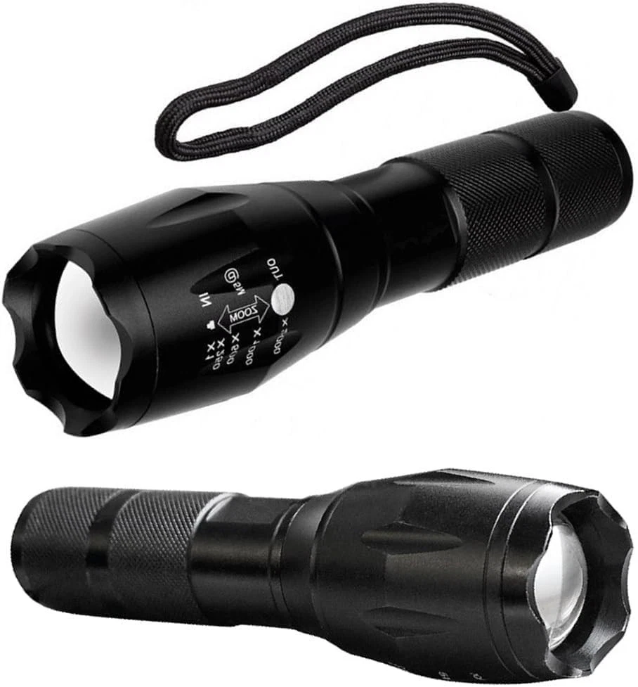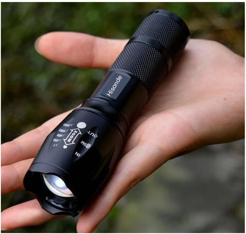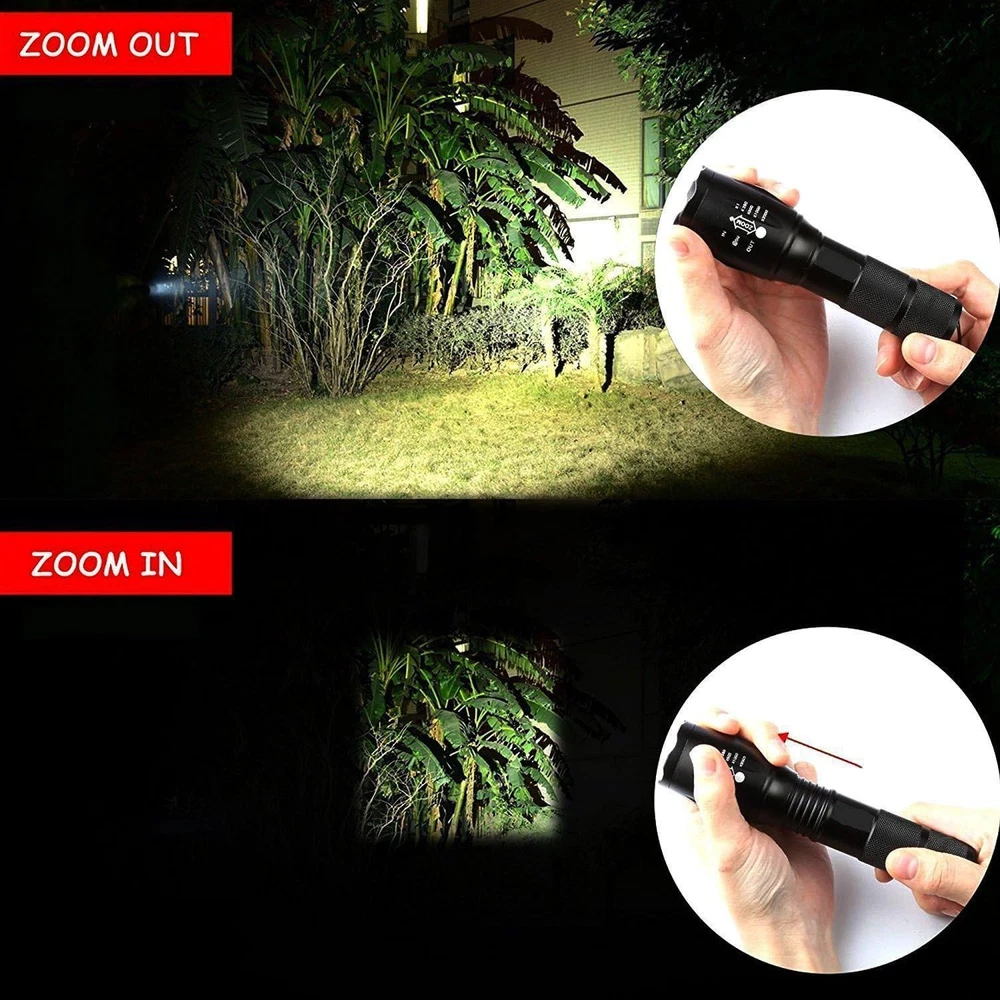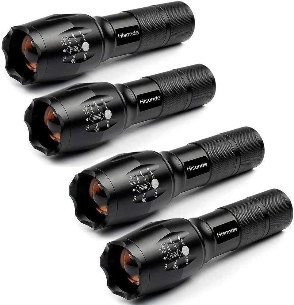 Ultra Bright LED Tactical Flashlights with 5 Modes and Zoom Function High Lumens Water Resistant Light For Hurricane,Outdoor Activities, Camping Accessories, Emergency 1) Item was made of High-efficiency LED chip, 100,000 hours lifetime. Super Bright that can see 280 meters object. 2) 5 mode outputs, , suitable for outdoor camping, hiking...etc. 3) Adjustable focus range for different usage, stretching to adjust its focus. 4) aluminum alloy material and ultra clear convex lens. 5) Safe and water resistant level of IPX-6. Works in heavy rain. 6) Internal wiring applies the high efficient booster circuit, working voltage is wide and can utilize the batteries in the largest extent. 7) Power by: 1*18650 3.7v rechargeable batteries (Not Included)oR 3xAAA(Not Included) Specification: 1) One Set:4 Pack 2) Special Features: LED Flashlight 3) LED lifetime: 100,000 hours 4) Switch type: Tail cap switch 5) Meterial: Aluminium Alloy 6) Size: 197x 35 x 25 mm 7) Lighting Distance: 280m 8) Net Weight: 6.0 oz (170g) 9) Color: Black Package contents: 4x 5-Modes Flashlight How do you change the modes on this flashlight: 1.Fully depress the on off switch completely twice within 3 seconds 2.Just a light press to bounce the button 5 Mode: High, Middle, Low, With ON / OFF button / Zoom in & out Case material: aircraft-grade aluminum Battery:3xAAA(Not included) Lighting Distance: > 500 meters (over 1/3 of a mile) Special Power: High-Efficiency and Great Output LED Chip, Super Bright Light