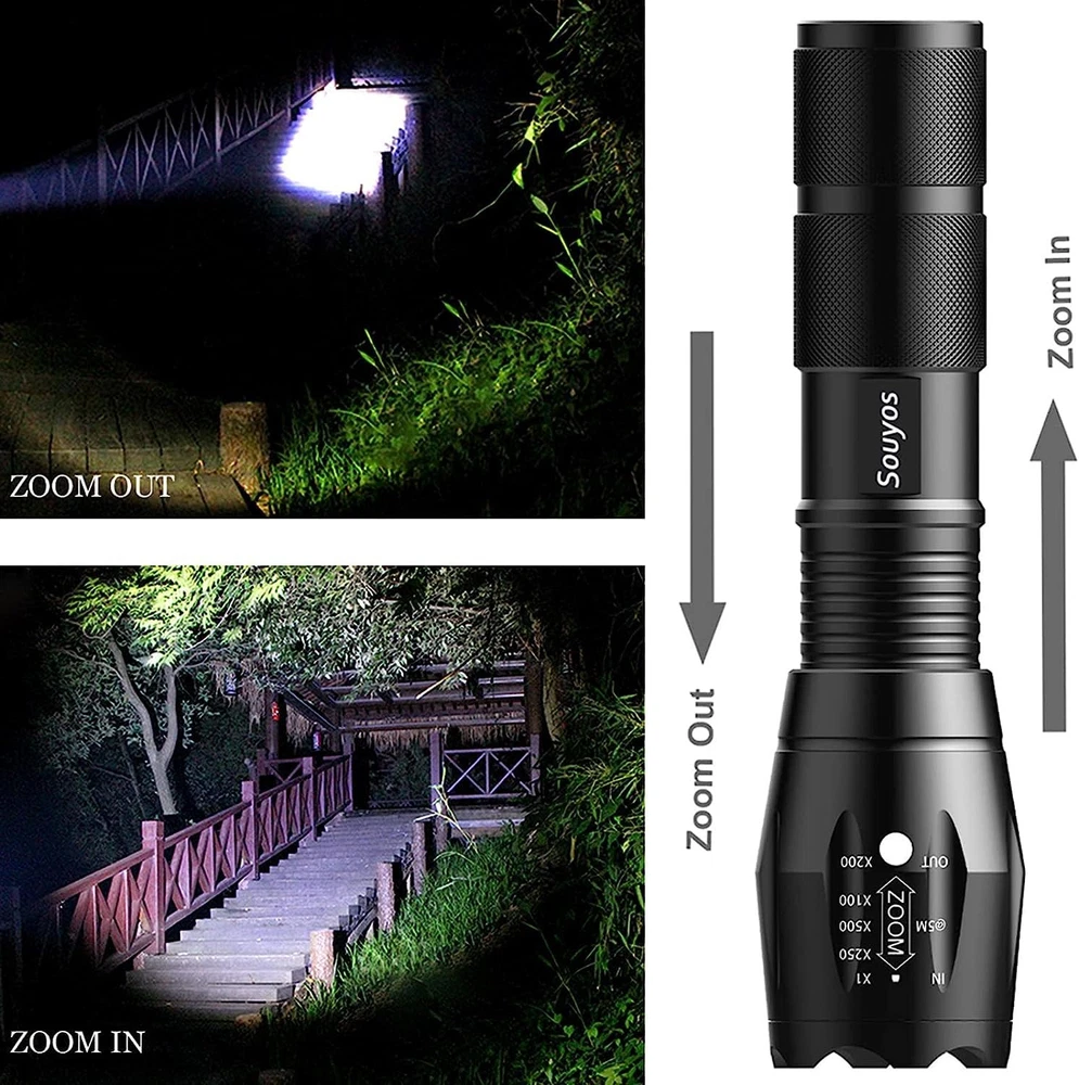 5 Lighting Modes:. Gently press to change modes. Super bright up to 500 meters long distance ADJUSTABLE FOCUS: Zoomable torch light for long distance observation or large area illumination WATER RESISTANCE: Perfect for using in the rainy days and extreme weather. The body of small led flashlight is made of high quality aluminum alloy, and it has a very solid construction EASY TO CARRY: The ultra bright led flashlight is very lightweight to carry with you. You can put it into your backpack, pocket, pants, handbag POWER SOURCE: Powered by 3 AAA battery. (Battery not included )