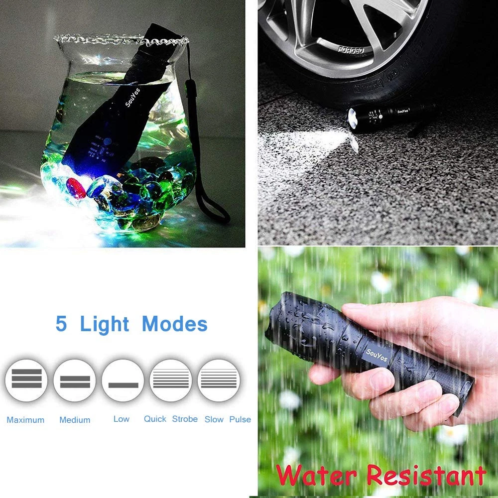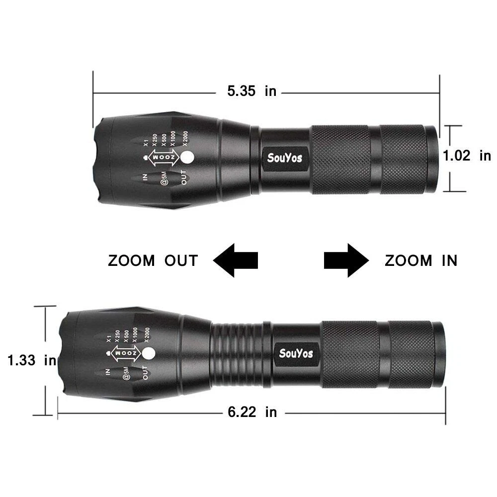SUPER BRIGHT : Our small flashlight may be compact, but it's also incredibly powerful. With its advanced LED technology, it can easily light up an entire room, making it ideal for both household and outdoor use. Whether you're camping, hiking, or just need a reliable flashlight around the house, our Super Bright Tactical Flashlight won't let you down. 5 MODES FOR VERSATILE USE Our Super Bright Tactical Flashlight features 5 different modes, including high brightness, medium brightness, low brightness, SOS, and strobe. This makes it perfect for a wide range of situations, from everyday use to emergencies. Whether you need to light up a dark room or signal for help, our flashlight has got you covered. ZOOMABLE BEAM FOR CUSTOMIZED LIGHTING:Our tactical flashlight also features an adjustable focus that lets you zoom in for a spotlight effect or zoom out for wider coverage. This feature makes it perfect for all kinds of activities, from camping and hiking to car repairs and power outages. WIDELY USED FOR ALL YOUR ADVENTURES:Our Super Bright Tactical Flashlight is perfect for a wide range of activities, including camping, hiking, outdoor adventures, walking the dog, and fishing. It's also a great tool to have on hand for emergencies like hurricanes or power outages. powerful illumination, and versatile features, our flashlight is the ultimate tool for all your adventures. Operated by 3*AAA Battery (not included)