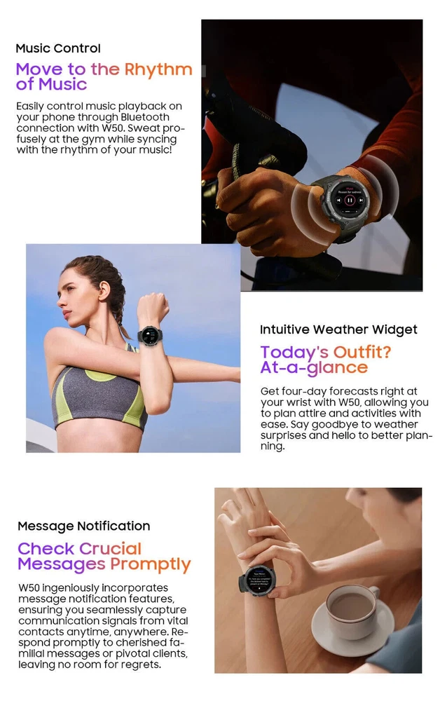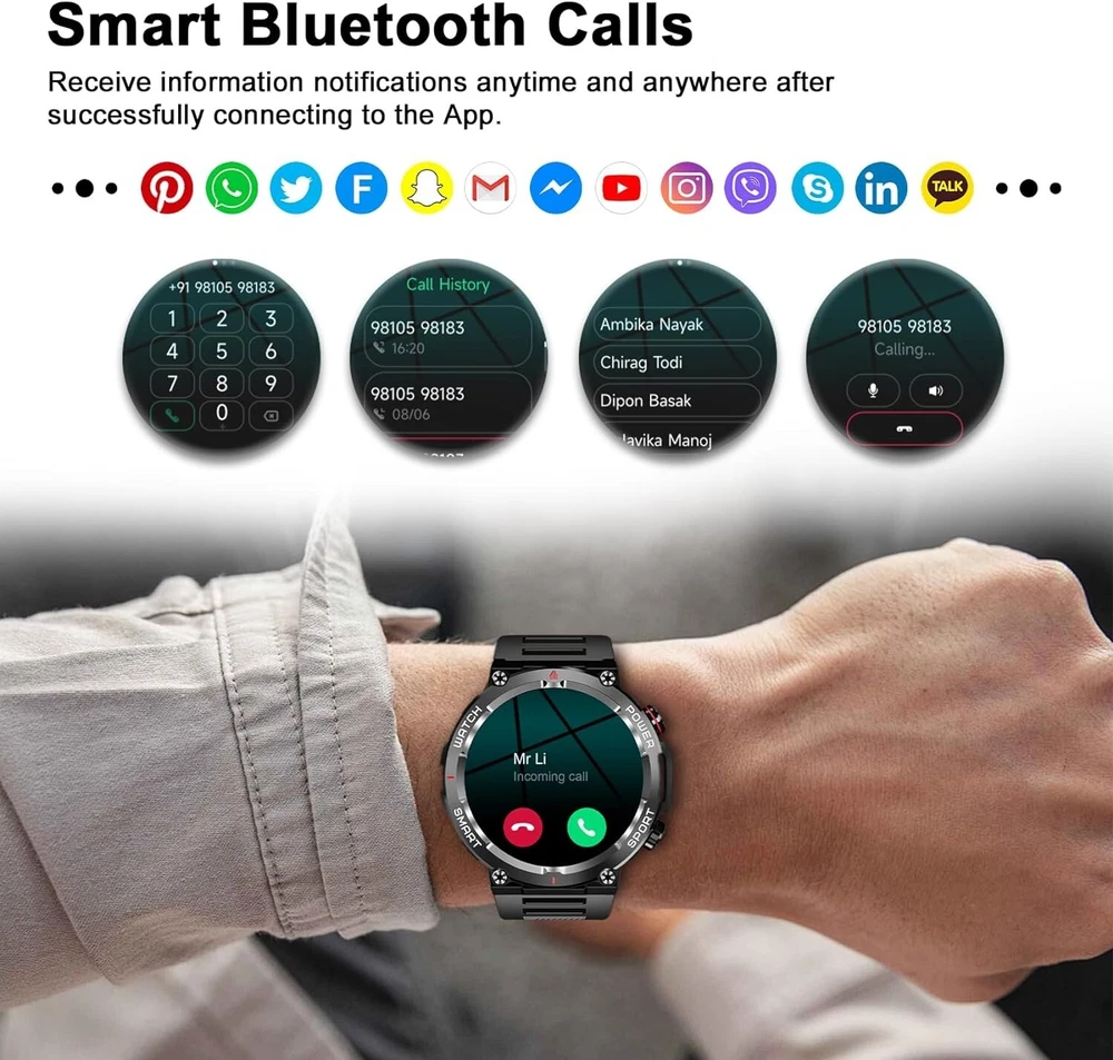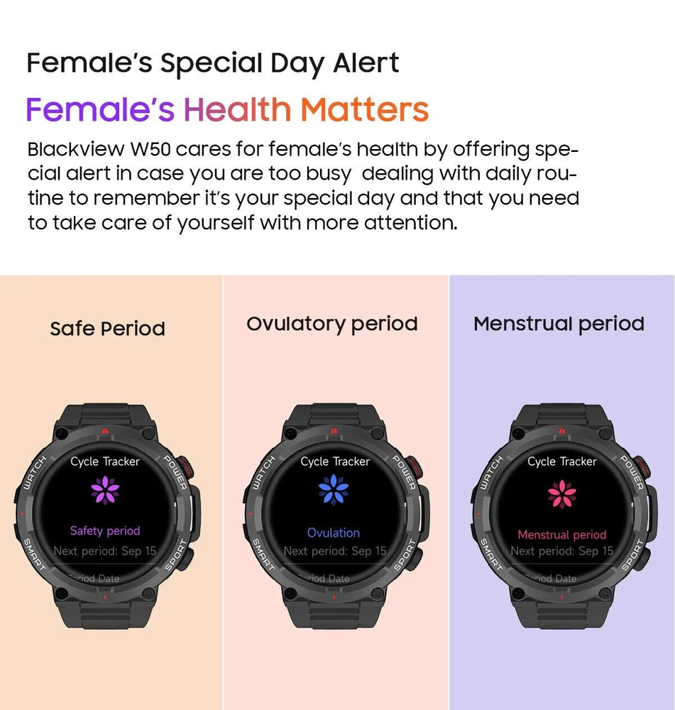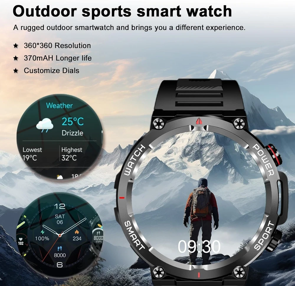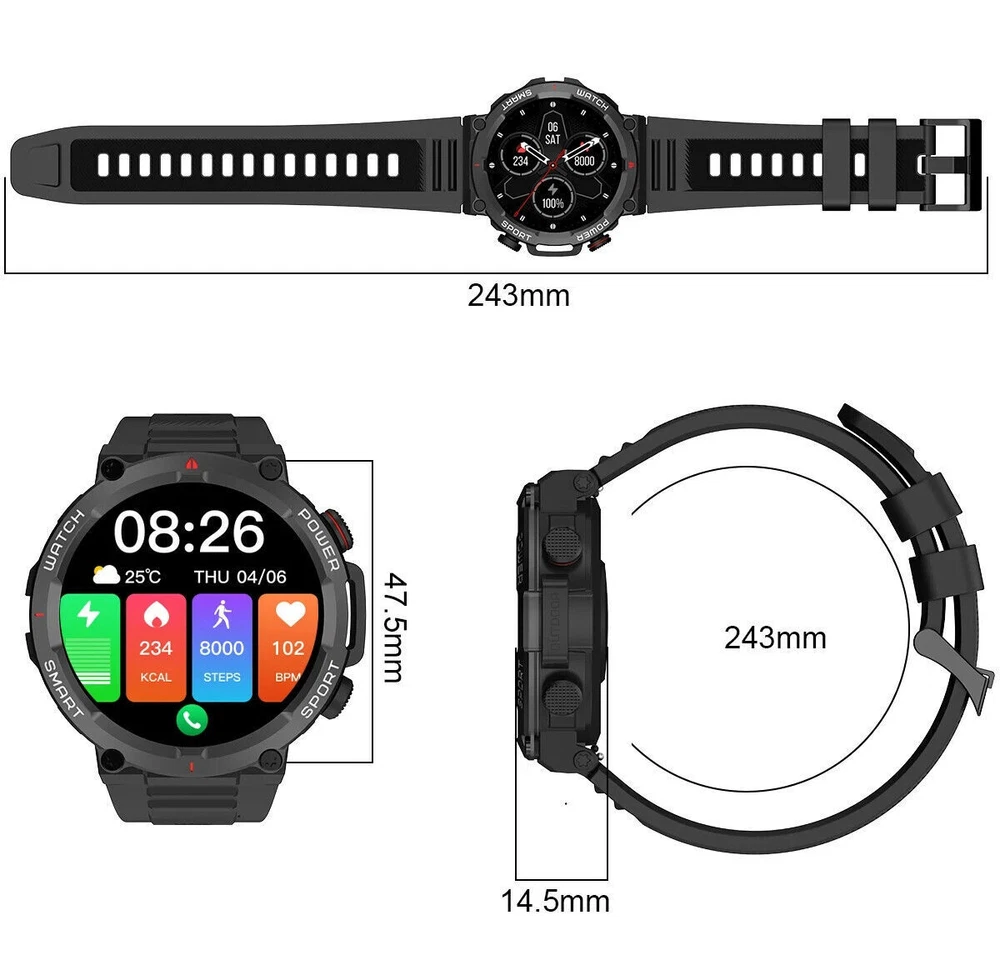 Military Smart Watch for Men (Call Receive/Dial) Rugged Tactical Fitness Tracker 👍 Fitness Tracker/ Bluetooth Calls/ Heart Rate/ Oxymeter/ Sleep/ Smart Notifications/ Pedometer/ Custom Dials/ Weather Forecast/ Sedentary Reminder/ Stopwatch/ Timer/ Alarm Clock/ Music Control/ Camera Control/ Don't Disturb Mode/ Find Phone and more👍 💥【Rugged Outdoor Smart Watch for Men】 Blackview W50 smartwatch is protected with scratch-resistant glass screen for durability. A robust fitness watch with a large 1.39'' Full HD screen that can display clearly and vividly for you. A variety of online watch faces make the watch more individual and unique. Equipped with 2 comfortable and skin-friendly wristbands (silicone band and woven band), the length can be adjusted freely. 💥【Bluetooth Calls, Answer/Make】 The smart watch for men supports Bluetooth calls, and the high-fidelity speaker and microphone can make and receive calls. It also supports syncing phone contacts and call logs. When your phone receives a call or message (such as SMS, E-mail, WhatsApp, Facebook, Instagram, etc.), the smart watch will give a real-time notification and you will never miss anything again. 💥【Health Monitor, Live Better】 The smartwatch for men also has a real-time health monitoring function, which records and monitors the user's health data, including heart rate, blood oxygen, emotional stress, sleep monitoring. This monitoring data can help you understand your health status, sleep quality and exercise activity in daily life, so that you can take appropriate measures to improve your health and lifestyle. 💥【100 Sports Modes】 This fitness watch for men supports 100 sports modes, meet your different sports needs. Choose the appropriate mode according to your sports scene (running/cycling/ball sports/martial arts/ice sports, etc.). In addition, the watch also supports recording your daily steps, calories burned and distance. You can analyze the watch's fitness data via "InfoWear" APP to achieve better training results. 💥 【Compatibility and Long Battery Life】 This fitness tracker is compatible with most smartphones, not suitable for iPads, tablets, PCs.Equipped with a 370mAh large-capacity battery, it supports 2.5 hours of fast charging, can last up to 20-30 days in standby, and can last up to 5 days in normal use. IP68 waterproof, you don't need to take off the watch in rainy days and when you wash your hands. (*Note: This product is not suitable for sauna, hot water, showering, diving, swimming) 🎁 【Stylish Gifts】 This fitness tracker smartwatch is the perfect gift for birthdays, anniversaries and special occasions. Perfect for those who enjoy outdoor or indoor activities. Perfect gift for dad, mom, brother, sister, friends, family, husband , wife on Christmas, Valentine's Day, Anniversary, Birthday, Thanksgiving. APP Infowear Waterproof 10M Band Colour Black Screen 1.39" HD Touch Screen MPN Does not apply Serial Number W50 Case Color Black Model02 W50 Smart Bracelet Case Colour Black Manufacturer Warranty 1 Years Network Bluetooth Case Size 1.39 Inches Features Blood Oxygen Sensor, Caller ID, ECG Monitor, Fitness Tracker, Heart Rate Monitor, Music Player, Sleep Monitor, Touchscreen, Waterproof, Water-Resistant, Bluetooth Call, Father's Day gift, birthday gift Operating System Android Wear Storage Capacity Flash 128MB Case Material Zinc alloy Band width 22mm Compatible With Android 4.4 & iOS 8.0 above Screen Size 1.39 Inches Brand Blackview Series Blackview W50 Type Blackview Smart Watch Battery Capacity 370mAh Band Color Black Band Material Silicone Compatible Phone Models For IOS,Android Design/Finish HD Touch Screen Model Smart Bracelet Compatible Operating System Android, iOS - Apple Country/Region of Manufacture China Connectivity Technology Bluetooth 5.3 Resolution 360*360