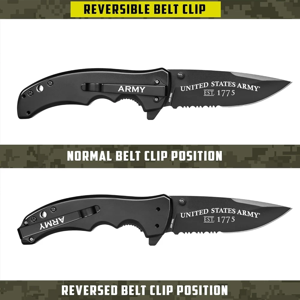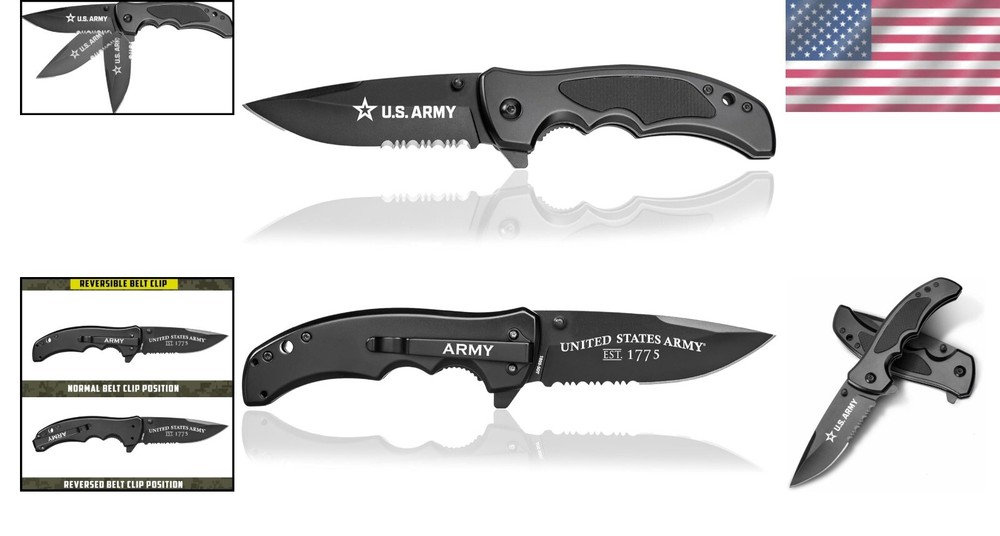 Military Heritage Tactical Knife - Black Titanium Blade for Fast Deployment ‹ › ‹ › ‹ › ‹ › ‹ › ‹ › ‹ › Military Heritage Tactical Knife Black Titanium Blade for Fast Deployment Features: Laser Engraved Army Logo & Est. 1775: Proudly displays the official US Army logo and "United States Army Established 1775" engraving, symbolizing military heritage and honor. Spring Assisted Opening: Designed for rapid and efficient one-handed deployment, ensuring readiness for any situation. Durable Black Titanium Coated Blade: Exceptional resistance to corrosion and wear, engineered for rigorous military life. Reversible Clip: Offers flexible carrying options for left and right-handed users, ensuring comfort and security in carry. Benefits: A powerful symbol of courage, dedication, and history of the US Army. Perfect gift for soldiers, veterans, and Army supporters, showcasing pride and appreciation for their service. Reliable companion in critical situations or everyday tasks. Versatile design built for durability, comfort, and secure carry. Lifetime guarantee backs the quality of each knife. Why choose our Military Heritage Tactical Knife? Honor the legacy of the United States Army with a knife that embodies the spirit of service and sacrifice. Its laser-engraved logo stands as a testament to what it means to uphold the values of the military. With its superior design, quick deployment, and durable construction, this tactical knife is not just a tool; it is a companion that is ready for action when you are. Perfect for active-duty personnel and veterans alike, this knife serves as a meaningful gift that celebrates their bravery and commitment. By choosing this knife, you are supporting a service-disabled Marine veteran-owned business, assuring that your purchase contributes to the well-being of military families. Get your Military Heritage Tactical Knife today and hold a piece of military history in your hand! Shipping Free & Fast Shipping - We offer free shipping to most of the USA with a normal delivery time of 3-7 days. However, due to the current situation, additional delivery time (up to 3 weeks) may be required for some items. Alternative Carriers - We may use alternative carriers (e.g. USPS, FedEx, UPS, etc.) to ensure your package arrives safely and on time. Due to the use of multiple carriers, we are unable to provide a tracking number automatically. Handling Time - Orders are processed and shipped within 1-2 business days of receiving cleared payment. Shipping Restrictions - Shipping to Alaska, Hawaii, Puerto Rico, Guam, and other US territories may incur shipping charges or delivery restrictions. Please contact us before ordering, or your order can be refunded/cancelled. State Restrictions - There may be restrictions based on your state of purchase. For example, certain items may not be shipped to California due to state regulations. Contact for Tracking Updates - If you require tracking updates or have any concerns about the delivery of your order, please feel free to contact us, and we will be happy to assist you. Return Please see our eBay Return Policy. Thank you. Payment We accept all major credit cards, PayPal, and Apple Pay for your convenience. Your payment information is secure and encrypted to ensure a safe and seamless transaction. Please complete your payment within 3 days of purchase to avoid any delays in shipping. Feedback Your feedback is extremely important to us. We strive to provide the best products and customer service possible. If you are satisfied with your purchase, please take a moment to leave us a positive review. If you have any concerns or issues with your order, please contact us before leaving negative feedback. We are committed to resolving any problems and ensuring your satisfaction. Contact Us If you have any questions or concerns, please feel free to reach out to our customer support team. You can contact us through the eBay messaging system. We are available Monday to Friday, 9:00 am to 5:00 pm EST, and we will do our best to respond to your inquiry within 24 hours. Thank you for supporting our small family business! Year: Not Set Blade Type: Clip Point,Drop Point,Hawkbill,Karambit,Leaf,Needle Point,Pen,Sheepsfoot,Spear Point,Spey Point,Straight Back,Tanto,Trailing Point,Wharncliffe Tools: Bottle Opener,Corkscrew,Fish Scaler,Fork,Magnifying Glass,Marlinspike,Nail File,Punch,Saw,Scissors,Screw Driver,Spoon,Toothpick,Tweezers,Wrench,None Brand: Unbranded Model: Not Set Number of Blades: 1 Color: Black Type: Tactical Handle Material: Carbon Steel Opening Mechanism: Assisted Product Line: Military Lock Type: Not Set Blade Edge: Plain Blade Range: Over 4in. Blade Material: Carbon Steel Original/Reproduction: Not Set Dexterity: Ambidextrous Country/Region of Manufacture: Not Set