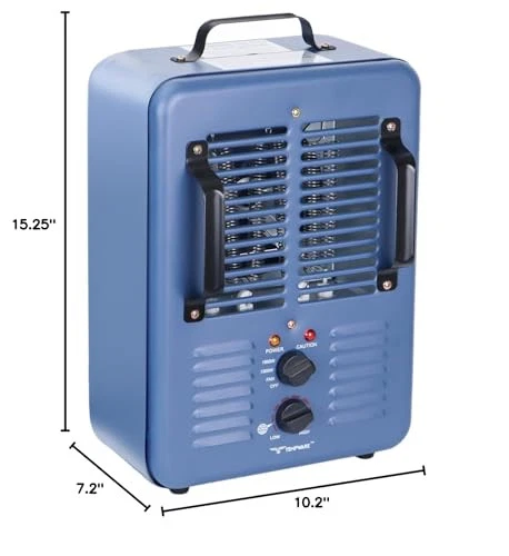 ☀Built to Last: compact milkhouse heater with thermostat is made of metal material, which is very strong and durable. It can last for a long time use. In addition, it has also passed ETL certification to ensure safety us ☀Safety Design: Our small heater is equipped with an automatic overheat protection device located inside the body of the heater. If milkhouse heater gets too hot for any reason, the automatic overheat protect device will turn the heater off. It also features a tip-over switch that automatically shuts off the heater if it accidentally falls or gets knocked over, preventing potential hazards. ☀Adjustable Thermostat with Anti-Freeze Setting : This portbale space heater for indoor use has 3 adjustable power levels: fan-only/1300W/1500W, providing targeted heating to meet your needs. When set to the anti-freeze setting, Milkhouse heater will turn on whenever the temperature drops below 40°F. ☀Fast Heating: This portable utility heater with high quality heating elements and power up to 1500W, only takes 3 seconds to heat up warmth for relatively small spaces, offering a comfortable and consistent temperature. ☀Portable & Compact: Our milkhouse heater is designed with a solid carry handle, with which you can take it to anywhere you want easily. Portable space heater is small, light and exquisite. Perfect for the bedroom, bathroom, office whever you need heat. Reduce heating bills with safe space heater.