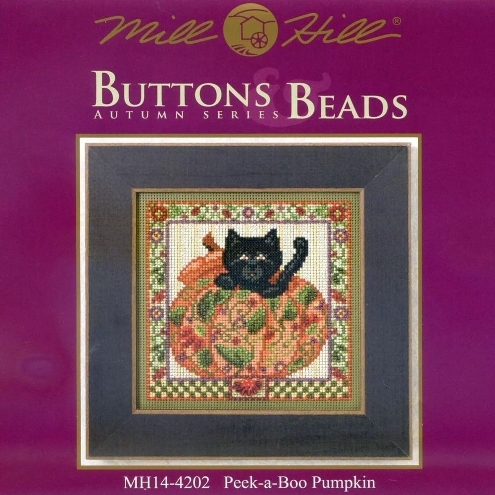 Mill Hill Button & Beads Kit - Peek a Boo Pumpkin 5" x 5 " Counted Cross Stitch Kit Includes: Mill Hill Glass Beads Mill Hill Button, Mill Hill 14 Count Perforated Paper, Floss, Needles and Chart with Instructions. Frame and Pin Kit not Included