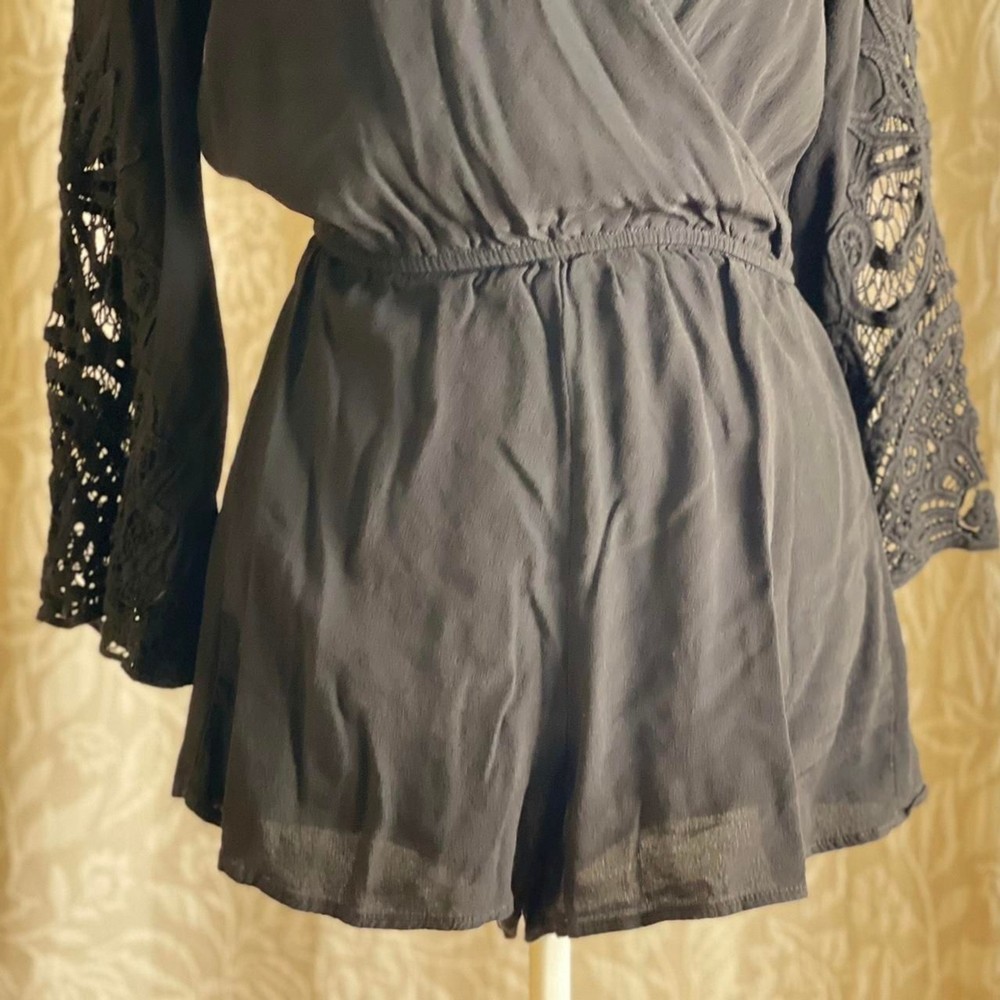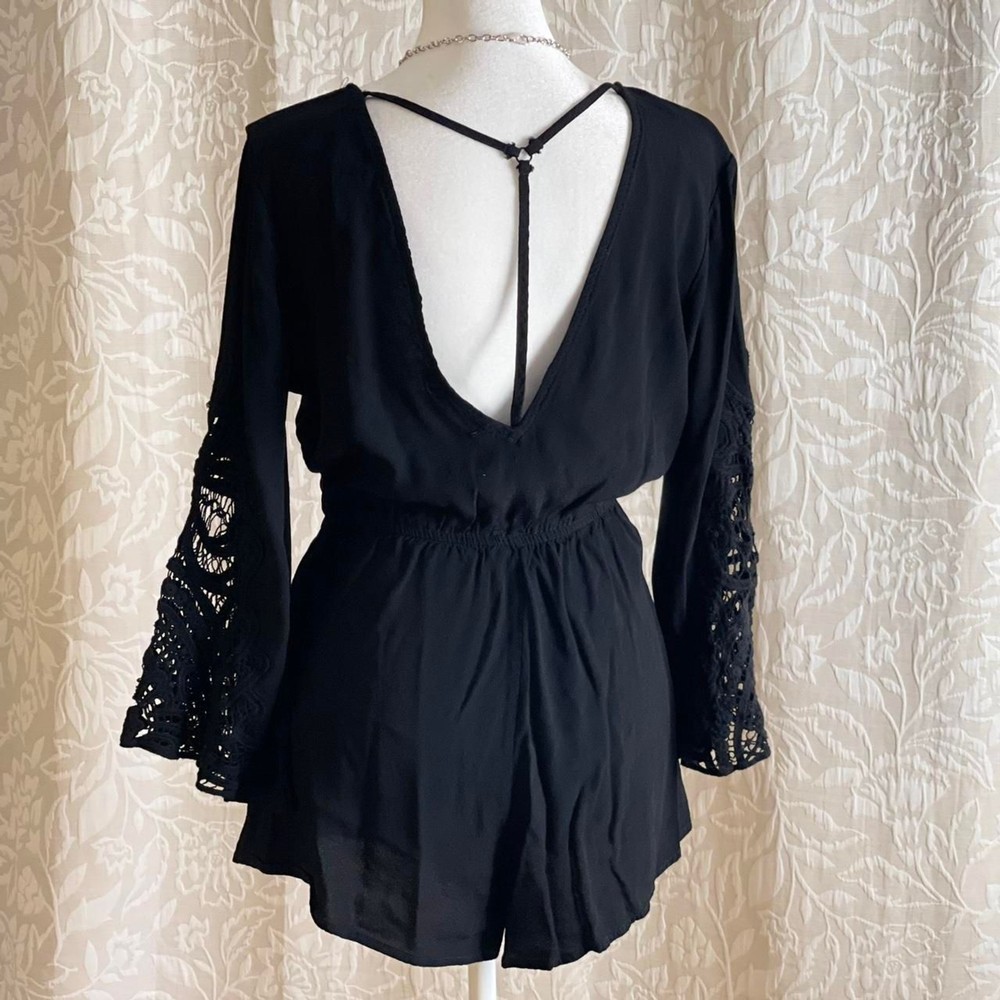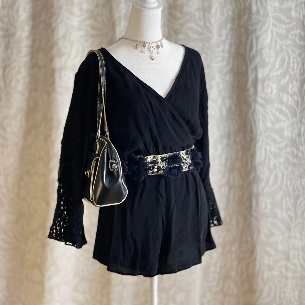 Meet your new go-to for moonlit summer nights and festival fairytale vibes. This black long sleeve romper by Millau features romantic crochet bell sleeves, a flattering wrap-style bodice, and a sultry open back with adjustable strappy detail. Whether styled with boots and a belt or worn barefoot on the beach, this piece radiates dark boho magic. Excellent condition with only minor wear at the back strap connection (see photo) — barely noticeable but noted for accuracy! * Brand: Millau * Size: XS * Condition: Excellent; slight wear at strap attachment point * Color: Jet black Lay flat measurements: - pit to pit: 19" - shoulder to shoulder: 17" - shoulder to hem: 25" - waist: 11" - hips: 21" - waist to hem: 12" - sleeve length: 18.5" - inseam: 1.5" Mannequin measurements: - bust: 32" - hips: 24.5" - waist: 34"