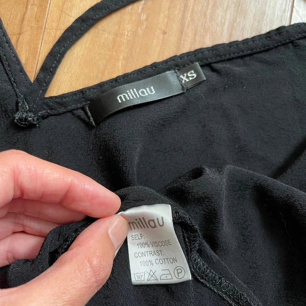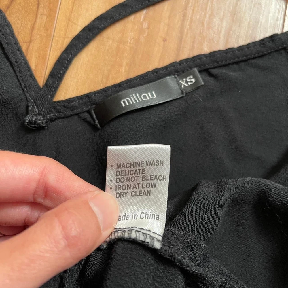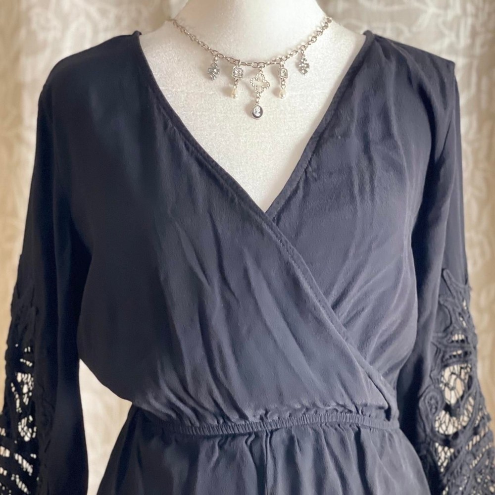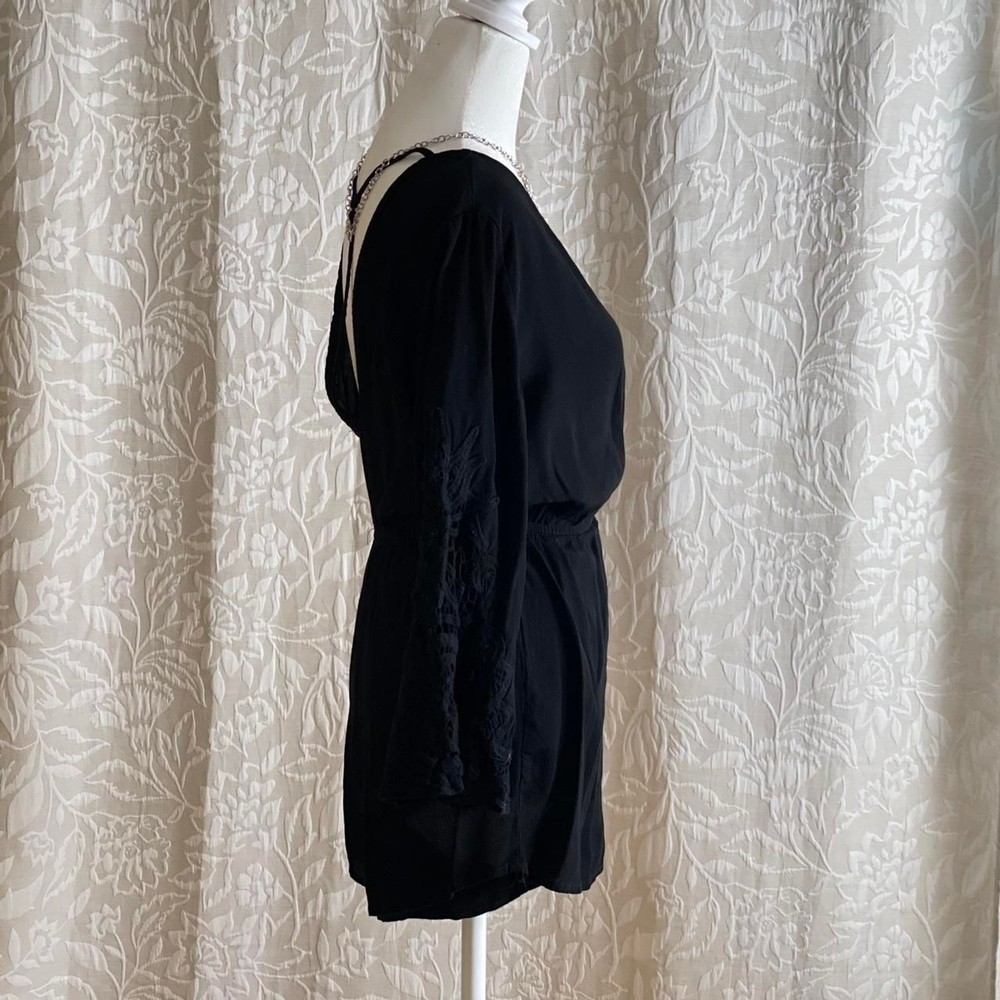 Meet your new go-to for moonlit summer nights and festival fairytale vibes. This black long sleeve romper by Millau features romantic crochet bell sleeves, a flattering wrap-style bodice, and a sultry open back with adjustable strappy detail. Whether styled with boots and a belt or worn barefoot on the beach, this piece radiates dark boho magic. Excellent condition with only minor wear at the back strap connection (see photo) — barely noticeable but noted for accuracy! * Brand: Millau * Size: XS * Condition: Excellent; slight wear at strap attachment point * Color: Jet black Lay flat measurements: - pit to pit: 19" - shoulder to shoulder: 17" - shoulder to hem: 25" - waist: 11" - hips: 21" - waist to hem: 12" - sleeve length: 18.5" - inseam: 1.5" Mannequin measurements: - bust: 32" - hips: 24.5" - waist: 34"