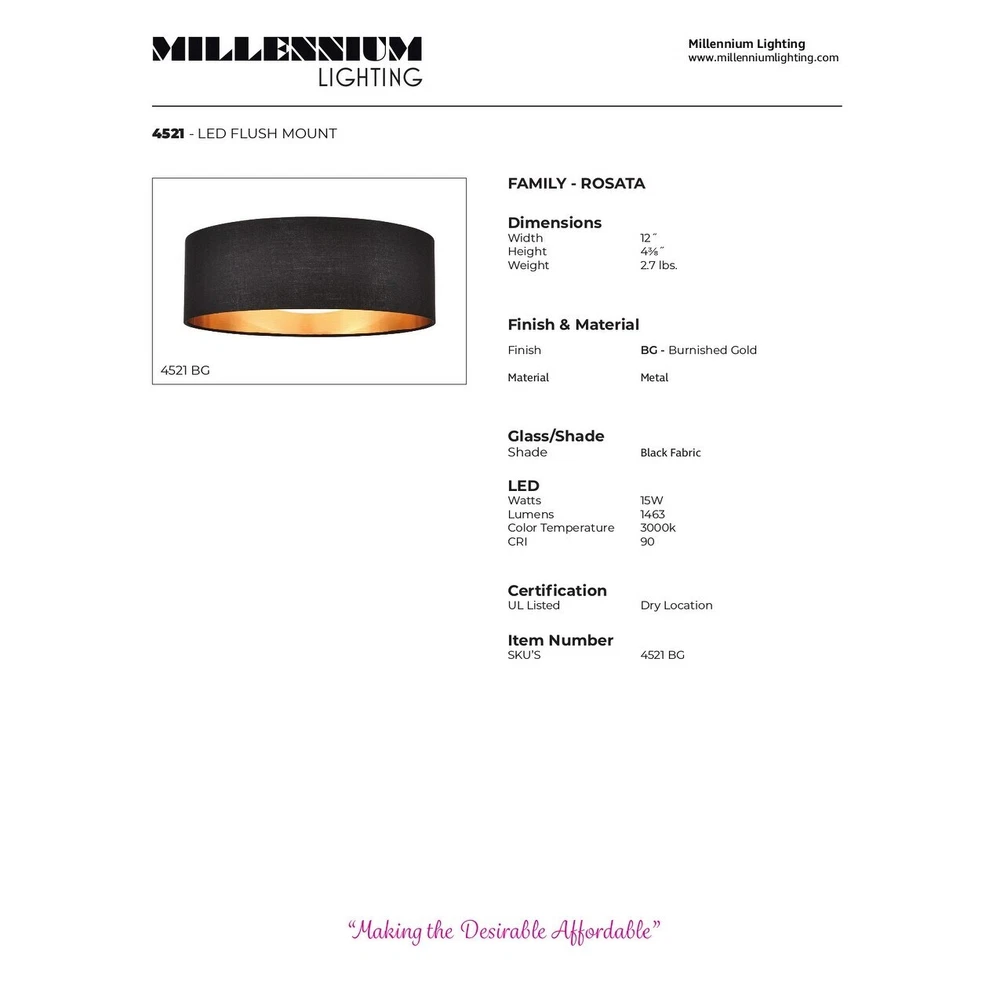 Elevate your overhead lighting with the Millennium Lighting Rosata Flush Mount Ceiling Light. This light fixture offers a creative and innovative lighting solution for any room. Please note that light bulbs are not included.Features: Light bulbs not included Compatible with standard wall dimmer 1 Year limited manufacturer's warranty UL listed Meets CSA standardsOther information: Rated for dry location. Free Shipping Over $49.99* Details Millennium Lighting Rosata Flush Mount Ceiling Light Product Description: Elevate your overhead lighting with the Millennium Lighting Rosata Flush Mount Ceiling Light. This light fixture offers a creative and innovative lighting solution for any room. Please note that light bulbs are not included. Features: Light bulbs not included Compatible with standard wall dimmer 1 Year limited manufacturer's warranty UL listed Meets CSA standards Other information: Rated for dry location.