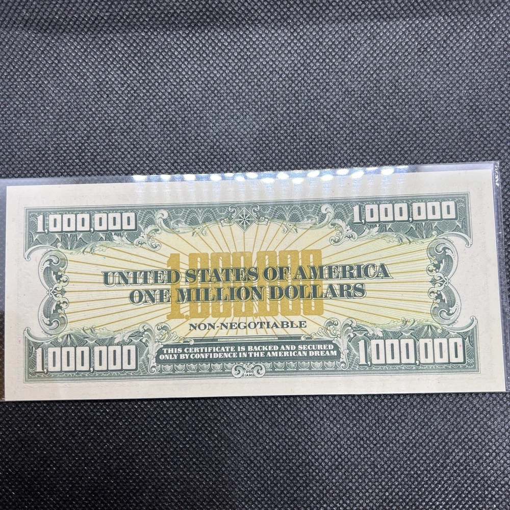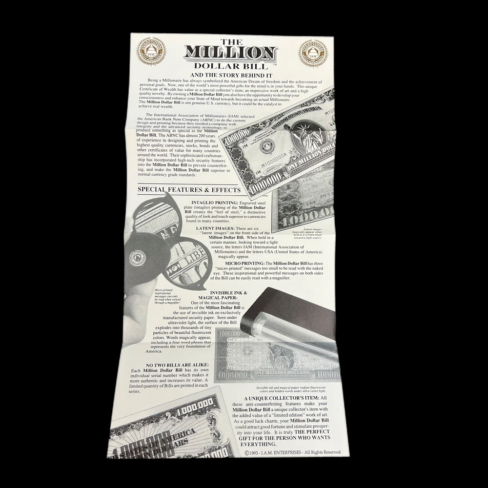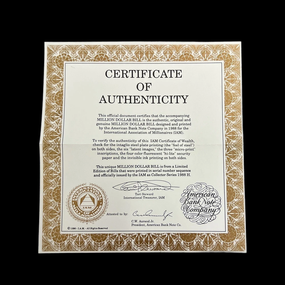 Million Dollar Bill - IAM Collector Series 1988 With Cert of Auth & Paperwork "The Million Dollar Bill" was designed and Printed by the American Bank Note Company for the International Association or Millionaires (IAM). This unique Million Dollar Bill is from a Limited Edition of Bills that were printed in serial number sequence and officially issued by the IAM as a collectors series (1988 A). The Bill comes in a display folder and the story behind this extremely interesting symbol of the American dream! This bill's serial number is M1371485H. What a gift for the holiday!