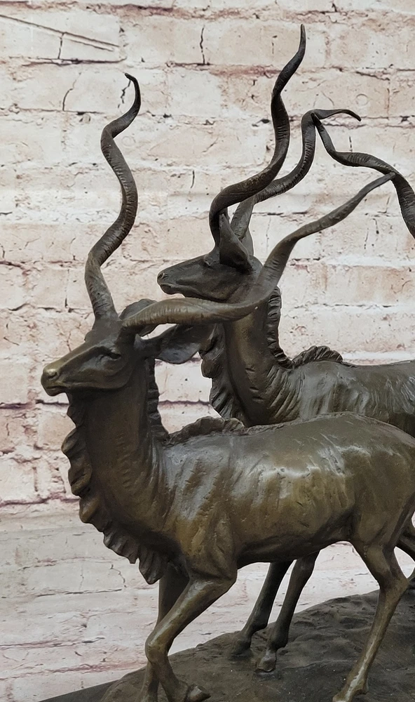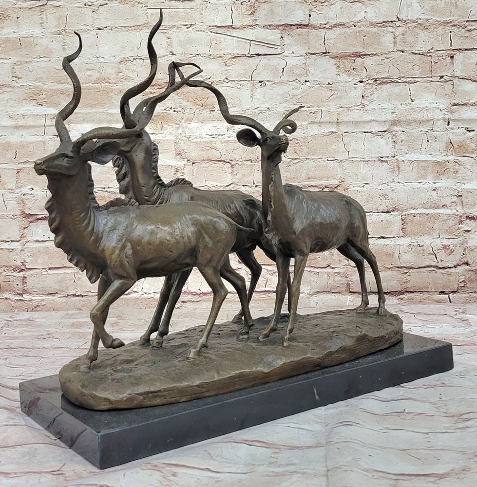 Milo`s Handmade Wildlife Bronze Figurine - Kudu Antelope Family Classic Art Sale Milo`s Handmade Wildlife Bronze Figurine - Kudu Antelope Family Classic Art Sale Condition : This sculpture is in perfect condition. Bronze Dimensions with Marble Base: Height 15.5" X Width 17" Marble Dimensions:17" X 7.5" Height without base:14.5" Weight:29 LBS Step into the untamed beauty of the African savannah with the "Kudu Antelope Family" bronze sculpture, a captivating masterpiece by the skilled artist Milo. Crafted with meticulous detail using the time-honored lost wax method, Milo's expertise breathes life into bronze, creating an evocative portrayal of a gazelle family. The graceful curves and intricate features of the Kudu Antelope showcase Milo's commitment to capturing the essence of these majestic African deer. Resting proudly on a sleek black marble base, this sculpture is more than a mere representation; it is a harmonious fusion of art and nature. Milo's signature adorns this original artwork, certifying its authenticity and marking it as a unique collector's piece. The brown patina applied to the bronze enhances the natural beauty of the Kudu Antelope, adding depth and warmth to every curve and contour. As an exquisite home or office decoration, the "Kudu Antelope Family" bronze sculpture by Milo invites you to connect with the spirit of the African plains. Whether displayed as a standalone piece or part of a curated collection, Milo's creation serves as a testament to the enduring allure of wildlife art and the craftsmanship that brings nature's beauty into the heart of your space. Kudu Antelope Family Gazelle African Deer Bronze Sculpture Figurine Statue www.bronzhaus.com Video will open in a new window Using the eBay App? Paste link into a browser window: [isdntekvideo] Shipping Terms : Most of our items are shipped via USPS (United States Postal Service) mail or UPS. Most orders are shipped within 24-48 hours of purchase. Please be aware that not all items are available for USPS shipping due to size and weight. We do ship to Hawaii, Alaska, Canada, Puerto Rico, APO/AE, and U.S. Virgin Islands, however, an additional charge may be required. Please contact us before making any purchases in these areas. For Non-USA customers, you may be responsible for all duty, tax, brokerage fees that may be due upon delivery (shipping costs cover freight charges only). We also ship internationally. Please refer to the "Shipping and Handling" chart for the rates for each area. Payment : We accept just about any form of payment. PayPal, Master Card, Visa or American Express credit cards. Money orders, cashiers checks, and even personal or business checks. For governmental institutions, we will also accept a purchase order. Please understand that for personal or business checks we have to wait for the check to clear (usually 7 days) before shipping. Condition : New Detailed Hand Crafted Hot Cast Bronze Satisfaction Guaranteed. This is Stock Photo, Slight Color Variation!! Listing and template services provided by inkFrog