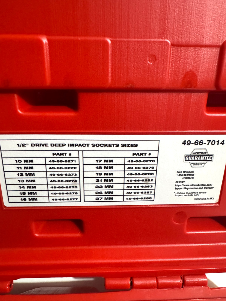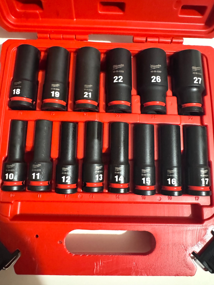Milwaukee 1/2” Drive Deep Impact Socket Set – Metric (14-Piece) with Hard Case. This is a heavy-duty professional impact socket set designed for use with high-torque impact wrenches. Built with Milwaukee’s durable black oxide finish for corrosion resistance and long service life, these deep sockets are ideal for automotive, mechanical, and industrial applications where strength and reliability are essential. The set includes a full range of commonly used metric sizes and comes organized in a sturdy Milwaukee molded case for easy storage and transport. Set Includes: 10mm, 11mm, 12mm, 13mm, 14mm, 15mm, 16mm, 17mm, 18mm, 19mm, 21mm, 22mm, 26mm, 27mm Key Features: 1/2” Drive Deep Impact Sockets 6-Point design for secure fastener grip Black oxide finish for durability High-strength construction for impact use Metric sizing Milwaukee hard storage case included Lifetime guarantee (as marked on case) Condition: Excellent condition. Clean, fully functional, and ready for use. Case included. Ideal for mechanics, tradespeople, or anyone needing a reliable impact-rated metric socket set.