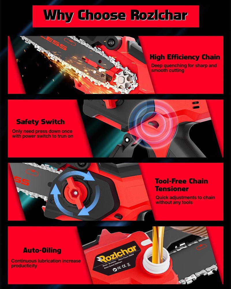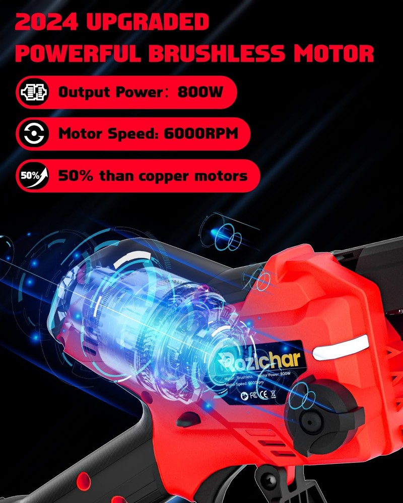 battery powered chainsaw(Battery Not Incuded) is compatible for 48-11-1820, 48-11-1850, etc. We suggest that you can plug in the original battery to get your job done fast and easy, eliminating the need for cords, and get rid of mixing gas to clog up your carburetor! Besides, it's settled down low-voltage protection to ensure the machine will automatically shut down when the battery voltage is below 14.4v, prevent any overload damage. Battery Powered Design: mini chainsaw is compatible for milwaukee 18v battery(for 48-11-1811, 48-11-1820, 48-11-1850, 48-11-1860, etc)(Battery Not Incuded). We suggest that you can plug in the original battery to get your job done fast and easy, eliminating the need for cords, and get rid of mixing gas to clog up your carburetor! Besides, it's settled down low-voltage protection to ensure the machine will automatically shut down when the battery voltage is below 14.4v, prevent any overload damage. 800W High-efficiency Cutting: pruning chainsaw is adopted with a super powerful 800W/6000rpm brushless motor and sharp blades, offers the high cutting speed up to 42ft/s, so cut a 6" log only need 6s as quick as cutting butter! Besides, the upgraded motor allows continuous & smooth cutting, more powerful, higher speeds, meet your any needs for easy cutting, and built-in fan and heat sink for cooling the motor quickly, avoid burning the motor from long working time 8-Inch and 6-Inch Combo: We combine 6"and 8" chainsaw as a suit to meet your extensive choice, like tree trimming, branches pruning, wood cutting, etc. The high hardness quenched chain ensure high hardness, solid, sharp, and cut flatter, offer more flexibility for cutting different sizes of woods, widely used in yard, gardens, ranch, fireplace, camping,trail Riding, trailer, forests. Auto-Oiling Setting: Our mini saw has a built-in 50ml oil tank for auto chain lubrication system. While the machine is running, it will lubricate the chain regularly automatically and ensure fresh ample layer of oil is evenly throughout all the groove, offer smooth cutting and reduce wear and tear, optimize bearing and mechanical life, let your hands get rid of staining. Moreover, we also prepare an empty oil bottle for your outdoor cutting need. Lightweight & Tool-free Chain Tensioner: It only weight 2.2 lbs, very lightweight and portable, even easily used by the elderly and women. Equipped with the tool-free chain tensioning and bar lock knob making it easy to install and replace chain, and adjust chain tension. Safty Lock & What You Get: This cordless chain saw need be activated by pressing the safety button and the switch at the same time, ensure personal safety especially for beginners when misplay switches. Package includes: 1* pruning chainsaw (battery not included), 1*oil bottle, 1* 6" guide bar and chain (already installed on the machine), 1*8" guide bar, 2*8" saw chain, 1 * 6 Inch chain, 1*wooden brush, 1*user manual. If you have any questions about the item, please contact us, we'll try our best to help you solve it.