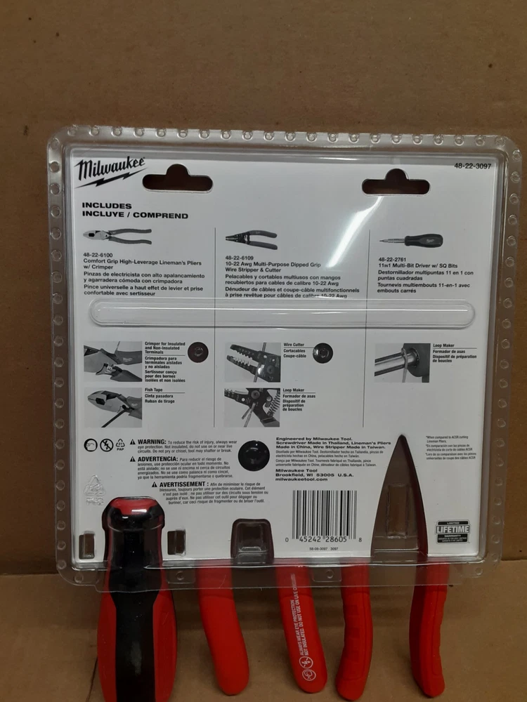 The Milwaukee 3 Pc. Hand Tool Kit 28-22-3097 includes 3 hand-operated tools in a vibrant red color. The kit contains tools from the brand Milwaukee, known for its quality and durability, and comes with a lifetime manufacturer warranty. The item measures 12" in length, 2" in height, and 9" in width, weighing 3 lbs. It does not include a battery and is designed for manual operation, making it a reliable set for various home and garden projects.