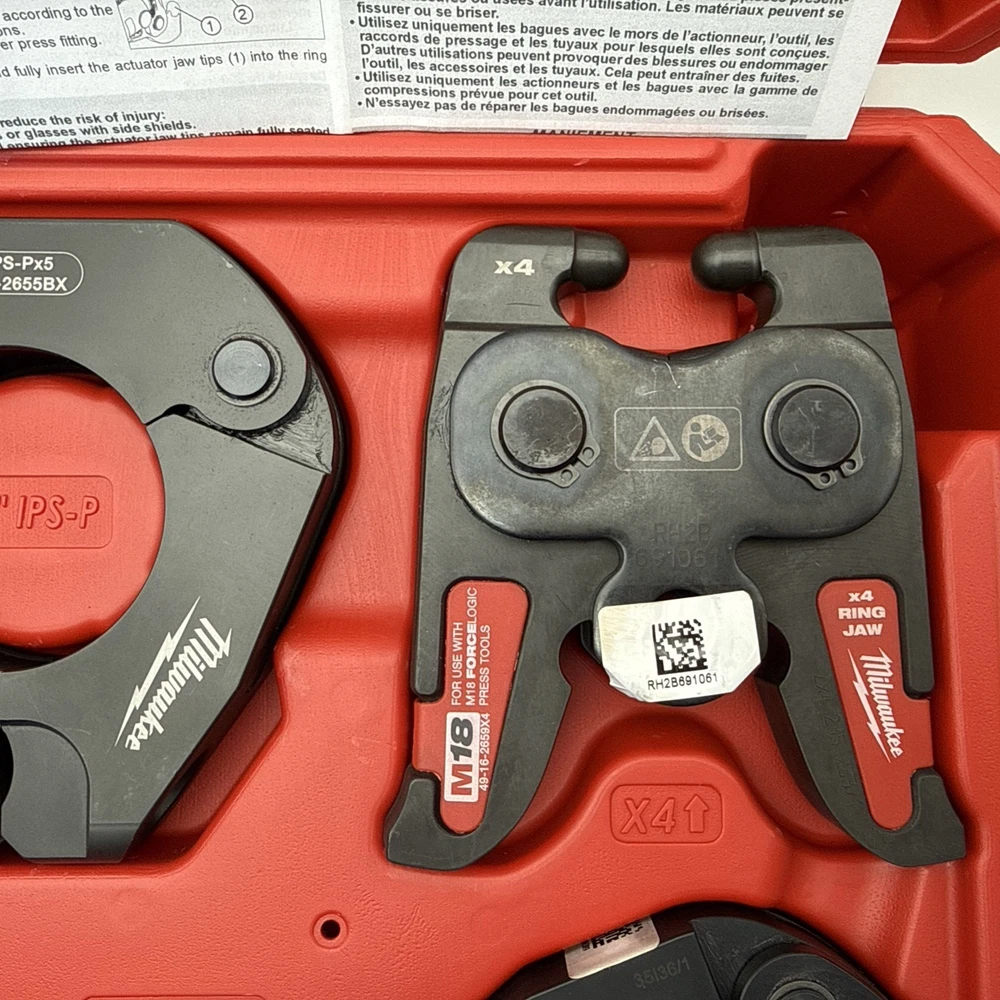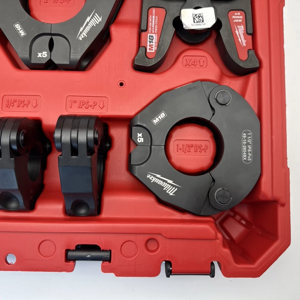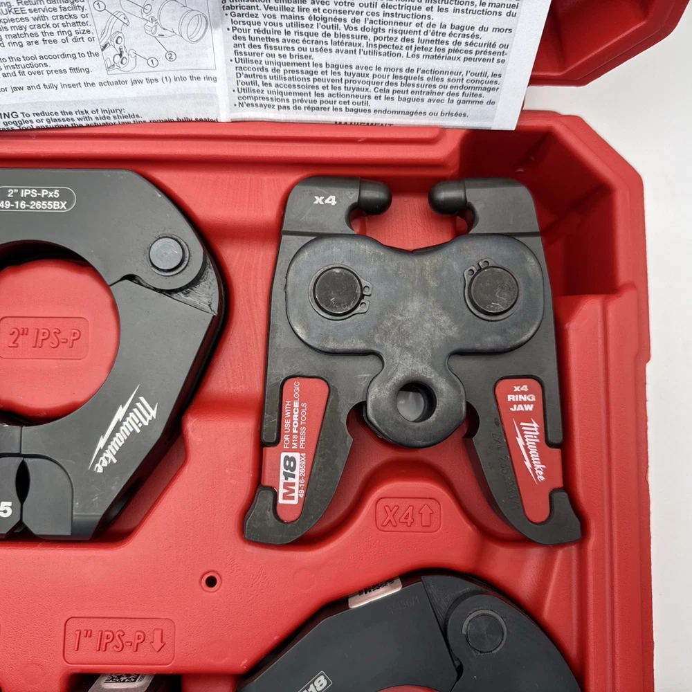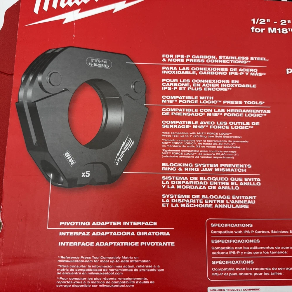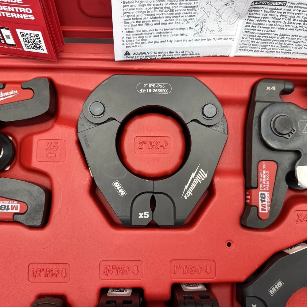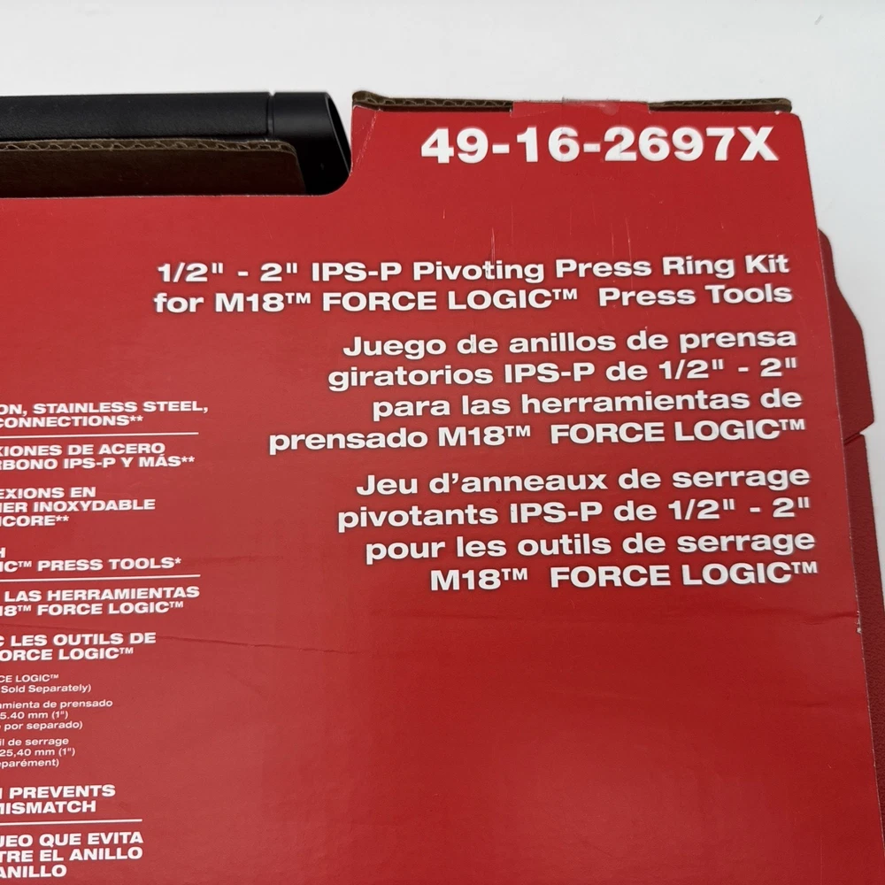 1/2" - 2" IPS-P Pivoting Press Ring Kit for M18™ FORCE LOGIC™ Press Tools 304 Stainless Steel, 316 Stainless Steel, Black Iron Read a Review. Same pag Our 1/2" – 2” IPS-P Pivoting Press Ring Kit is designed for use with M18™ FORCE LOGIC™ Press Tools on Viega® MegaPress®, Apollo® PowerPress® and other press fitting systems. The IPS-P Pivoting Press Ring Kit is a more efficient alternative to welding and threading, enabling you to press connections on schedule 5 up to schedule 40 black iron pipe and 304/316 stainless steel pipe. Pivoting functionality delivers greater access in tight spaces when paired with the X4 Ring Jaw & M18™ FORCE LOGIC™ Press Tools or the X5 Ring Jaw & M18™ FORCE LOGIC™ Press Tools. Additionally, MILWAUKEE®'s press blocking system prevents improper ring and ring jaw mismatch providing peace of mind in quality connections. The 1/2" – 2” IPS-P Pivoting Press Ring Kit, combined with the ring jaw and in-line M18™ FORCE LOGIC™ Press Tools, deliver unrivaled access in tight spaces and around installed pipes, providing you with controlled, flameless connections for unmatched productivity. Ring Jaw Made in Turkey and Poland. Includes (1) 1/2" IPS-P Pivoting Press Ring for M18™ & M12™ FORCE LOGIC™ Press Tools (49-16-2650BX) (1) 3/4" IPS-P Pivoting Press Ring for M18™ & M12™ FORCE LOGIC™ Press Tools (49-16-2651BX) (1) 1" IPS-P Pivoting Press Ring for M18™ & M12™ FORCE LOGIC™ Press Tools (49-16-2652BX) (1) 1-1/4" IPS-P Pivoting Press Ring for M18™ FORCE LOGIC™ Press Tools (49-16-2653BX) (1) 1-1/2" IPS-P Pivoting Press Ring for M18™ FORCE LOGIC™ Press Tools (49-16-2654BX) (1) 2" IPS-P Pivoting Press Ring for M18™ FORCE LOGIC™ Press Tools (49-16-2655BX) (1) X4 Ring Jaw for M18™ FORCE LOGIC™ Press Tools (49-16-2659X4) (1) X5 Ring Jaw for M18™ FORCE LOGIC™ Press Tools (49-16-2659X5) (1 (1) Hard Carrying Case Compatible with M18™ FORCE LOGIC™ Press Tools Designed for use with all Major Fitting Brands, Including Viega® MegaPress® and Apollo® PowerPress® Pivoting Functionality Delivers Greater Access in Tight Applications Blocking System Prevents Ring & Ring Jaw Mismatch Faster Alternative to Welding and Threading Spring-Loaded Ring for Quick and Easy Alignment to Fitting Durable Steel Rings Provide Outstanding Life 2 Year Warranty