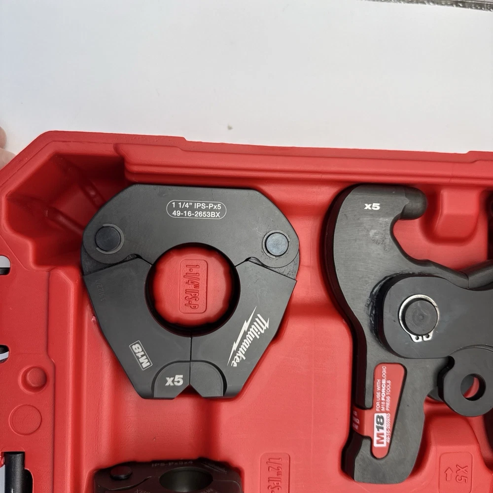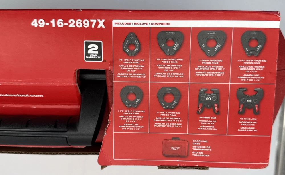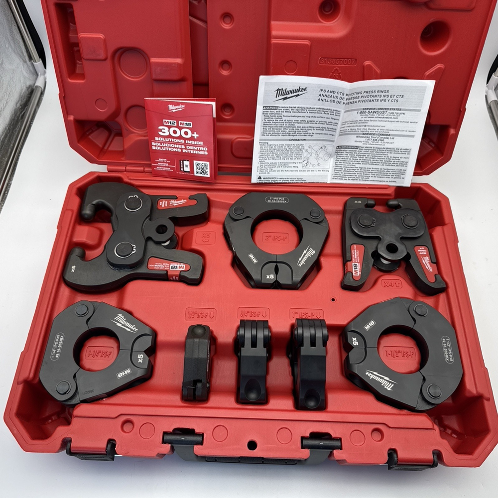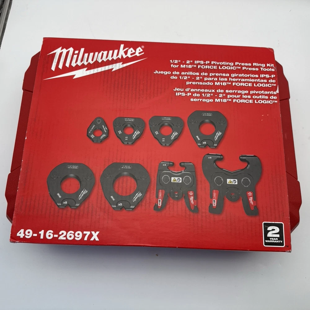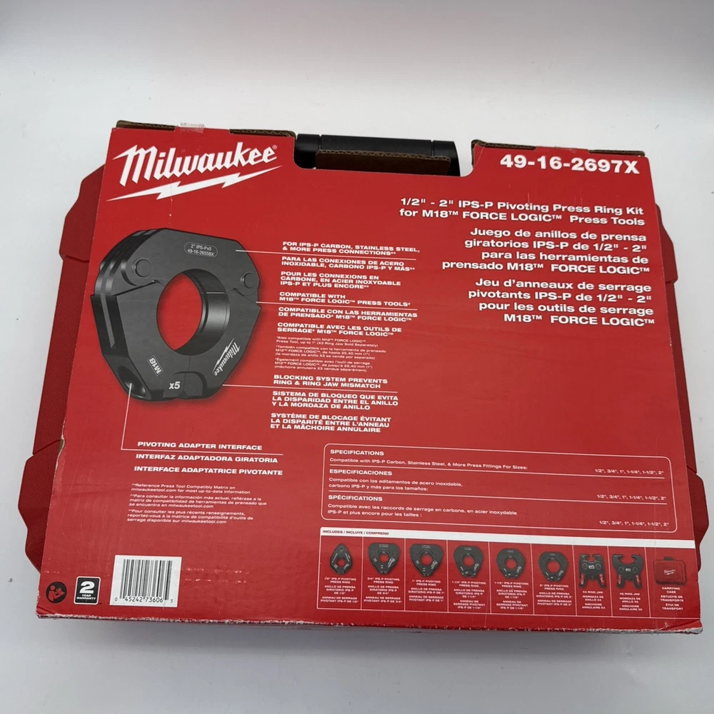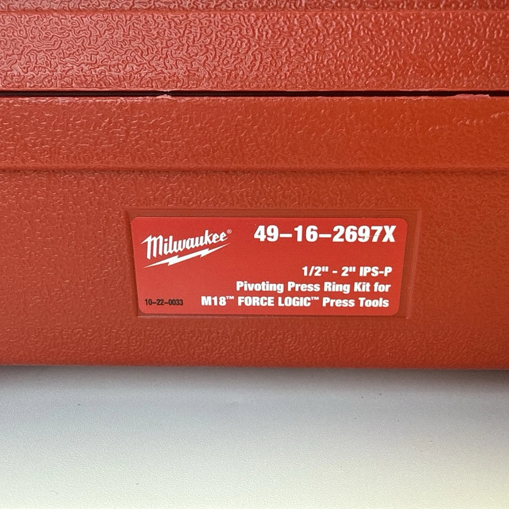 1/2" - 2" IPS-P Pivoting Press Ring Kit for M18™ FORCE LOGIC™ Press Tools 304 Stainless Steel, 316 Stainless Steel, Black Iron Read a Review. Same pag Our 1/2" – 2” IPS-P Pivoting Press Ring Kit is designed for use with M18™ FORCE LOGIC™ Press Tools on Viega® MegaPress®, Apollo® PowerPress® and other press fitting systems. The IPS-P Pivoting Press Ring Kit is a more efficient alternative to welding and threading, enabling you to press connections on schedule 5 up to schedule 40 black iron pipe and 304/316 stainless steel pipe. Pivoting functionality delivers greater access in tight spaces when paired with the X4 Ring Jaw & M18™ FORCE LOGIC™ Press Tools or the X5 Ring Jaw & M18™ FORCE LOGIC™ Press Tools. Additionally, MILWAUKEE®'s press blocking system prevents improper ring and ring jaw mismatch providing peace of mind in quality connections. The 1/2" – 2” IPS-P Pivoting Press Ring Kit, combined with the ring jaw and in-line M18™ FORCE LOGIC™ Press Tools, deliver unrivaled access in tight spaces and around installed pipes, providing you with controlled, flameless connections for unmatched productivity. Ring Jaw Made in Turkey and Poland. Includes (1) 1/2" IPS-P Pivoting Press Ring for M18™ & M12™ FORCE LOGIC™ Press Tools (49-16-2650BX) (1) 3/4" IPS-P Pivoting Press Ring for M18™ & M12™ FORCE LOGIC™ Press Tools (49-16-2651BX) (1) 1" IPS-P Pivoting Press Ring for M18™ & M12™ FORCE LOGIC™ Press Tools (49-16-2652BX) (1) 1-1/4" IPS-P Pivoting Press Ring for M18™ FORCE LOGIC™ Press Tools (49-16-2653BX) (1) 1-1/2" IPS-P Pivoting Press Ring for M18™ FORCE LOGIC™ Press Tools (49-16-2654BX) (1) 2" IPS-P Pivoting Press Ring for M18™ FORCE LOGIC™ Press Tools (49-16-2655BX) (1) X4 Ring Jaw for M18™ FORCE LOGIC™ Press Tools (49-16-2659X4) (1) X5 Ring Jaw for M18™ FORCE LOGIC™ Press Tools (49-16-2659X5) (1 (1) Hard Carrying Case Compatible with M18™ FORCE LOGIC™ Press Tools Designed for use with all Major Fitting Brands, Including Viega® MegaPress® and Apollo® PowerPress® Pivoting Functionality Delivers Greater Access in Tight Applications Blocking System Prevents Ring & Ring Jaw Mismatch Faster Alternative to Welding and Threading Spring-Loaded Ring for Quick and Easy Alignment to Fitting Durable Steel Rings Provide Outstanding Life 2 Year Warranty