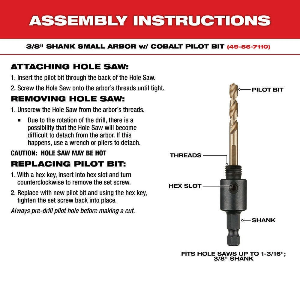 You may also like DEWALT DCST922B 20V MAX Li-Ion 14 in. Cordless String Trimmer L Shaft Bare Tool 118.68 USD 129.0 USD Free shipping 8% off Milwaukee M12/M18 6 Bay Sequential Rapid Battery Charger, Model 48-59-1807 US 210.68 USD 229.0 USD Free shipping 8% off Milwaukee 49-16-2721 M18 FUEL 18V 3-Foot QUIK-LOK Extension Attachment NEW 63.48 USD 69.0 USD Free shipping 8% off DEWALT 20V MAX XR Brushless Li-Ion Cordless Pole Saw (Tool Only) New DCPS620B US 183.08 USD 199.0 USD Free shipping 8% off Milwaukee 48-22-8427 PACKOUT Rolling Tool Box w/ 250 lbs Weight Capacity NEW US 147.19 USD 159.99 USD Free shipping 8% off Milwaukee M12 2552-20 M12 FUEL 12V 1/4-Inch Stubby Impact Wrench-Bare Tool US 118.68 USD 129.0 USD Free shipping 8% off DEWALT 20V MAX 8" Pruning Chainsaw Brushless Cordless Bare Tool DCCS623B NEW 136.15 USD 147.99 USD Free shipping 8% off Milwaukee SHOCKWAVE 1/2" Drive Metric 6 Point Impact Socket Set-29PC 49-66-7015 173.88 USD 189.0 USD Free shipping 8% off Dewalt 20V Max Brushless Cordless Edger Bare Tool DCED400B NEW US 173.88 USD 189.0 USD Free shipping 8% off DeWALT DCE400B 1-Inch Pex Cordless Rotating Head Expansion Bare Tool NEW US 339.48 USD 369.0 USD Free shipping 8% off Features Most Durable Hole Saw. Period. New 3.5TPI Tooth Design Customizable Hole Saw Case All-Access Slots for Easy Plug Removal Thermoset Coating for Faster Cutting Interchangeable Pegs Allow for Customizable Kit Configurations Reinforced Grids on Top and Bottom Keep Hole Saws Securely Stored Removable Accessory Box Offers Additional Customization Options Made in USA What's in The Box 3/4" HOLE DOZER Bi-Metal Hole Saw (49-56-9605) 7/8" HOLE DOZER Bi-Metal Hole Saw (49-56-9607) 1" HOLE DOZER Bi-Metal Hole Saw (49-56-9609) 1-1/8" HOLE DOZER Bi-Metal Hole Saw (49-56-9611) 1-1/2" HOLE DOZER Bi-Metal Hole Saw (49-56-9617) 2" HOLE DOZER Bi-Metal Hole Saw (49-56-9624) 2-1/8" HOLE DOZER Bi-Metal Hole Saw (49-56-9626) 2-1/2" HOLE DOZER Bi-Metal Hole Saw (49-56-9631) 2-3/4" HOLE DOZER Bi-Metal Hole Saw (49-56-9635) 3" HOLE DOZER Bi-Metal Hole Saw (49-56-9637) 3-5/8" HOLE DOZER Bi-Metal Hole Saw (49-56-9642) 4-1/4" HOLE DOZER Bi-Metal Hole Saw (49-56-9647) 4-1/2" HOLE DOZER Bi-Metal Hole Saw (49-56-9649) 5" HOLE DOZER Bi-Metal Hole Saw (49-56-9652) Small Thread Arbor (49-56-7010) Large Thread Arbor (49-56-7250 (3) Pilot Bit (49-56-8010) Hex Key Owner's Manual Warranty Limited Lifetime Factory Warranty 30 Day Satisfaction Guaranteed Specifications SKU 49-22-4171 Brand Milwaukee Arbor Included Yes Bit Material Multiple Drill Bit Type Hole Saw Individual/Set Set Number of Pieces 21 Pilot Bit Included Yes Length 4 in Width 8.8 in Height 9 in Weight 8.8 lbs