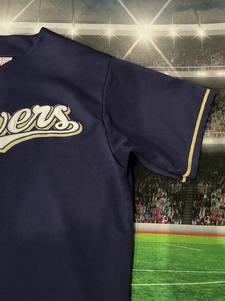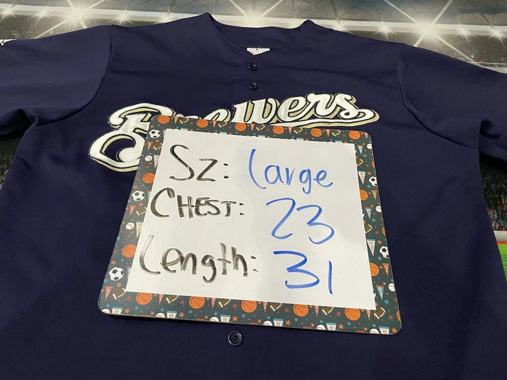 Show off your love for the Milwaukee Brewers with this officially licensed Majestic stitched baseball jersey. Made for men in size large, this blue jersey is perfect for any fan of the Major League (MLB) team. The jersey features the team's name and logo, making it a great addition to any fan's collection. Whether you're heading to the game or just want to show your support, this jersey is perfect for any occasion. It's made from high-quality materials and is sure to last for years to come. Get yours today and show your love for the Milwaukee Brewers!
