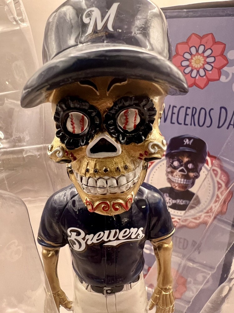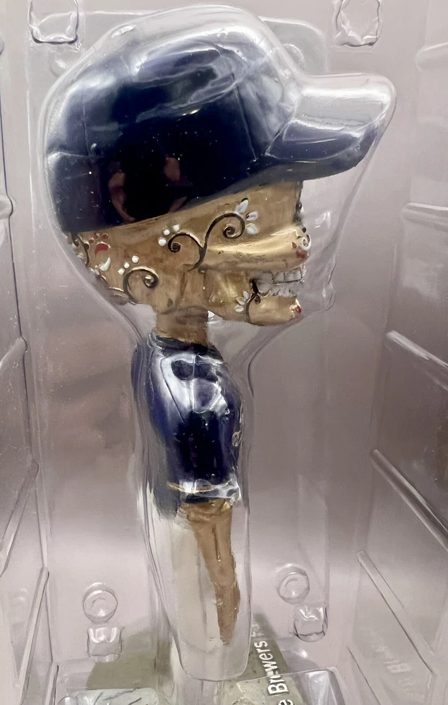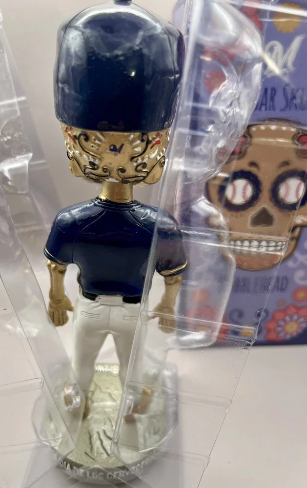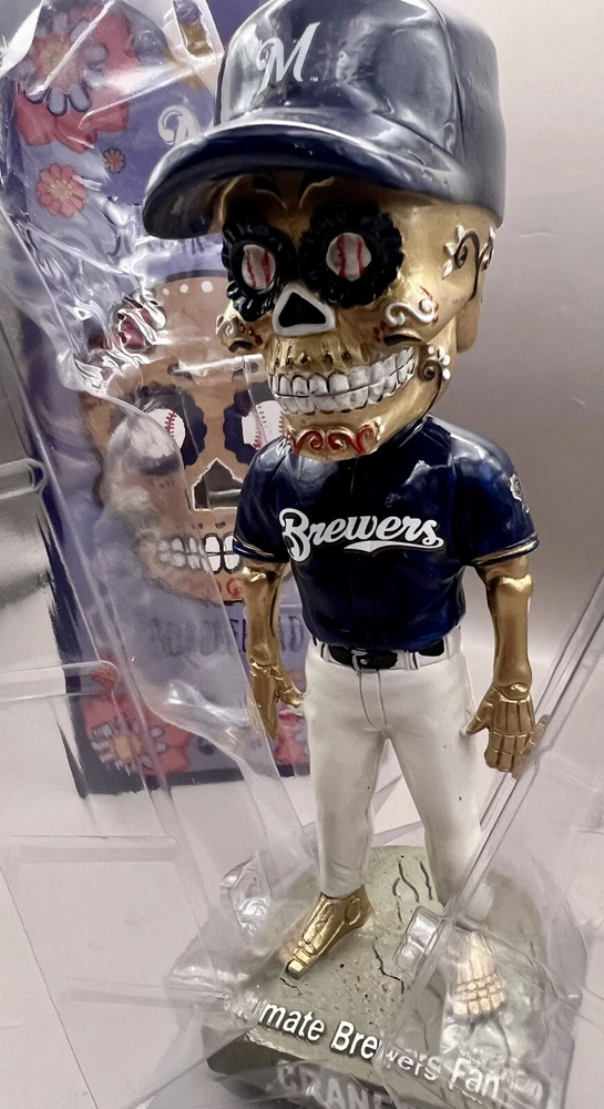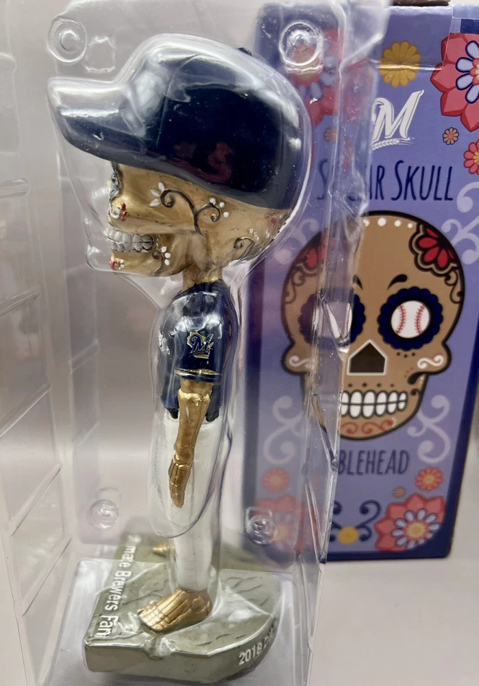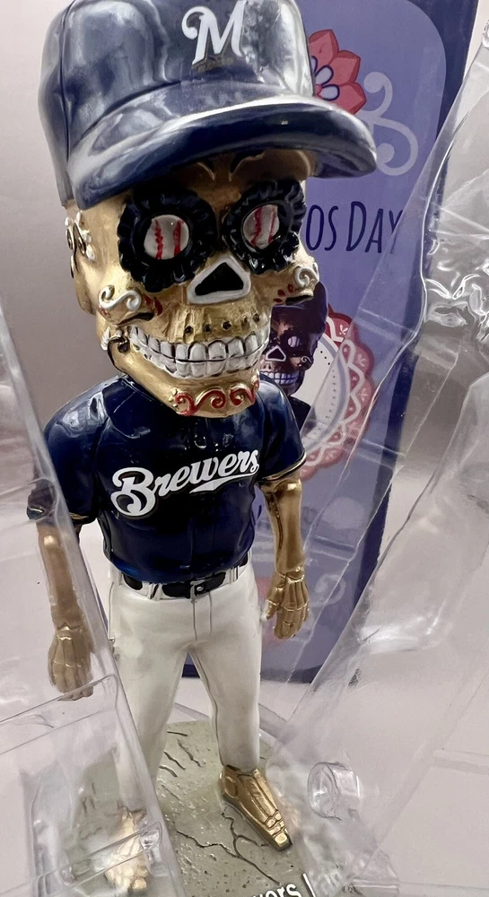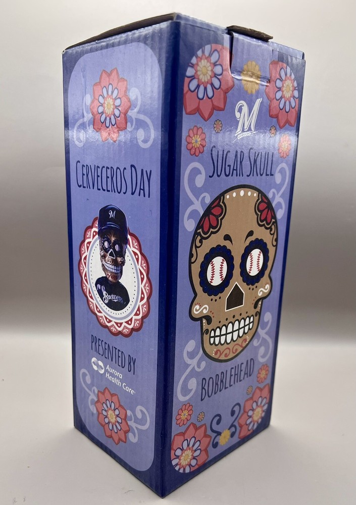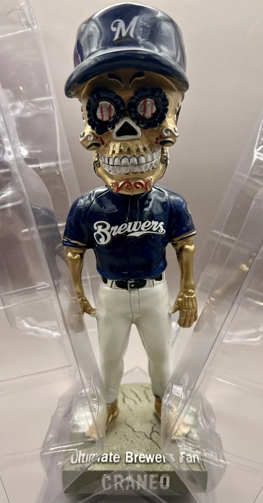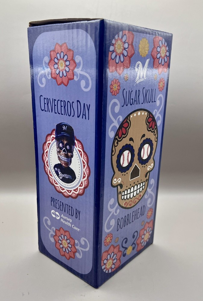 The Milwaukee Brewers Sugar Skull Bobblehead "Craneo" is a special and limited edition bobblehead featuring a unique Sugar Skull character designed by artist CRANEO. This exclusive item was released in 2018 as part of the MLB franchise and is packaged in its original packaging. The bobblehead is standard in size and multicolored, making it a standout collectible for fans of baseball and unique merchandise.